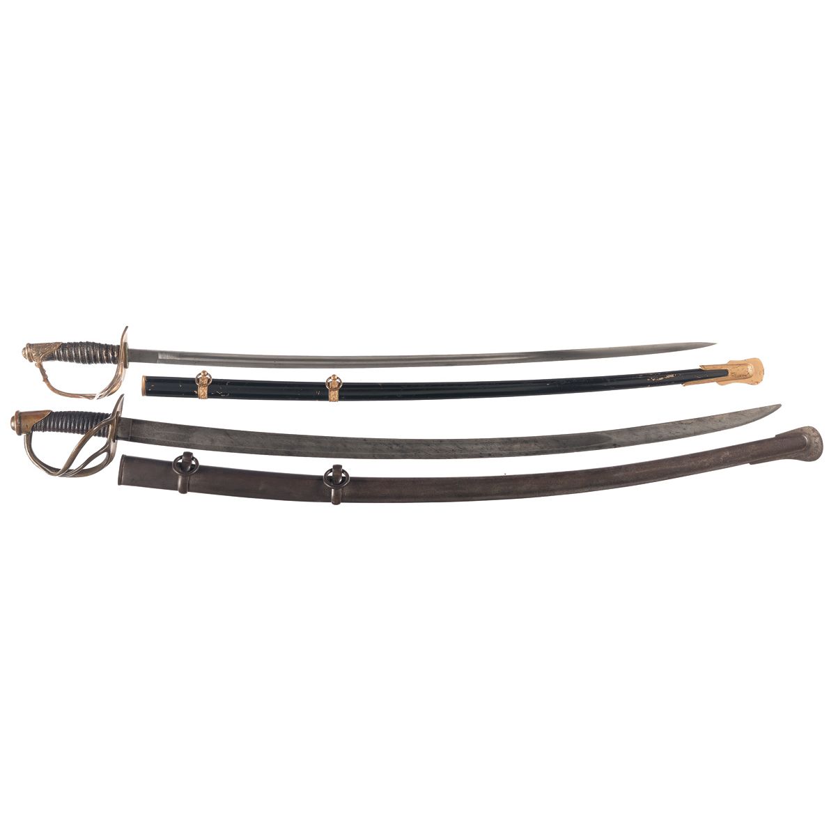 1) Non-Regulation model 1872 style officer's sword worn, 31 3/4" unmarked blade, brass guard, wire wrapped grip and black enamel . 2) U.S. Ames Model 1840 heavy Cavalry saber, 35 3/4" blade dated "1849", leather grip, metal sheath. Good