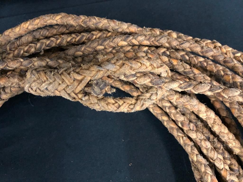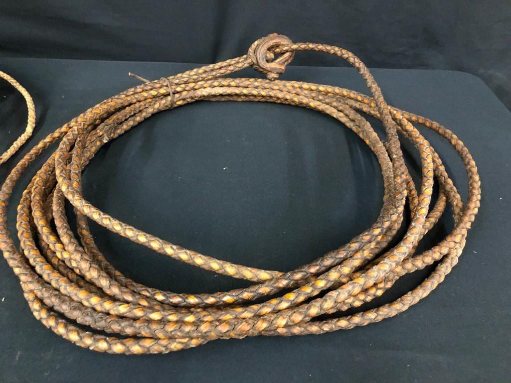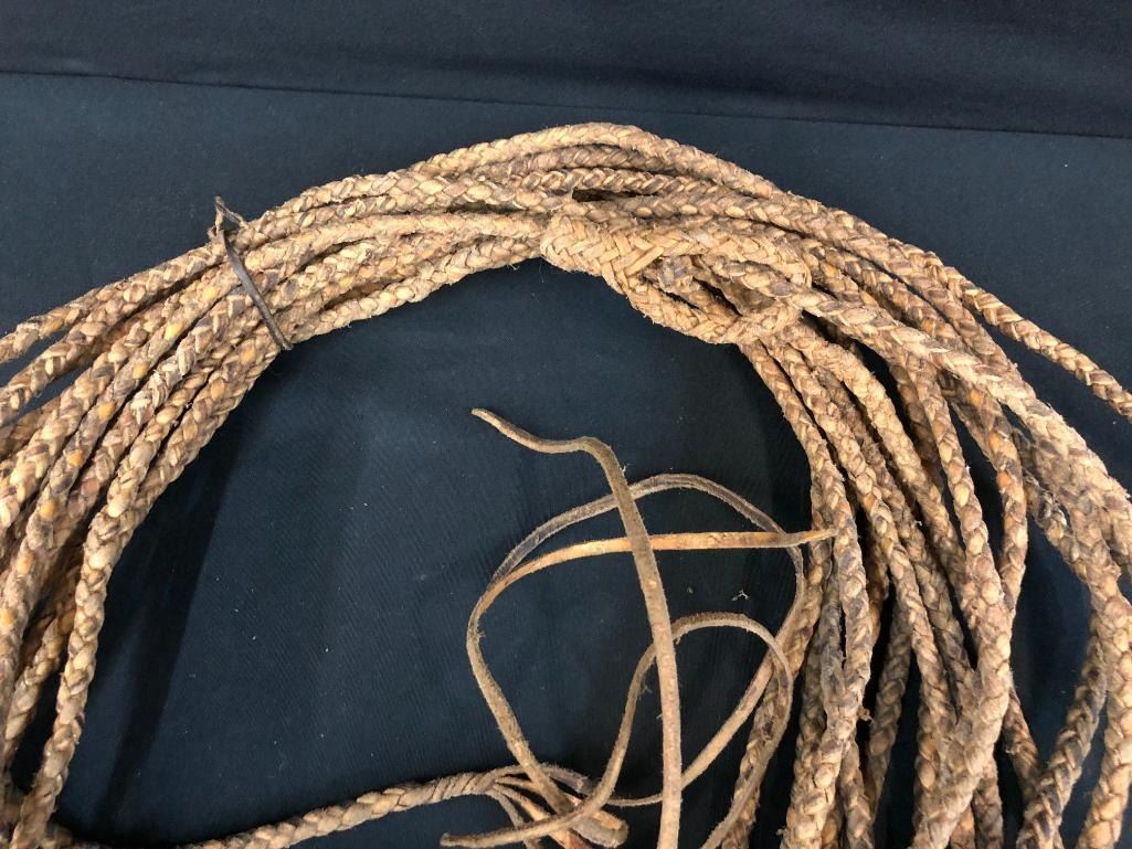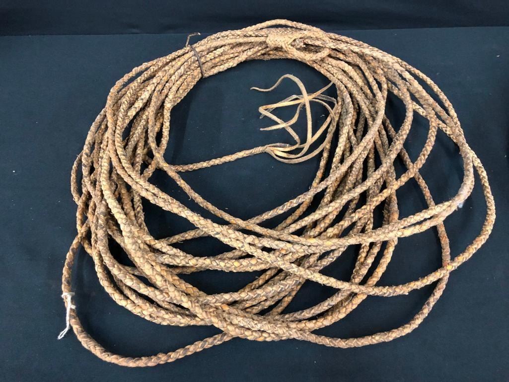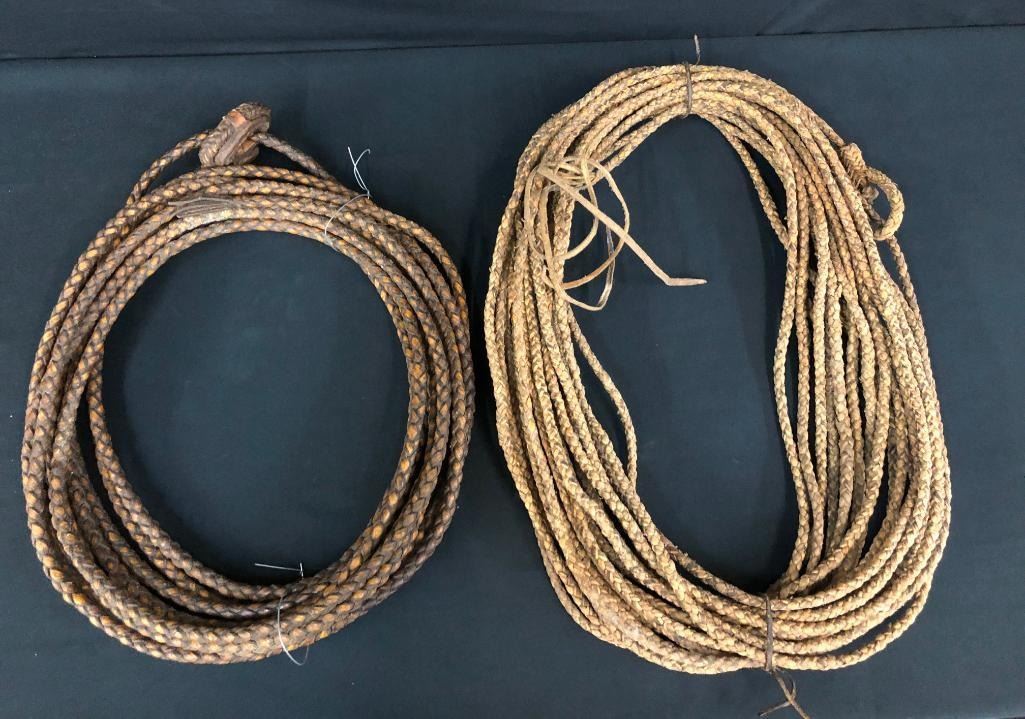 Included for sale in this lot are two old rawhide reatas. Both are four-strand, hand-braided reatas. One is a whopping 70 ft. long! They have been well used. MAKER: Unmarked. APPROX AGE: Vintage. SIZE: Approx. 70 feet - 4 strand. Approx 30 feet - 4 strand. CONDITION: Fair for their age, wear expected. Please look closely at the pictures as they are an important part of our description and are hereby incorporated into the description, specifically with regards to condition. SHIPPING: There will be a $10 handling / packaging fee for shipping this lot. The actual cost of postage will be added on top of that. BUY IT NOW: If you would like to buy this item now, without waiting for the auction day to bid on it, we do offer this option (which is available up to 48 hours before the actual auction starts). The “Buy it Now†price is the high estimate of this lot (plus applicable fees and the Buyer's premium is discounted to 10% when using the Buy it Now option). If you would like to exercise this option, you must contact us by email (or phone as long as you talk to someone live). Reference this lot number and your intention to "Buy it Now."