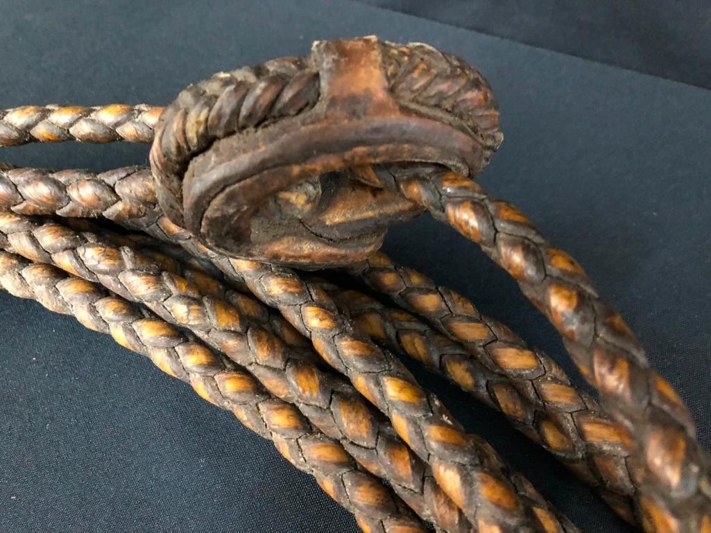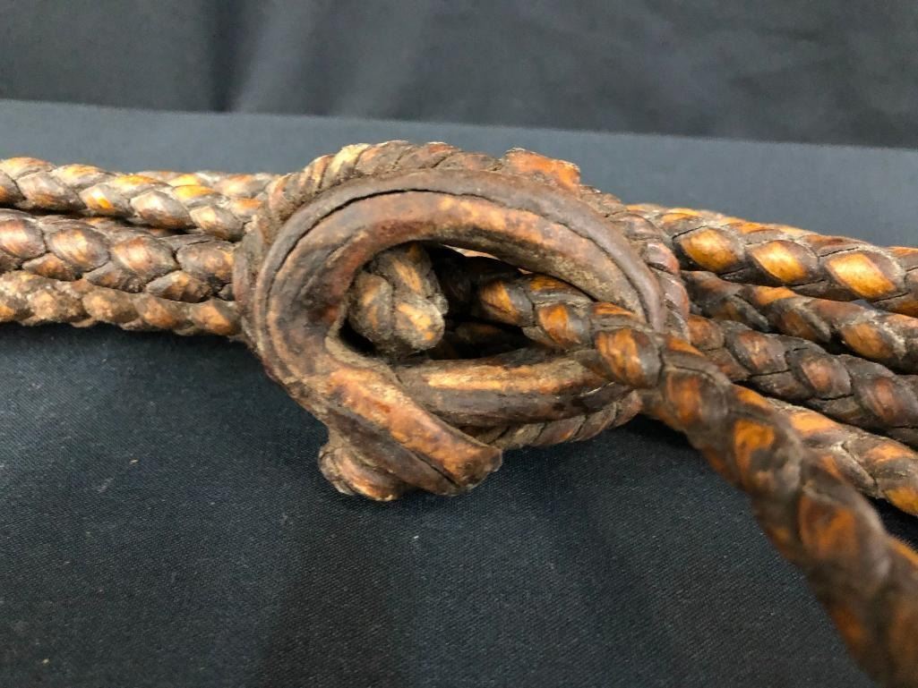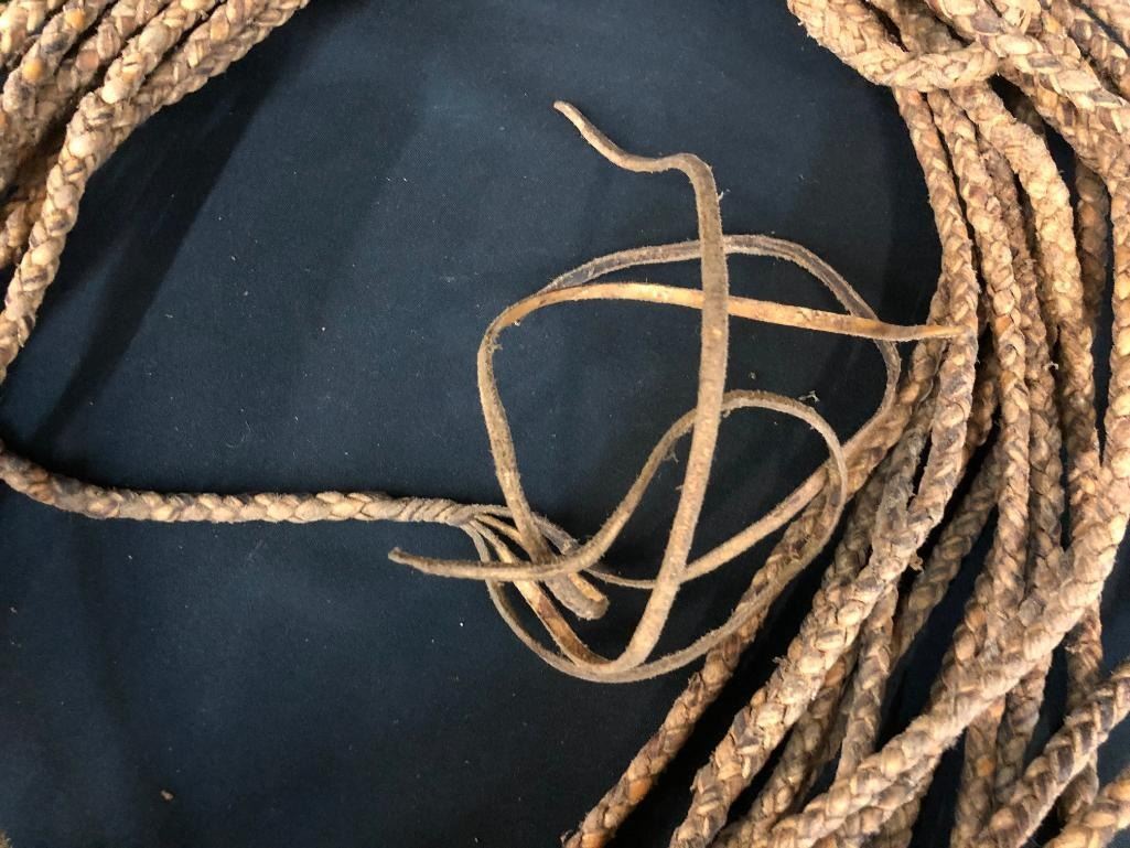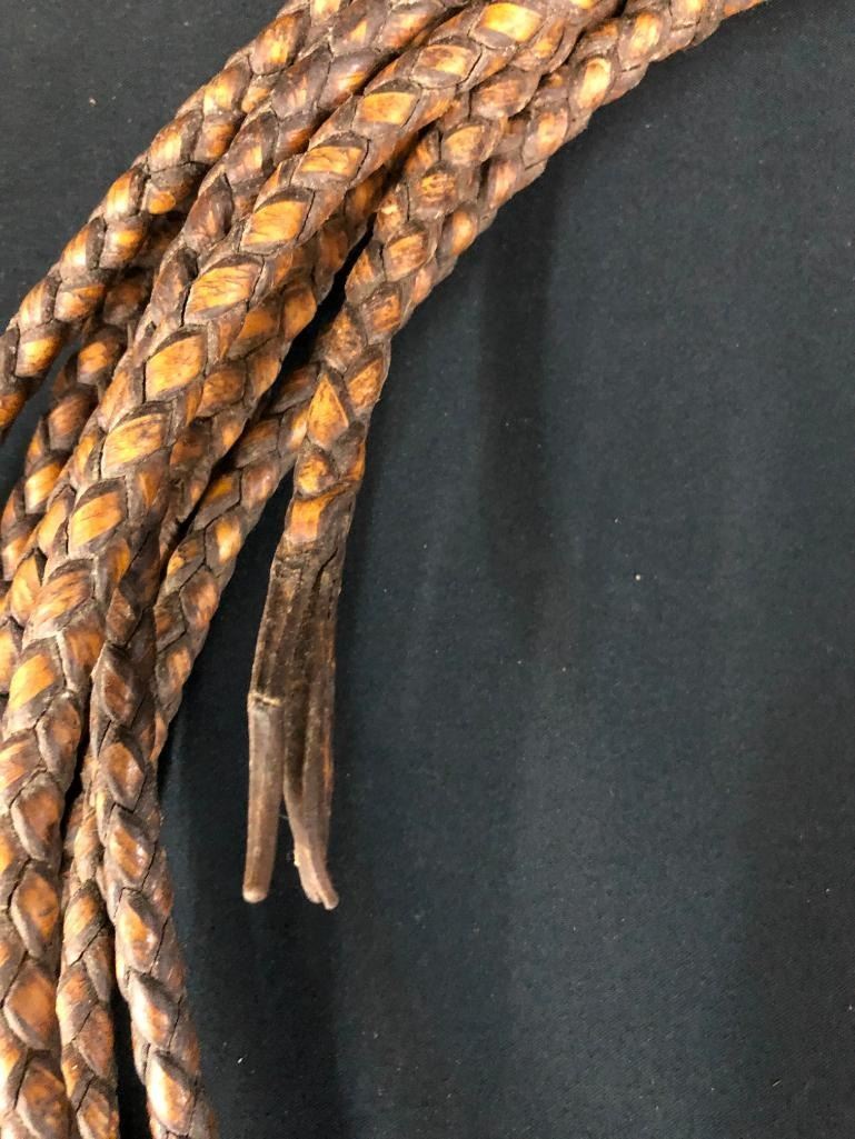 Included for sale in this lot are two old rawhide reatas. Both are four-strand, hand-braided reatas. One is a whopping 70 ft. long! They have been well used. MAKER: Unmarked. APPROX AGE: Vintage. SIZE: Approx. 70 feet - 4 strand. Approx 30 feet - 4 strand. CONDITION: Fair for their age, wear expected. Please look closely at the pictures as they are an important part of our description and are hereby incorporated into the description, specifically with regards to condition. SHIPPING: There will be a $10 handling / packaging fee for shipping this lot. The actual cost of postage will be added on top of that. BUY IT NOW: If you would like to buy this item now, without waiting for the auction day to bid on it, we do offer this option (which is available up to 48 hours before the actual auction starts). The “Buy it Now†price is the high estimate of this lot (plus applicable fees and the Buyer's premium is discounted to 10% when using the Buy it Now option). If you would like to exercise this option, you must contact us by email (or phone as long as you talk to someone live). Reference this lot number and your intention to "Buy it Now."