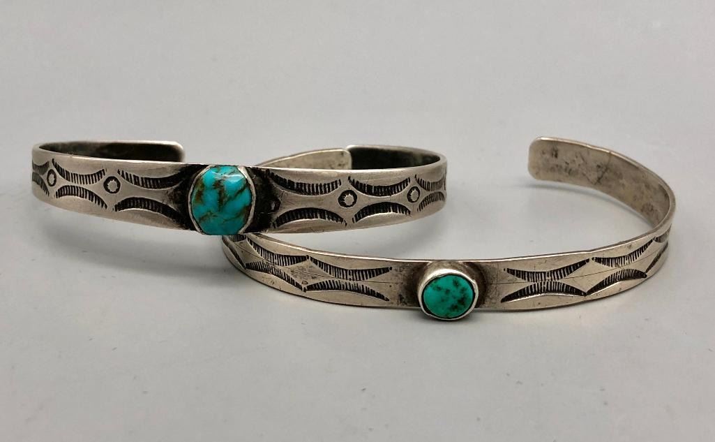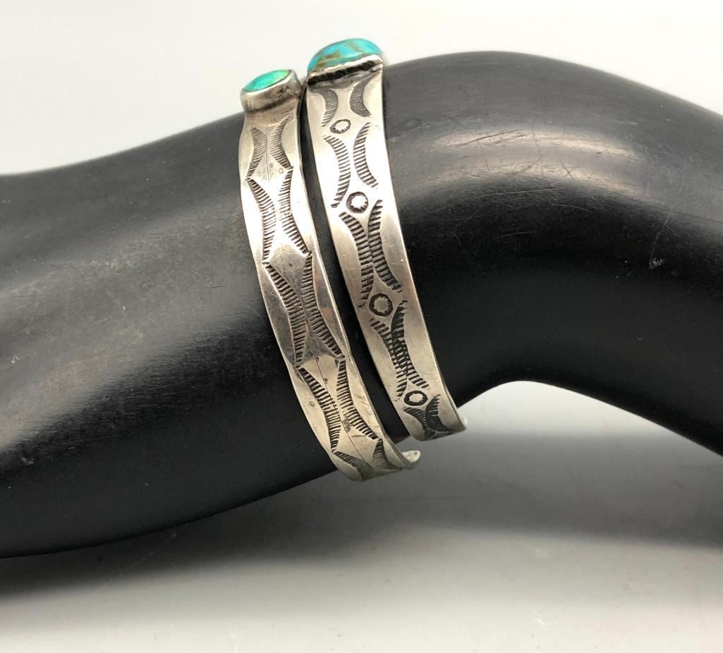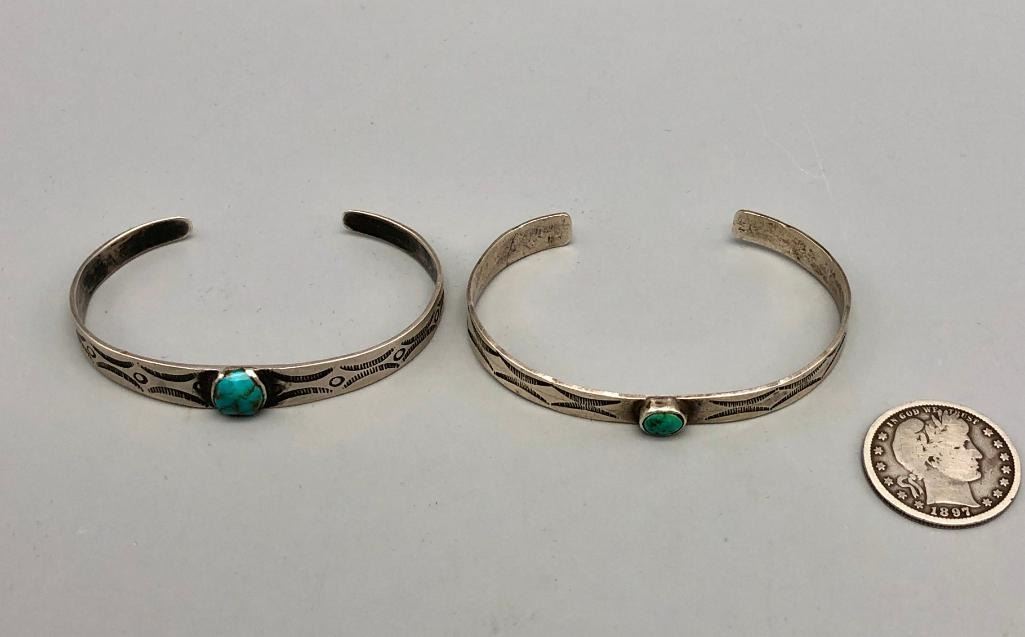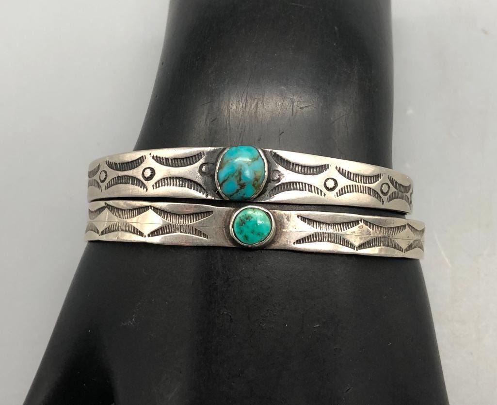 For sale in this lot are two older handmade turquoise bracelets. These are beautiful bracelets with similar stamping. Each are set with different colored turquoise stones and made from sterling silver. MAKER: Unmarked. APPROX AGE: Circa 1940s. SIZE: Inside circumference measures 5-1/4 inches long. Opening is an additional 1 inch, fitting a 6-1/4 inch wrist. Widths are 1/4 inches and 3/8 inches. Weighs 22.5 grams. CONDITION: Good for their age, normal wear expected. Please look closely at the pictures as they are an important part of our description and are hereby incorporated into the description, specifically with regards to condition. SHIPPING: There will be a $5 handling / packaging fee for shipping this lot. The actual cost of postage will be added on top of that. BUY IT NOW: If you would like to buy this item now, without waiting for the auction day to bid on it, we do offer this option (which is available up to 48 hours before the actual auction starts). The “Buy it Now†price is the high estimate of this lot (plus applicable fees and the Buyer's premium is discounted to 10% when using the Buy it Now option). If you would like to exercise this option, you must contact us by email (or phone as long as you talk to someone live). Reference this lot number and your intention to "Buy it Now."