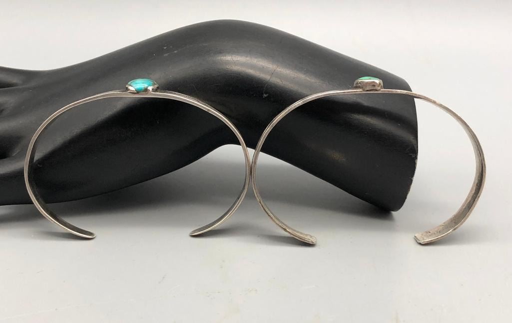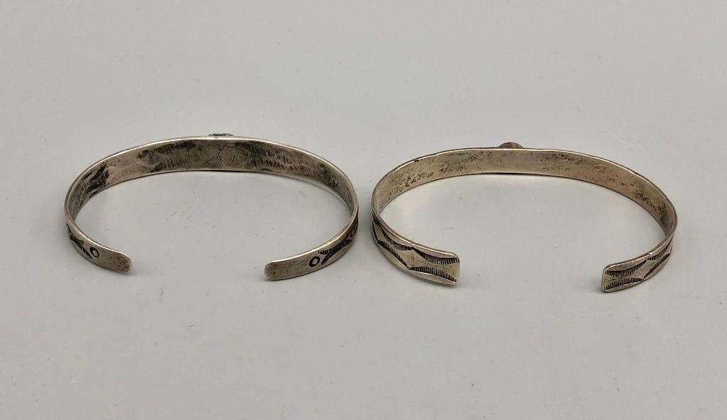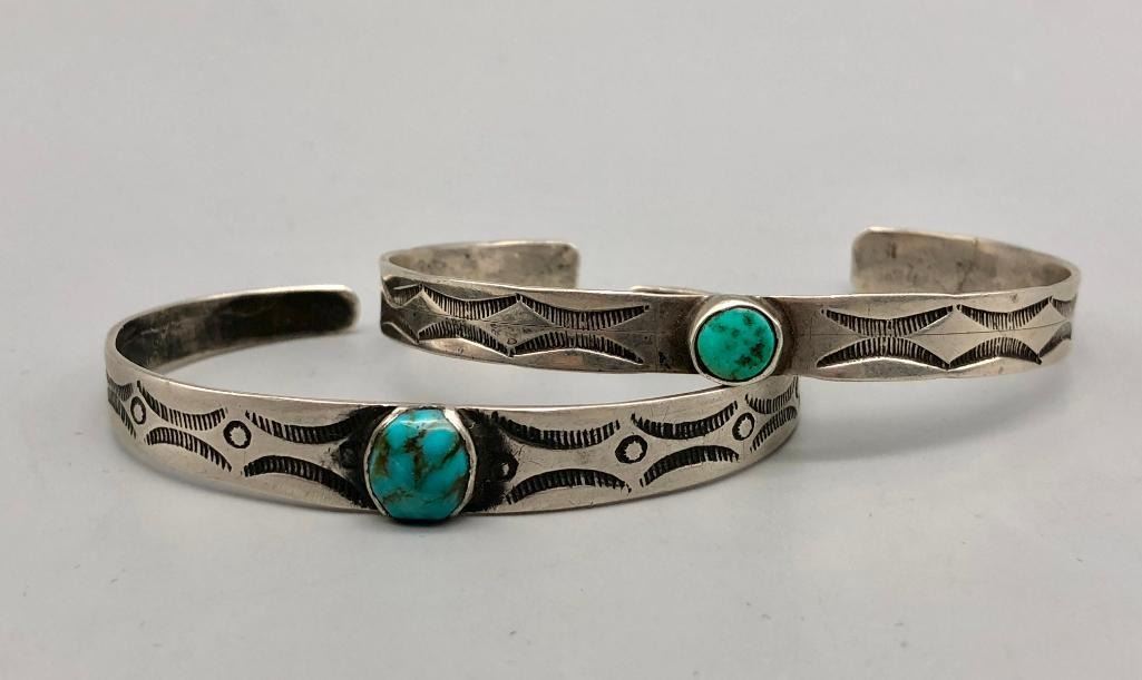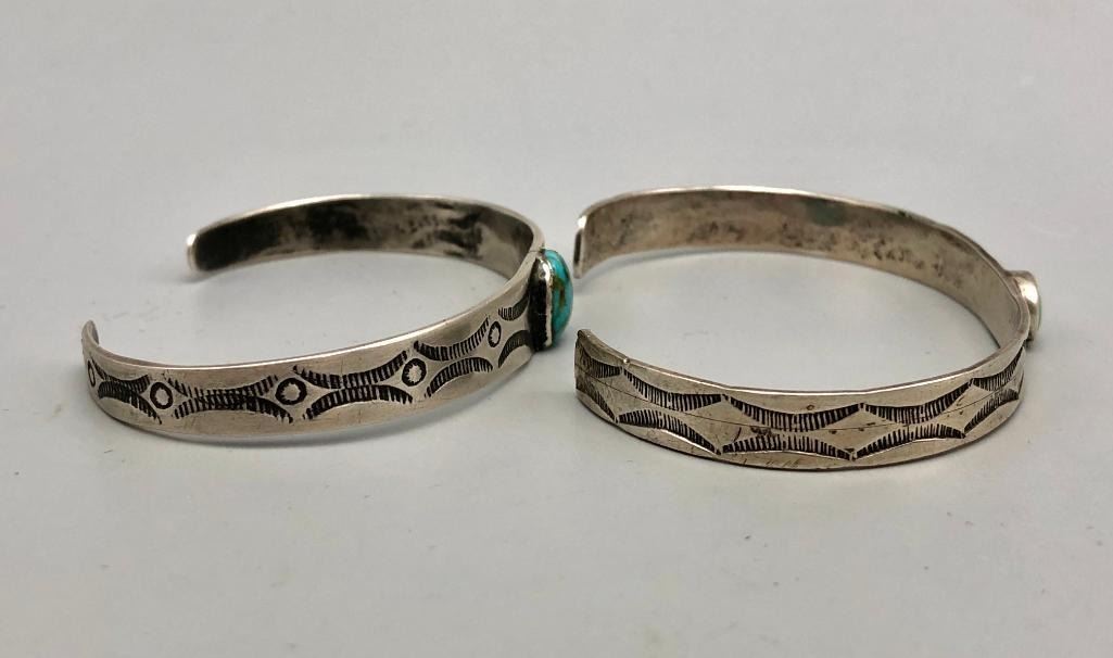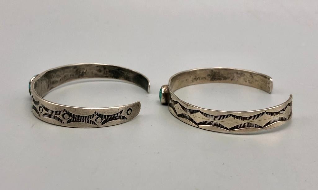 For sale in this lot are two older handmade turquoise bracelets. These are beautiful bracelets with similar stamping. Each are set with different colored turquoise stones and made from sterling silver. MAKER: Unmarked. APPROX AGE: Circa 1940s. SIZE: Inside circumference measures 5-1/4 inches long. Opening is an additional 1 inch, fitting a 6-1/4 inch wrist. Widths are 1/4 inches and 3/8 inches. Weighs 22.5 grams. CONDITION: Good for their age, normal wear expected. Please look closely at the pictures as they are an important part of our description and are hereby incorporated into the description, specifically with regards to condition. SHIPPING: There will be a $5 handling / packaging fee for shipping this lot. The actual cost of postage will be added on top of that. BUY IT NOW: If you would like to buy this item now, without waiting for the auction day to bid on it, we do offer this option (which is available up to 48 hours before the actual auction starts). The “Buy it Now†price is the high estimate of this lot (plus applicable fees and the Buyer's premium is discounted to 10% when using the Buy it Now option). If you would like to exercise this option, you must contact us by email (or phone as long as you talk to someone live). Reference this lot number and your intention to "Buy it Now."