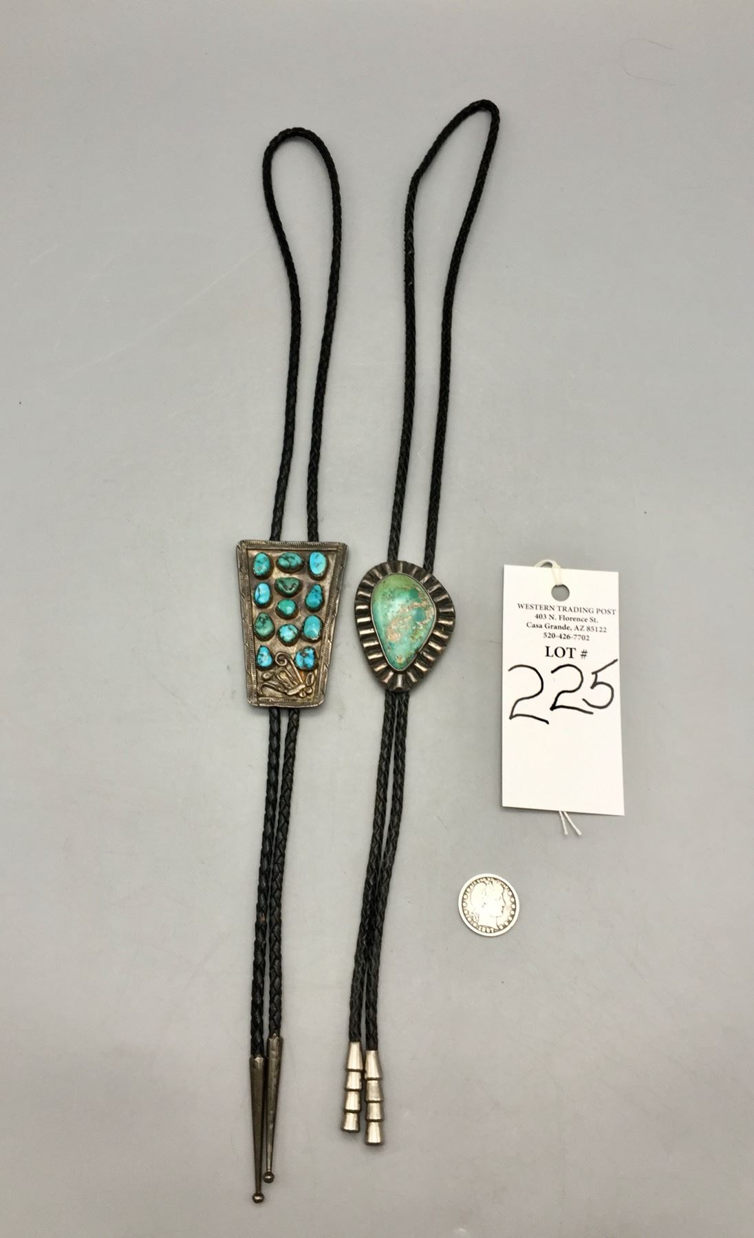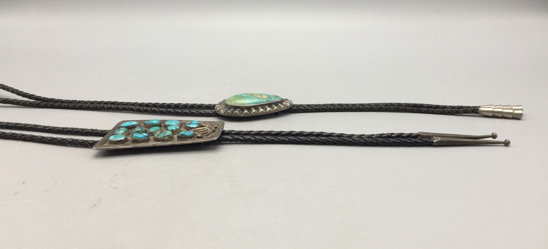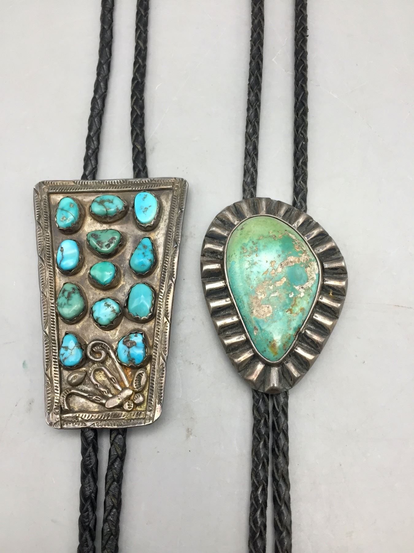 Description: Offered here in this lot is two great older bolo ties. Both are set with turquoise stones in sterling silver. Maker: Various. Approx. Age: Vintage. Size: Various. Combined weight is 115.6 grams. Condition: Good for their age, normal wear expected. Please look closely at the pictures - they are an important part of our description. Shipping: There will be a $5 handling / packaging fee for shipping this lot. The actual cost of postage will be added on top of that.