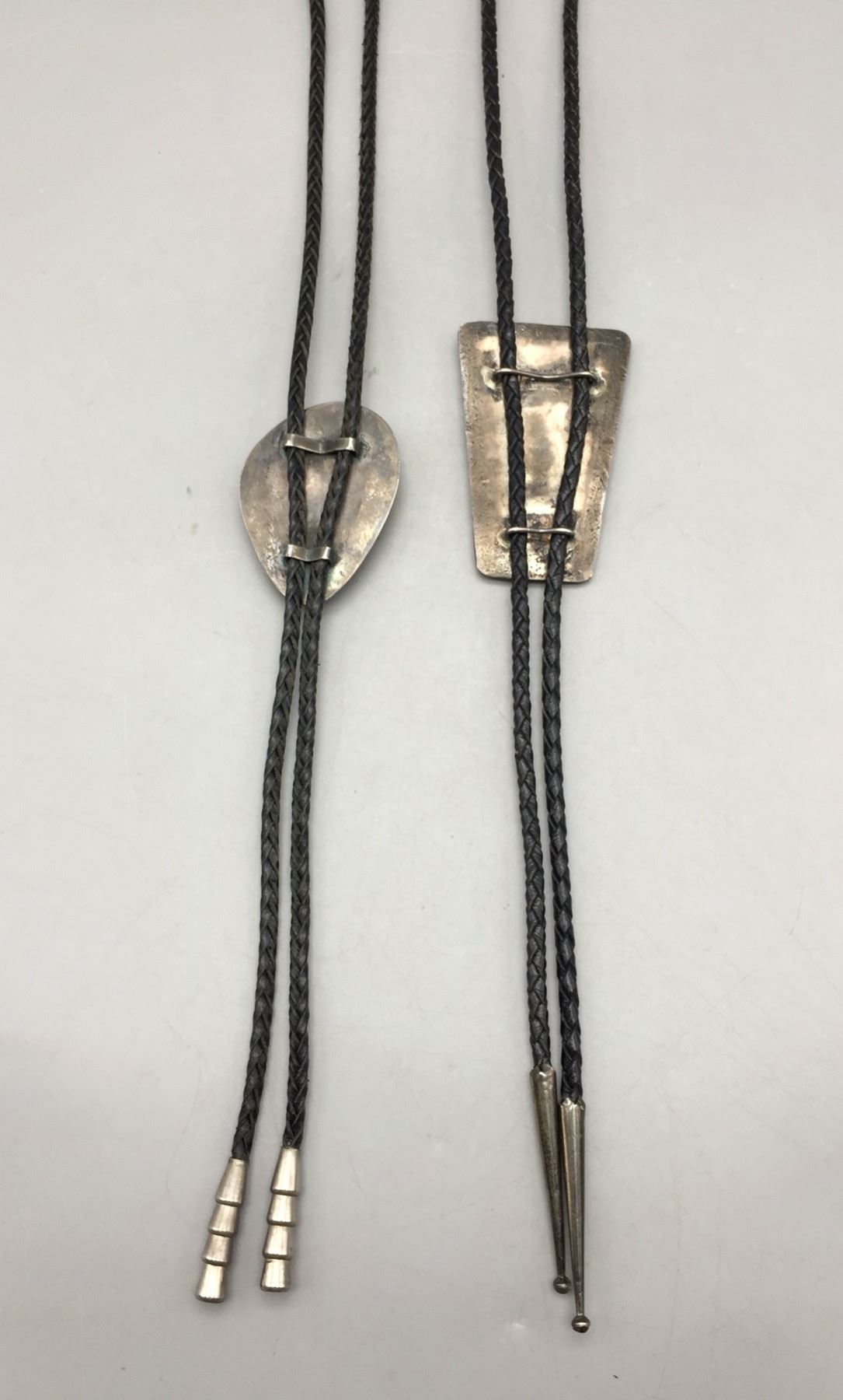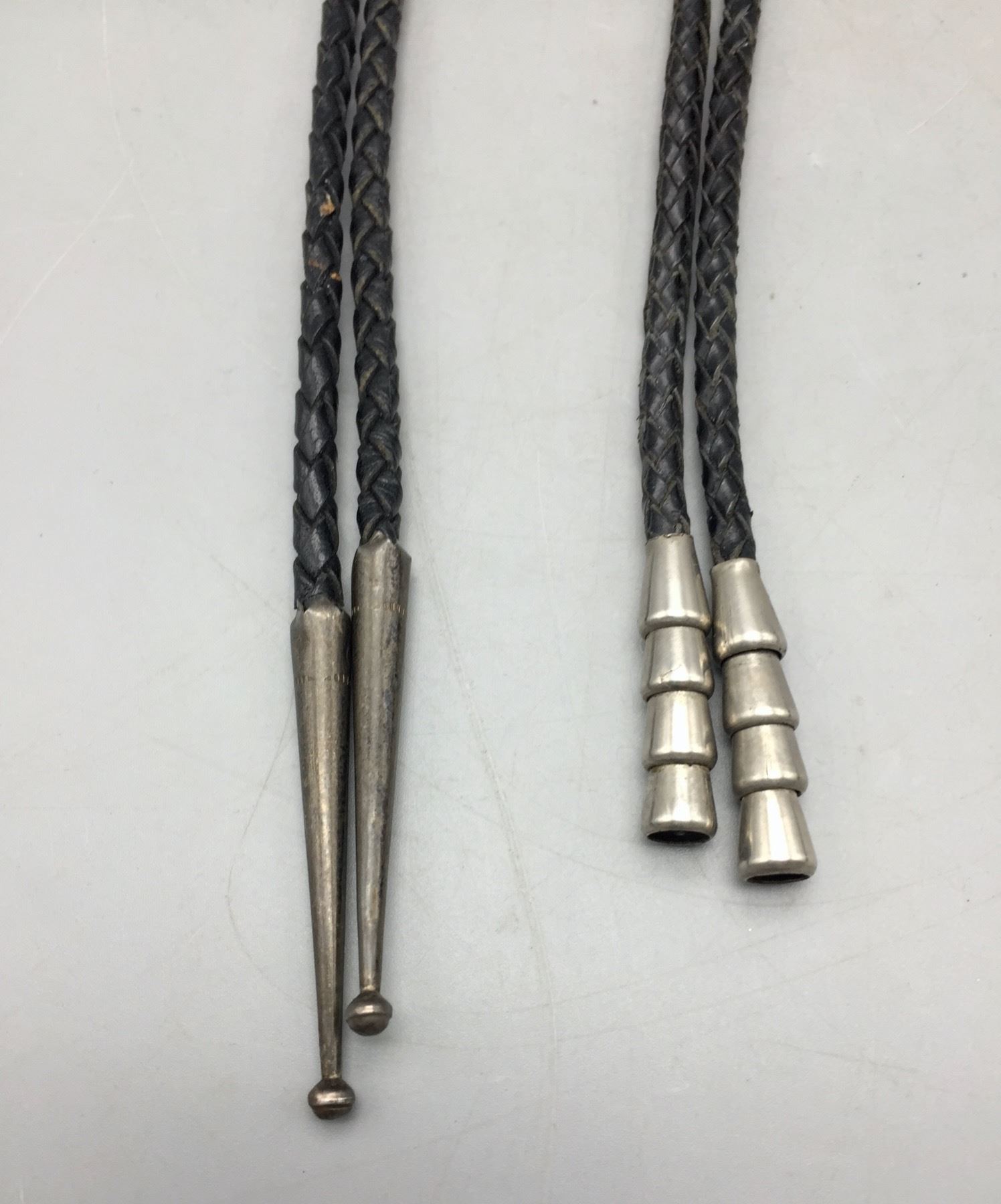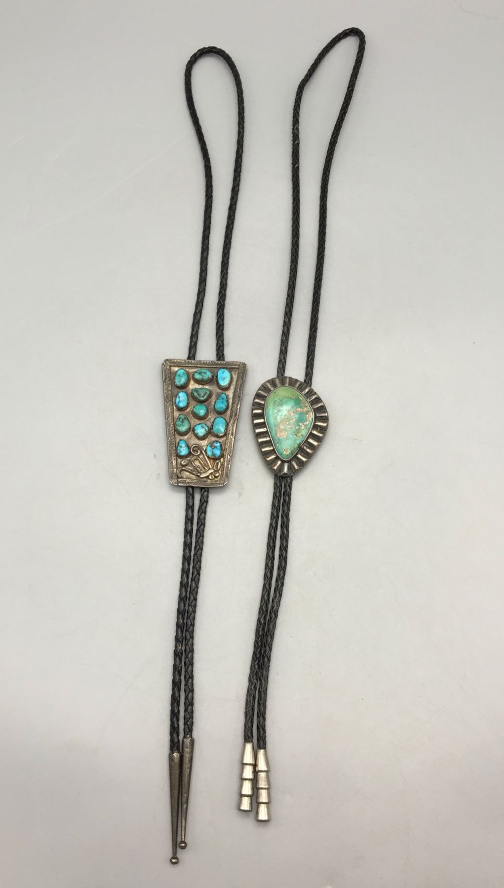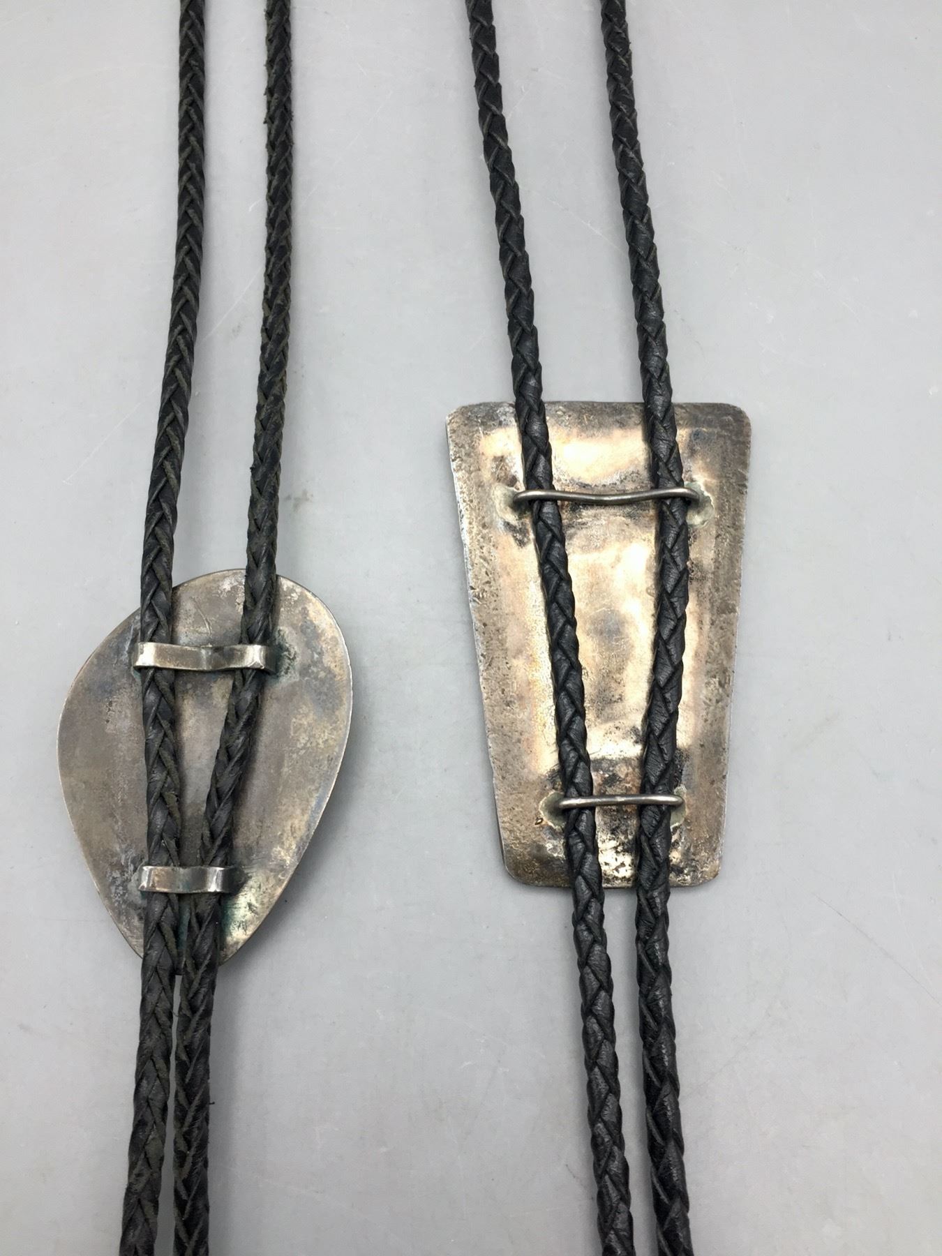Description: Offered here in this lot is two great older bolo ties. Both are set with turquoise stones in sterling silver. Maker: Various. Approx. Age: Vintage. Size: Various. Combined weight is 115.6 grams. Condition: Good for their age, normal wear expected. Please look closely at the pictures - they are an important part of our description. Shipping: There will be a $5 handling / packaging fee for shipping this lot. The actual cost of postage will be added on top of that.