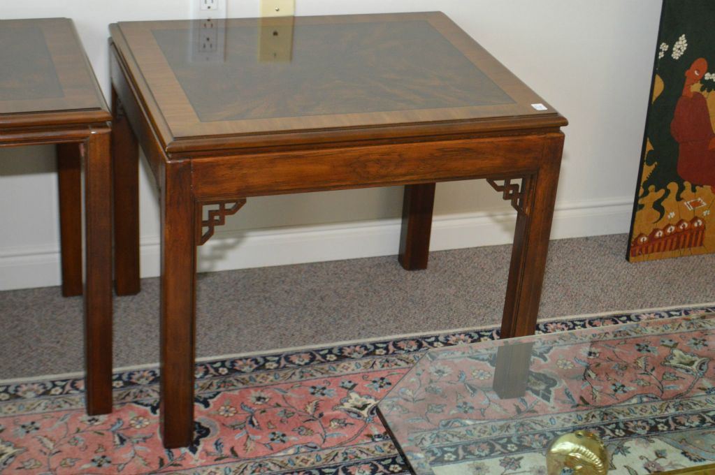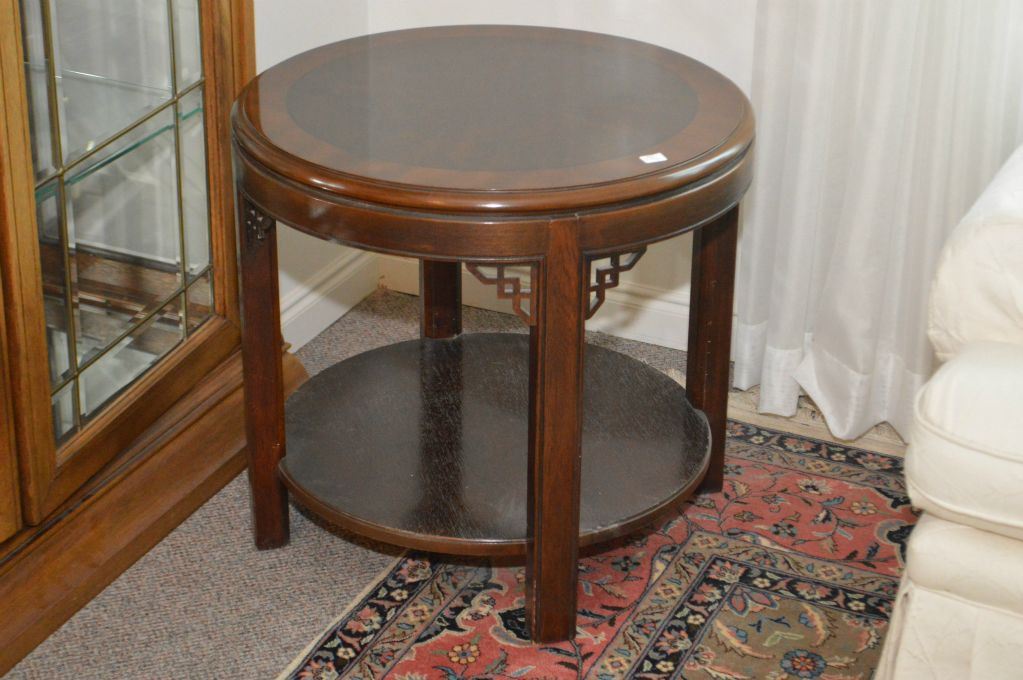Two Oriental influenced occasional tables including rectangular with wine slide and a round side table