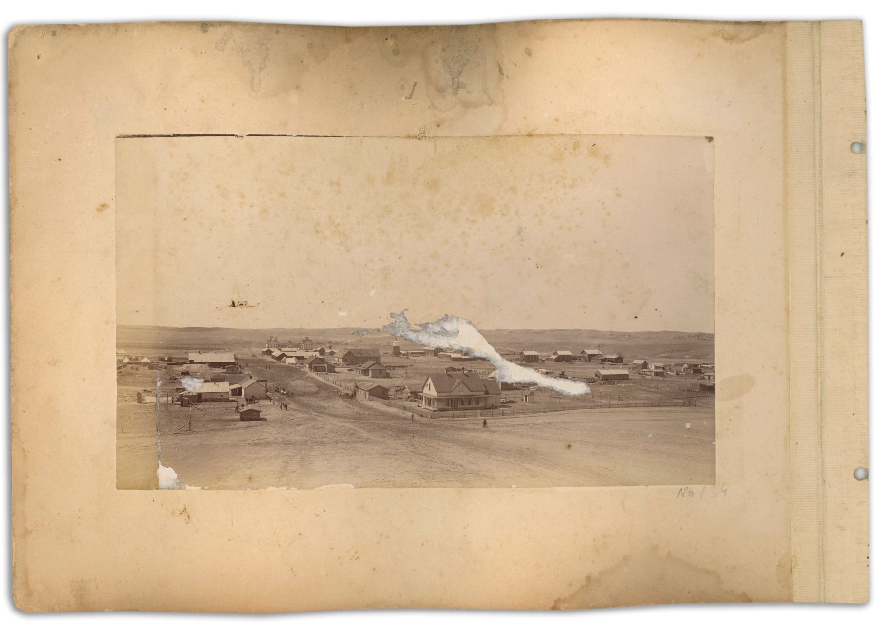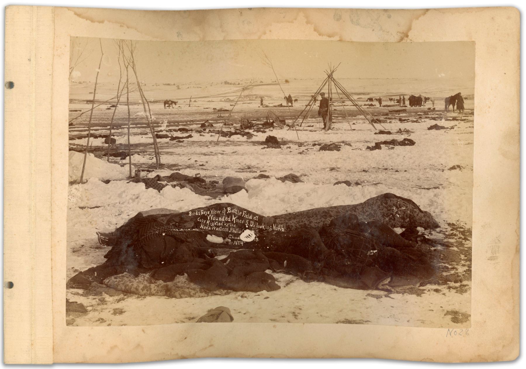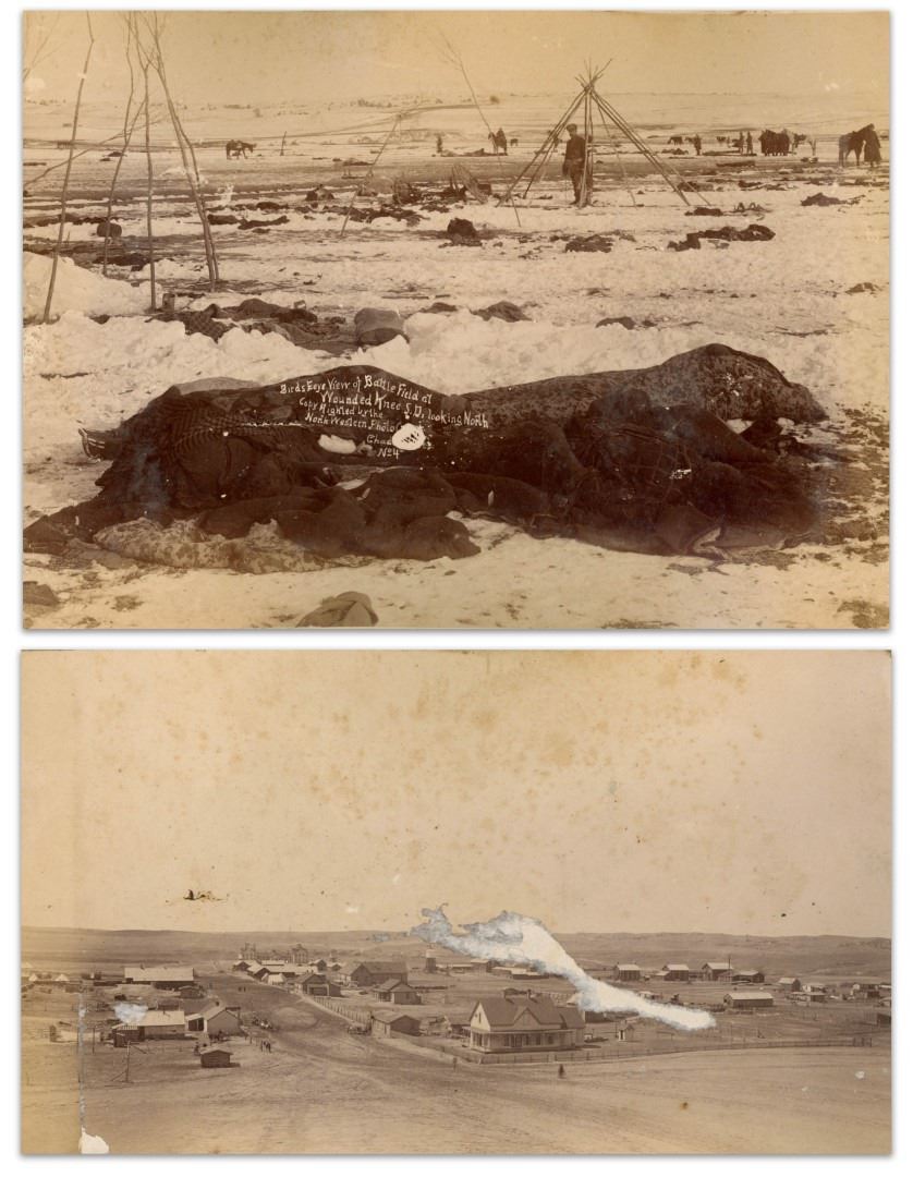 Two original albumen prints, one of which was taken New Year's Day 1891, immediately after the Wounded Knee Massacre; both images were taken by Northwestern Photo Co. of Chadron, Nebraska, whose outfit is well known for documenting the aftermath of the massacre. The larger of the photos, measuring 7.75'' x 5.75'', is the one depicting the snow-covered battlefield, with blankets covering dead Lakota Native Americans, and with a destroyed wagon in the background. Photo is published in ''Eyewitness at Wounded Knee'', which writes of it, ''The shattered wagon near the center of this view might be the one described by Peter McFarland, a government drayman present at the fight: 'The Hotchkiss guns on the hill fired into an Indian wagon...Several Indians were firing on the soldiers from behind this wagon. The shell sent into it knocked it to pieces and killed a number of warriors.''' Photograph is also controversial in that George Trager, who captured the image, printed his copyright in the negative directly on the bodies of the dead: ''Birds Eeye [sic] View of Battle Field at Wounded Knee S. Da looking North / Copy Righted by the North Western Photo Co. / Chadron, Neb. / No 4''. Very light soiling at top and some buckling, with small spot inherent in negative; very good condition. Photograph is affixed to mat, upon which the other side shows the second photograph, also published in ''Eyewitness at Wounded Knee'', showing the landscape of the Pine Ridge Agency, looking west down its main street. Photograph, likely taken later in 1891 by Clarence Moreledge of Northwestern, measures 7'' x 4''. Abrasion to center and side of photo, foxing at top and some buckling. Overall good condition. Mat, to which photos are affixed, measures 10'' x 7''.