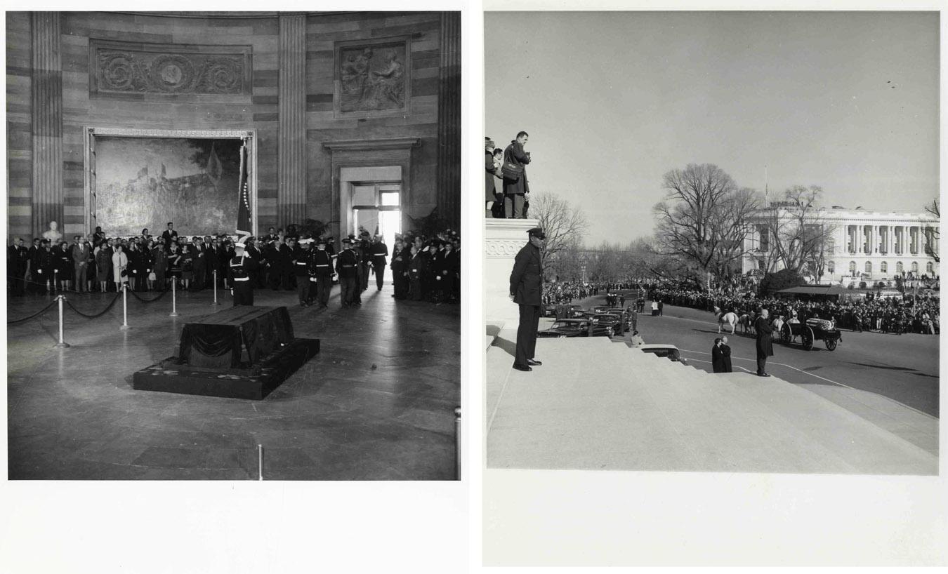 Two unpublished photographs of President John F. Kennedy's funeral from the private collection of JFK's long-time secretary Evelyn Lincoln. Images show Kennedy's funeral procession and the Kennedy family gathered at the Capitol. Both measure 8” x 10”. Excellent condition.
