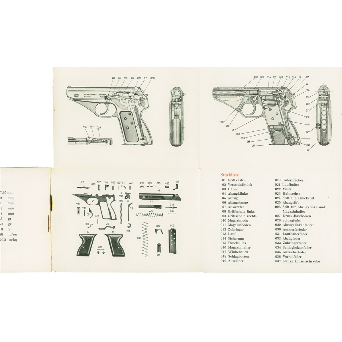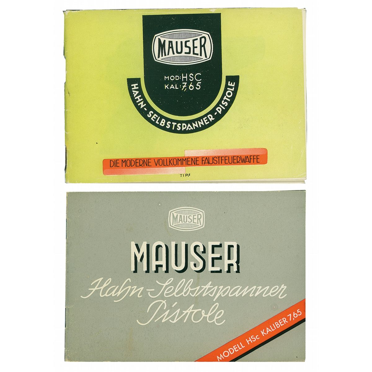 1) Mauser HSc pistol manual, green cover, 36 pages with a fold out parts diagram. 2) Mauser HSc pistol manual (Wa 1005. 75 111 42 O/0977), gray cover, 30 pages with fold out parts diagram.