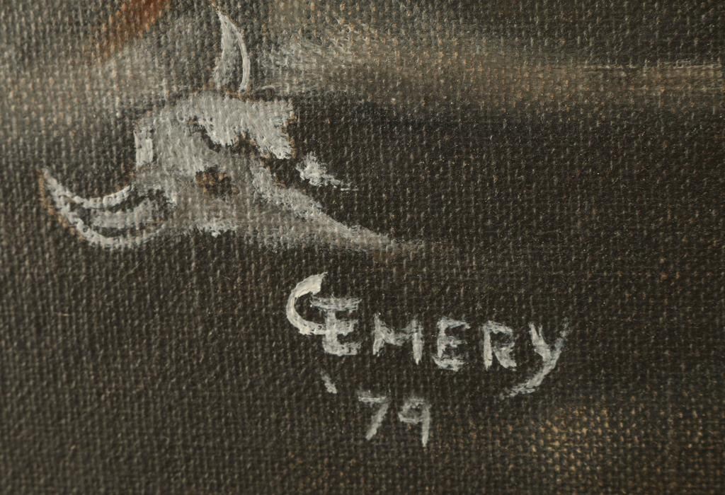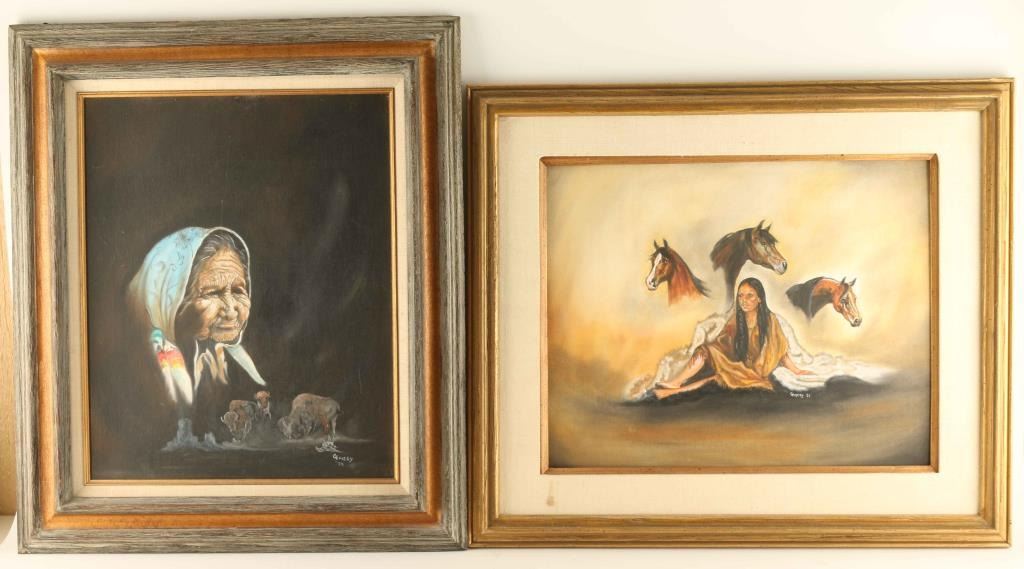 Both by Gail Emery "Forever Gone" hand signed lower right measures 18" x 15 1/2"depicting an Indian elder with buffalo. "Cost of Plenty" depicts an Indian maiden and three horse heads measures 19" x 15 1/2"