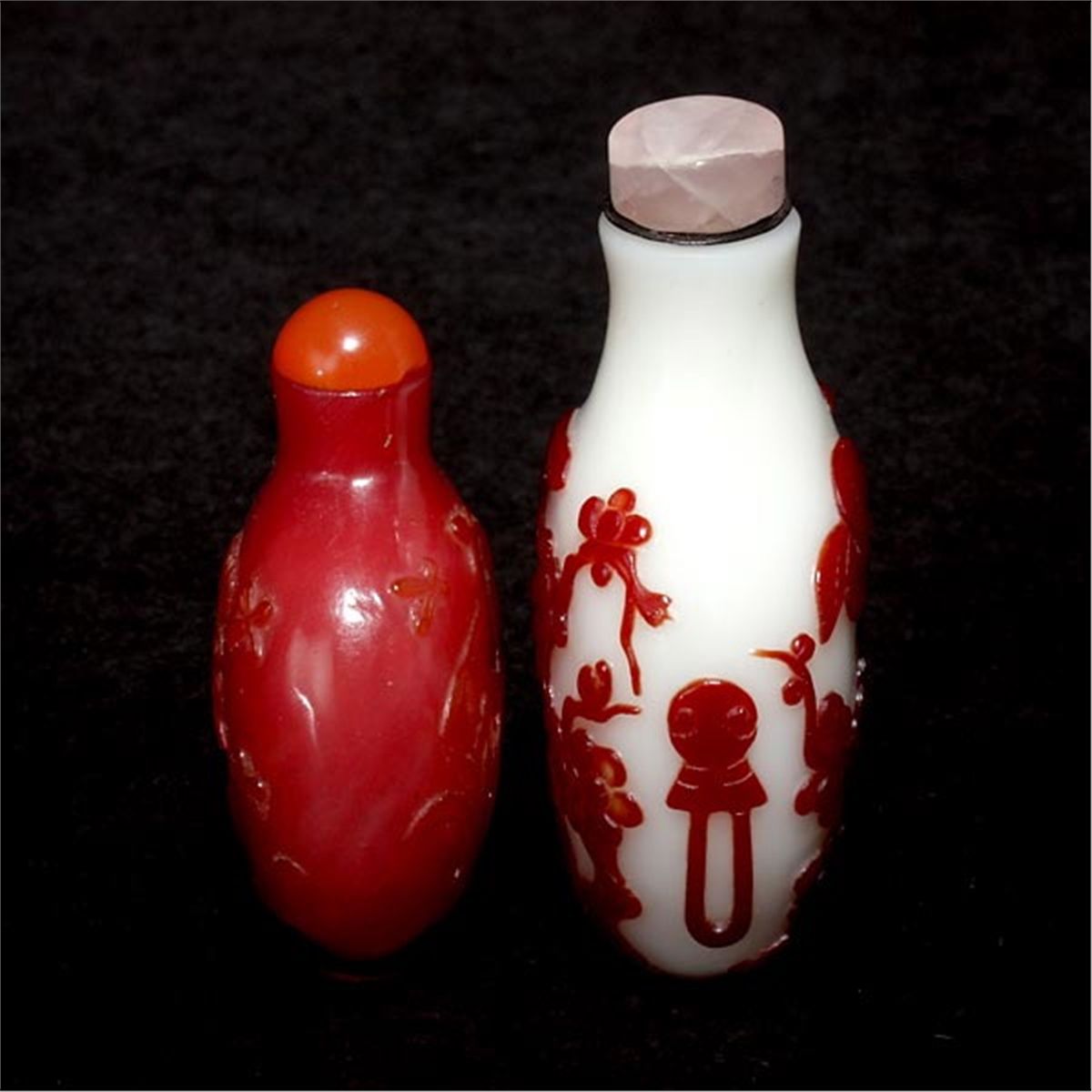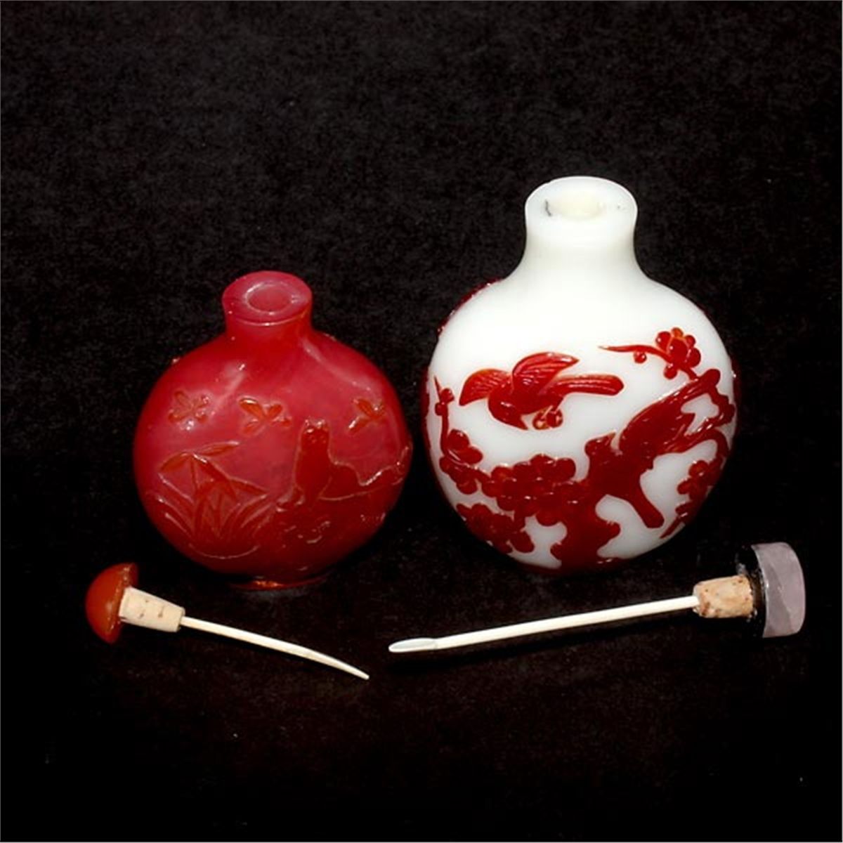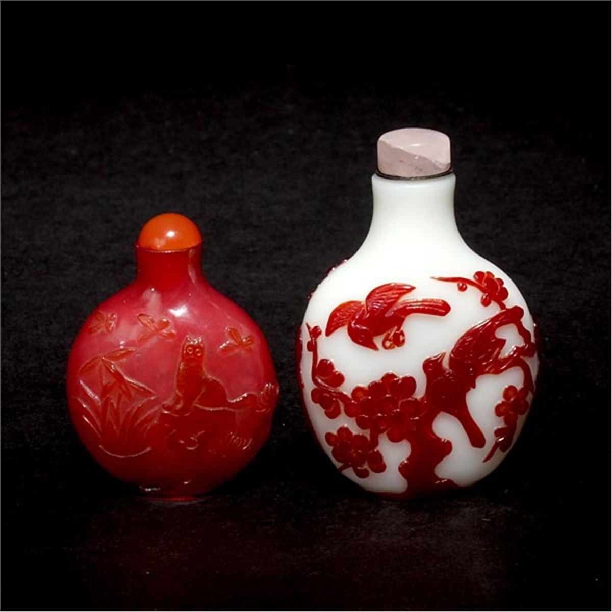 Two Overlay-Decorated Glass Snuff Bottles, The red overlay bottle decorated with cats, butterflies and flowering plants, with glass stopper; the other red with birds and prunus, with pink quartz stopper. Height of Larger Bottle: 3 inches (7.6 cm) [Minute chips. This condition report states major condition issues only.]