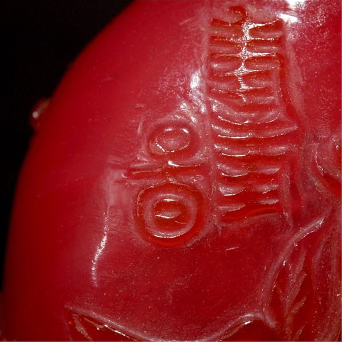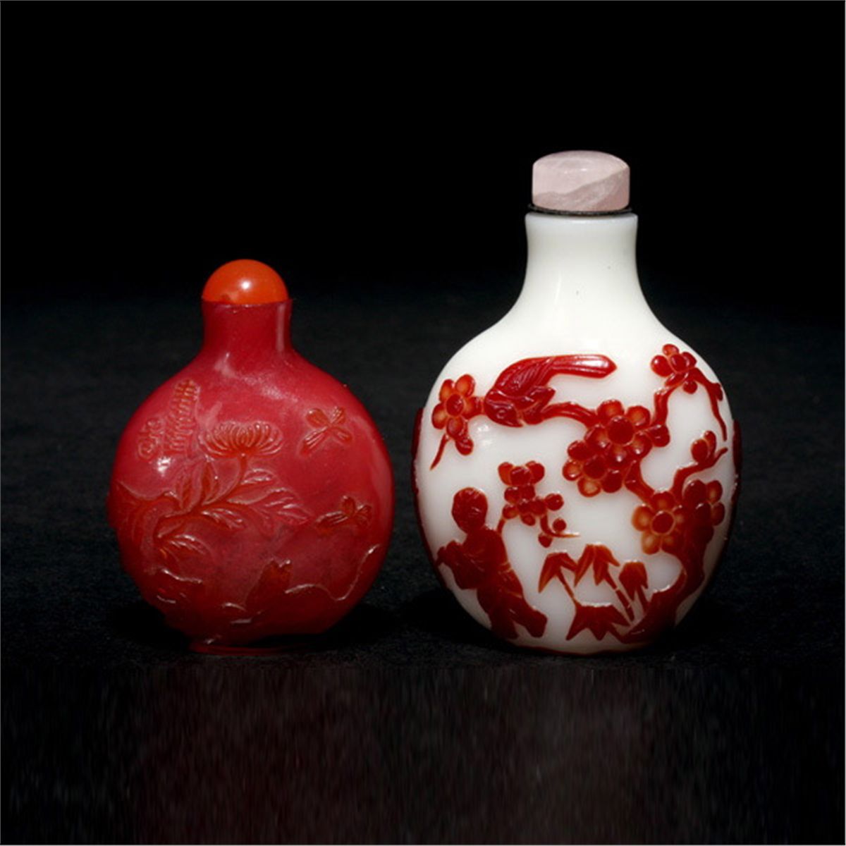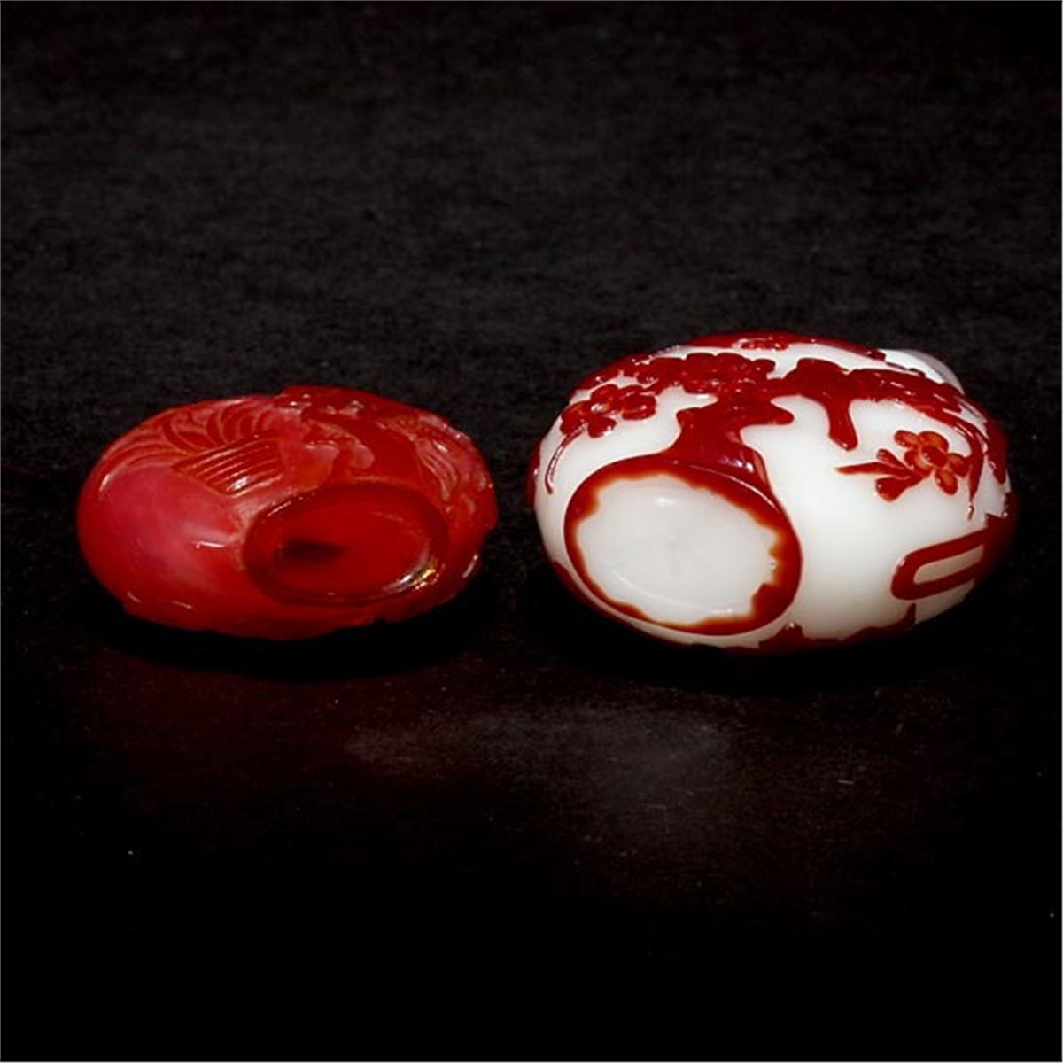 Two Overlay-Decorated Glass Snuff Bottles, The red overlay bottle decorated with cats, butterflies and flowering plants, with glass stopper; the other red with birds and prunus, with pink quartz stopper. Height of Larger Bottle: 3 inches (7.6 cm) [Minute chips. This condition report states major condition issues only.]
