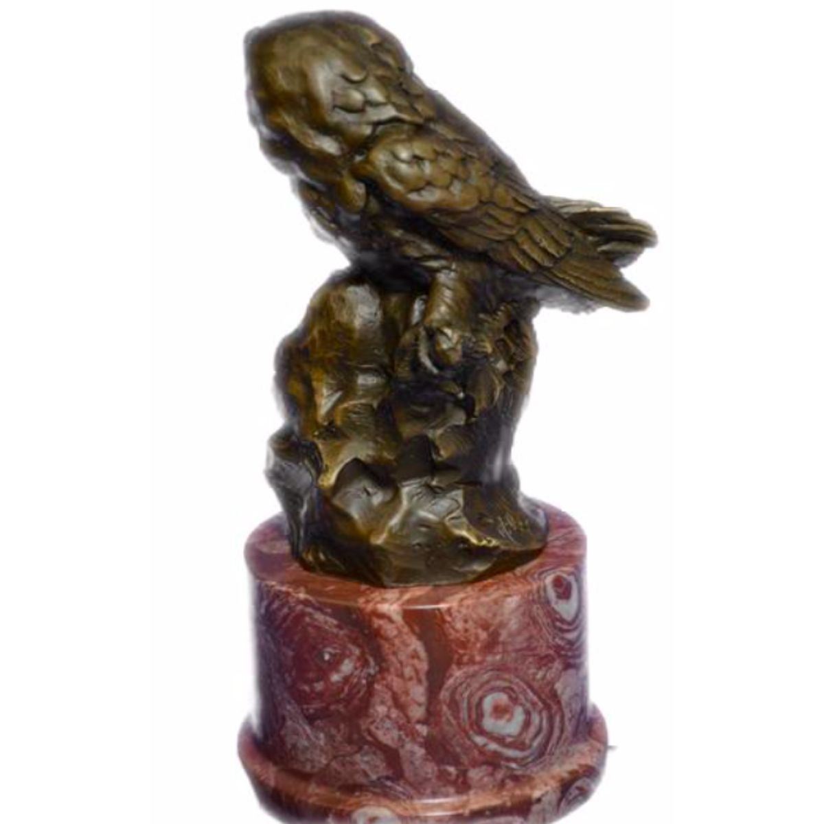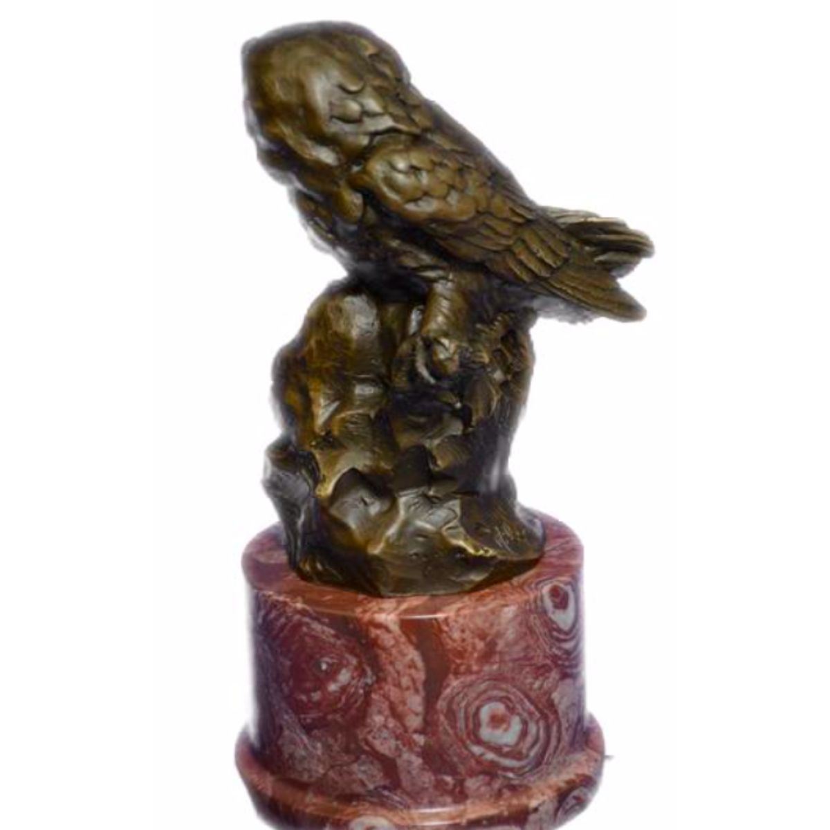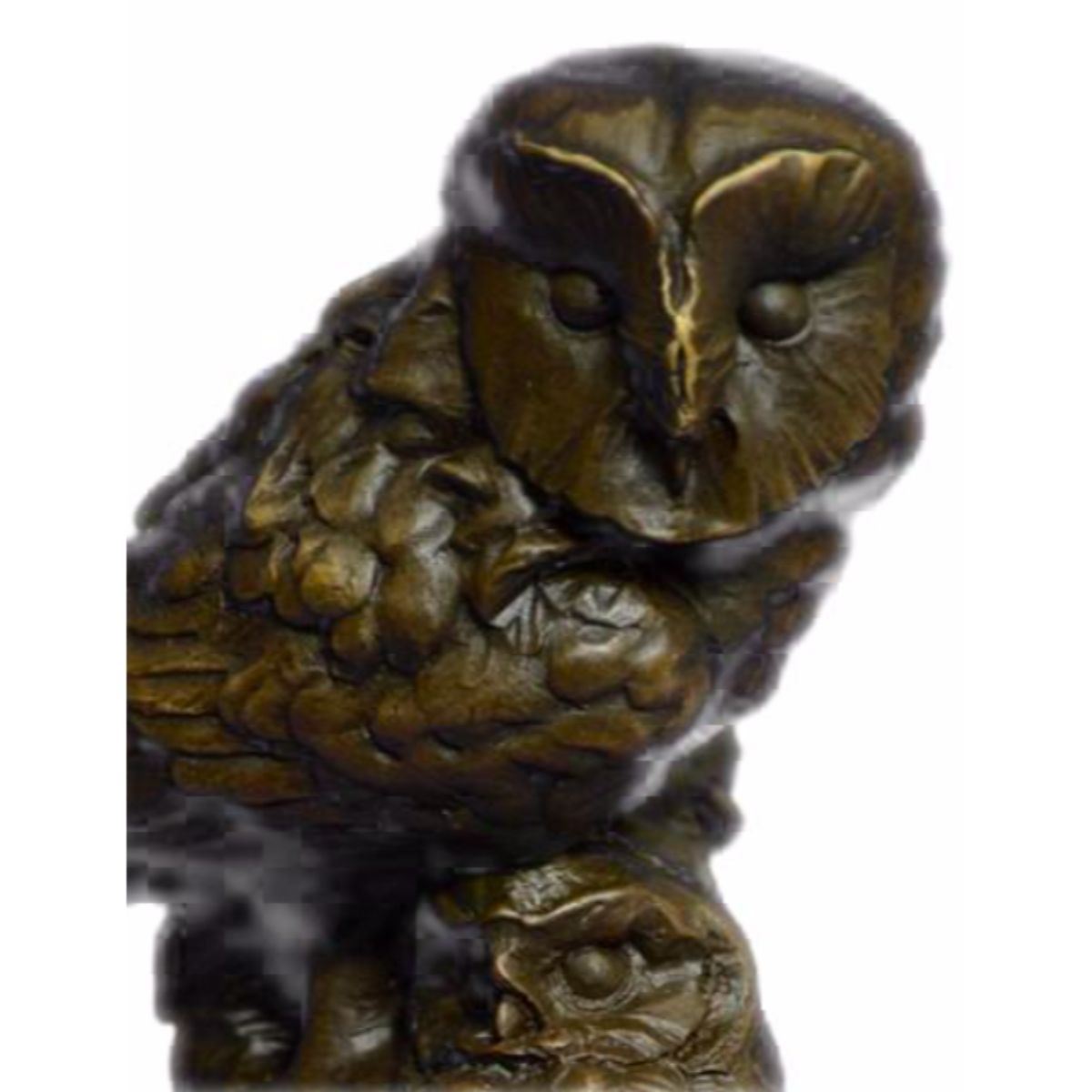 Two Owls sculpture, lost wax casting bronze, with brown patina, mounted on a marble plinth. 10" H X 6" W. 9 lbs weight.Â