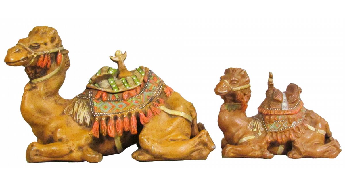 Two Painted Metal Figural Camel Inkwells. Large camel missing glass reservoir otherwise excellent condition. Large camel measures 8 inches wide.