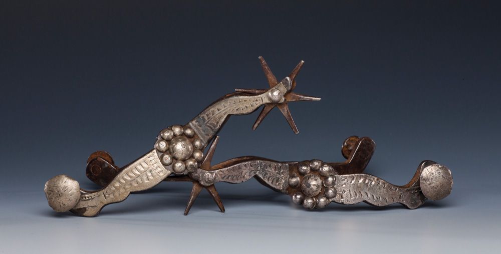 Two Pair of Eduardo Grijalva Spurs. (a) "EG* MAGDALENA SON. MEX 1992" maker-marked, silver overlaid spurs; mounted engraved heelband with single raised spot, swinging button, 1 1/2"-10 point rowel, unused condition. (b) "EG* MEX.1999", maker-marked, silver overlaid spurs with upturned buttons, triple-domed bands, 6-point irons rowels, unused condition. PROVENANCE: Dick Powell Collection, Casa Grande, Arizona