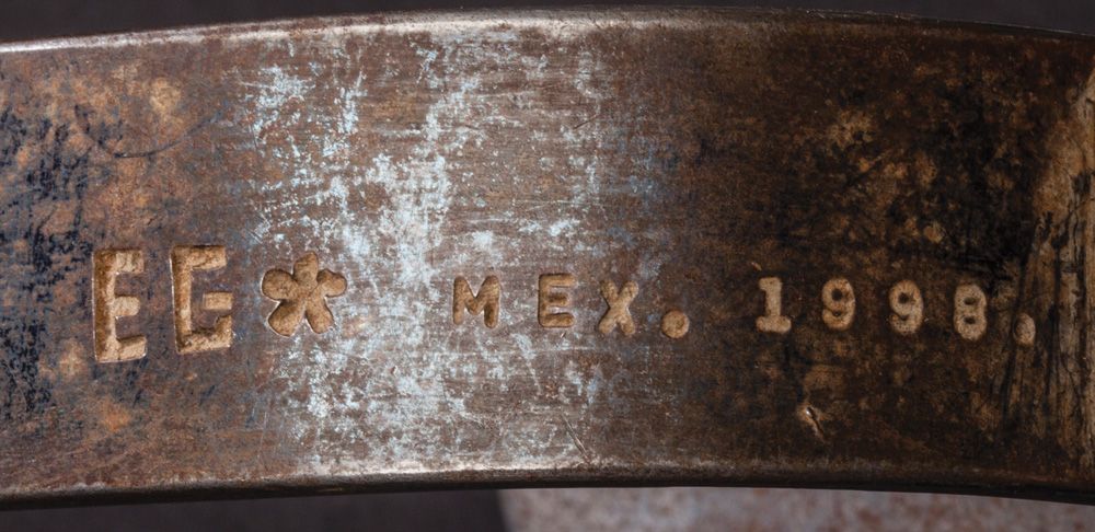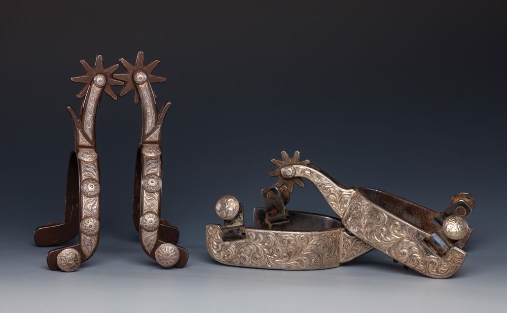 Two Pair of Eduardo Grijalva Spurs. (a) "EG*MEX. 1998." marker-marked, with finely engraved silver overlaid mountings, wide heelband, 1 1/4" 10-point rowels, swinging buttons, excellent condition;. (b) "EG* MEX. 1999." maker-marked with narrow band mounted with engraved silver overlays separated by raised buttons, upturned buttons, 2" 8-point rowels, excellent condition. PROVENANCE: Dick Powell Collection, Casa Grande, Arizona