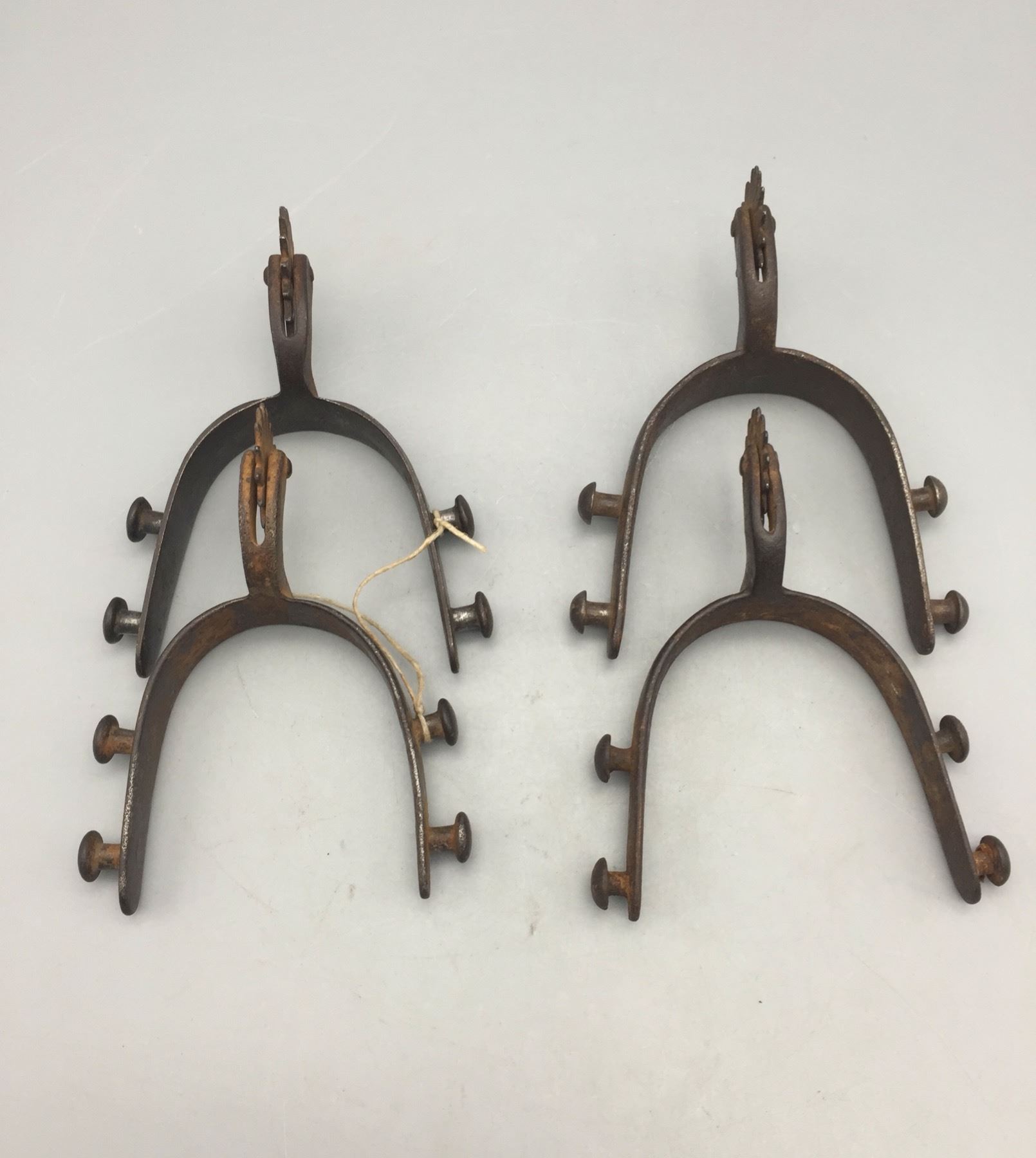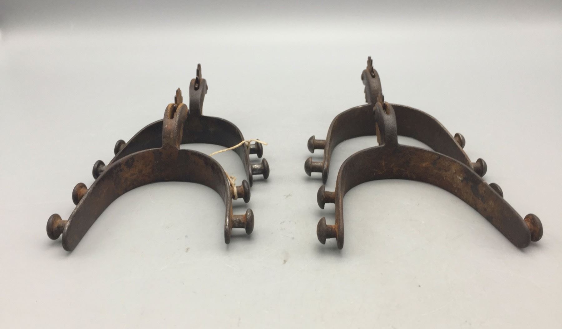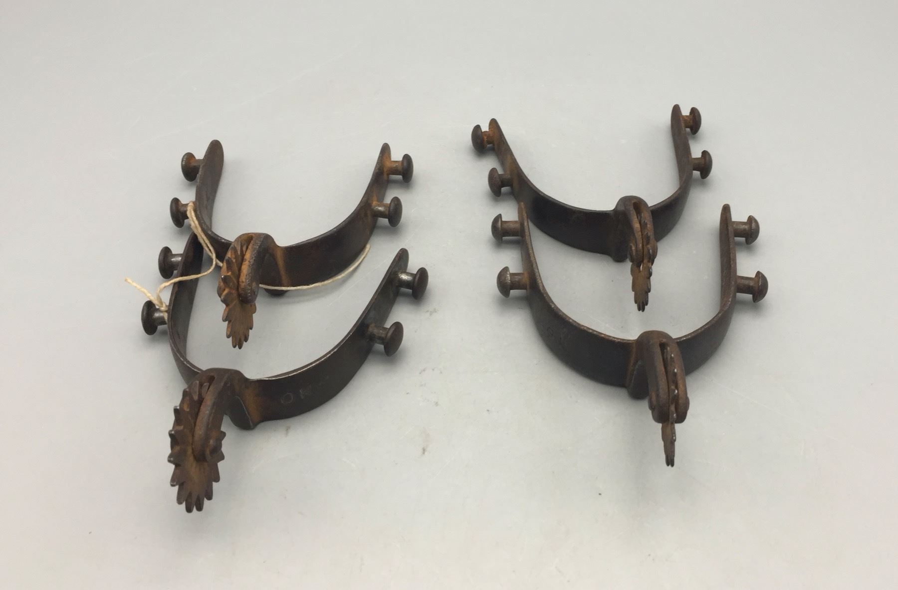 Description: Included for sale in this lot are two pair of “OK” spurs by Buermann. These were working cowboy grade spurs in the late 1800s and early 1900s. Maker: OK, August Buermann. Approx. Age: Circa 1900. Size: Heel measures 3-1/8 inches, shank is 2 inches, band 1 inch. Heel measures 3 inches, shank 2 inches, band 7/8 inches. Condition: Pretty good for their ages, wear and aging expected. Please look closely at the pictures - they are an important part of our description. Shipping: There will be a $8 handling, packaging fee for shipping this lot. The actual cost of postage will be added on top of that.