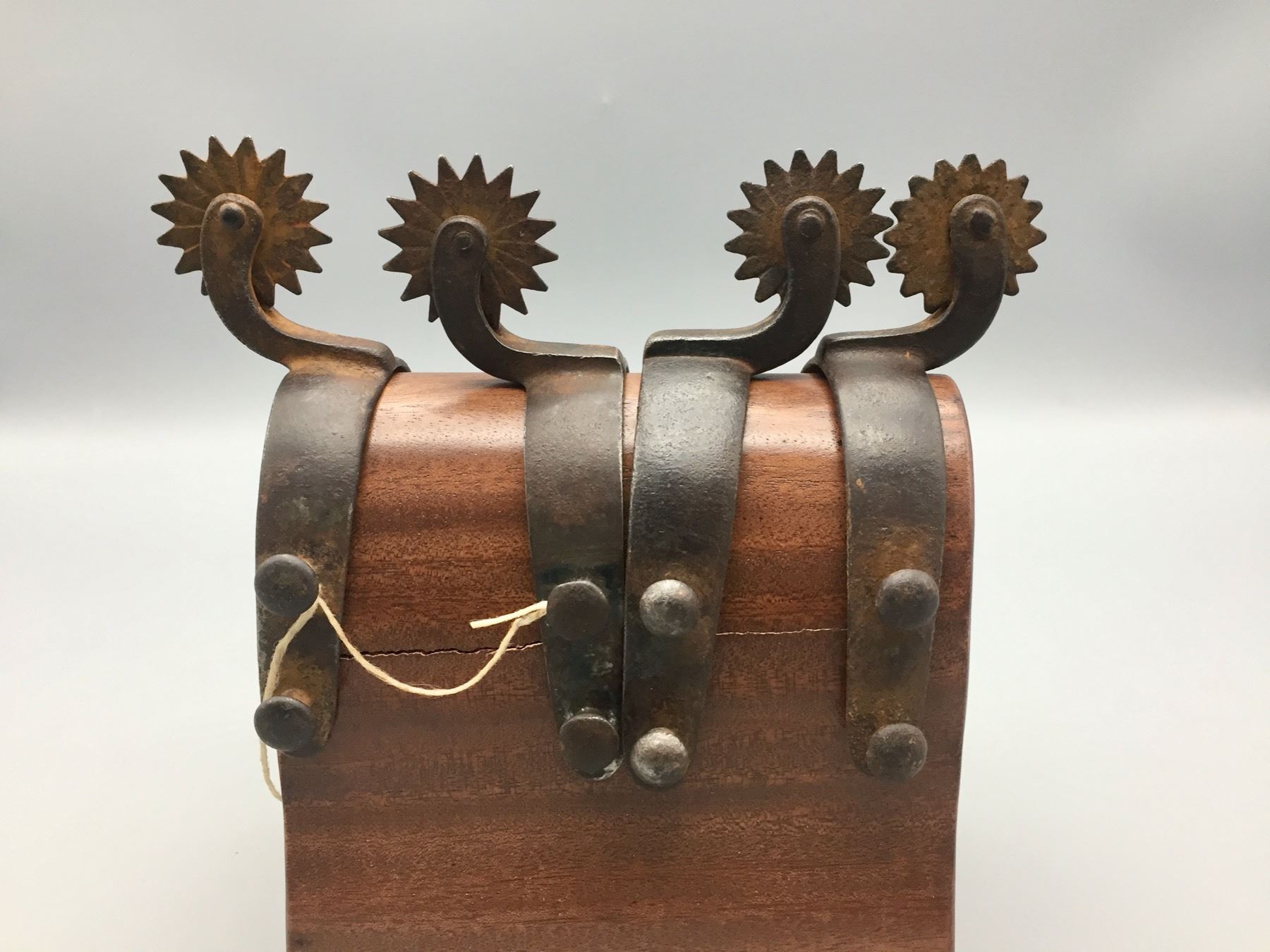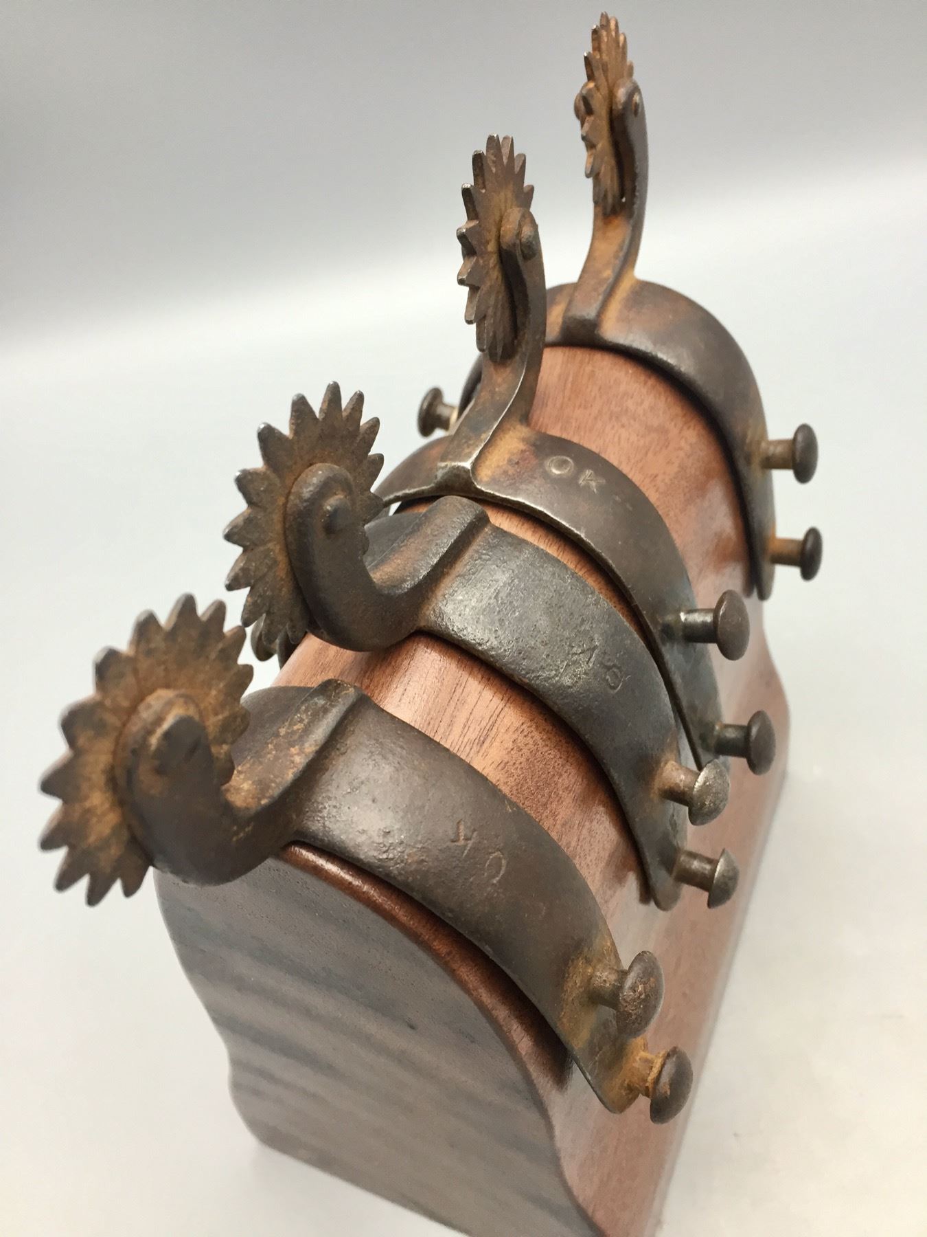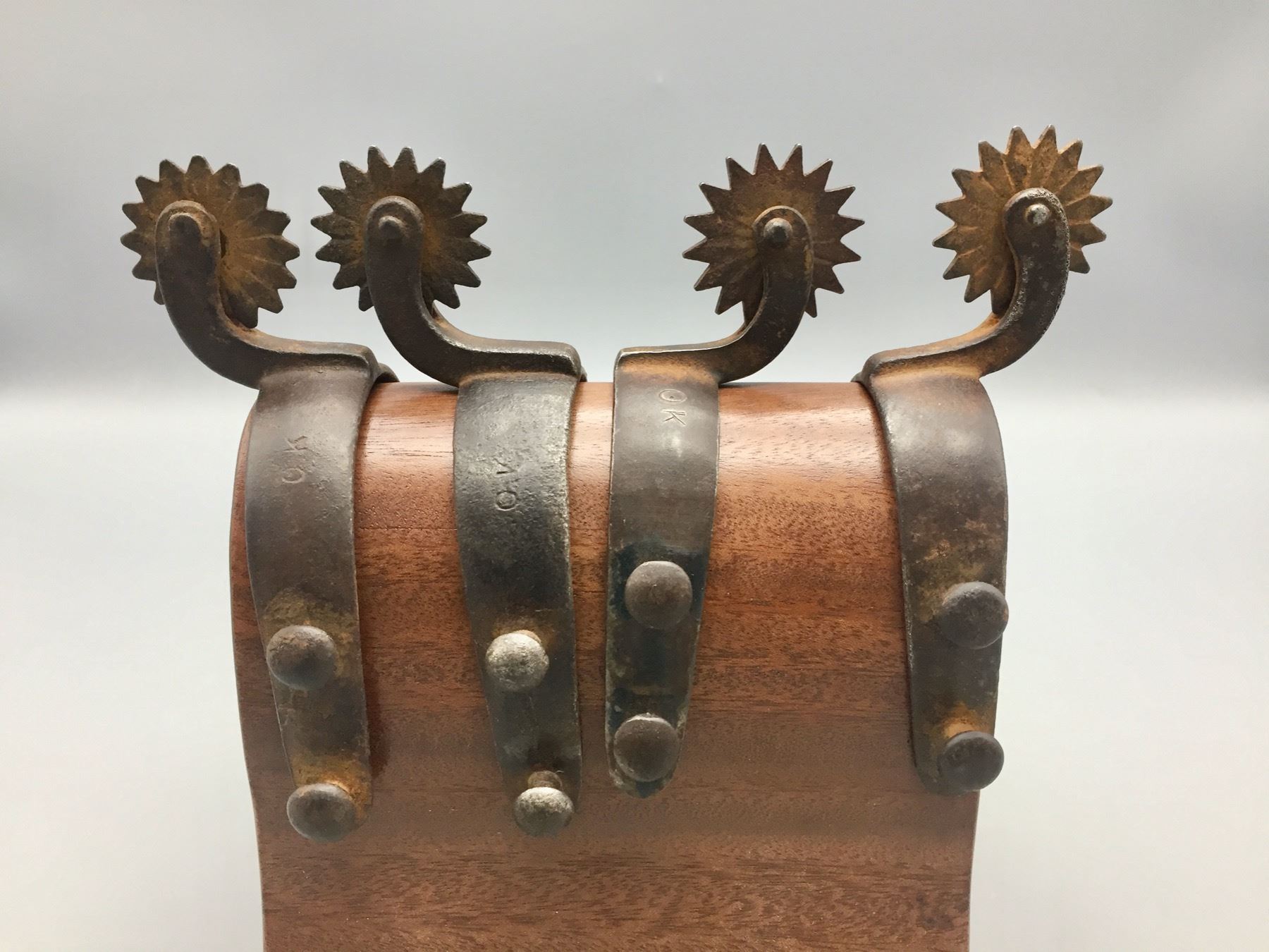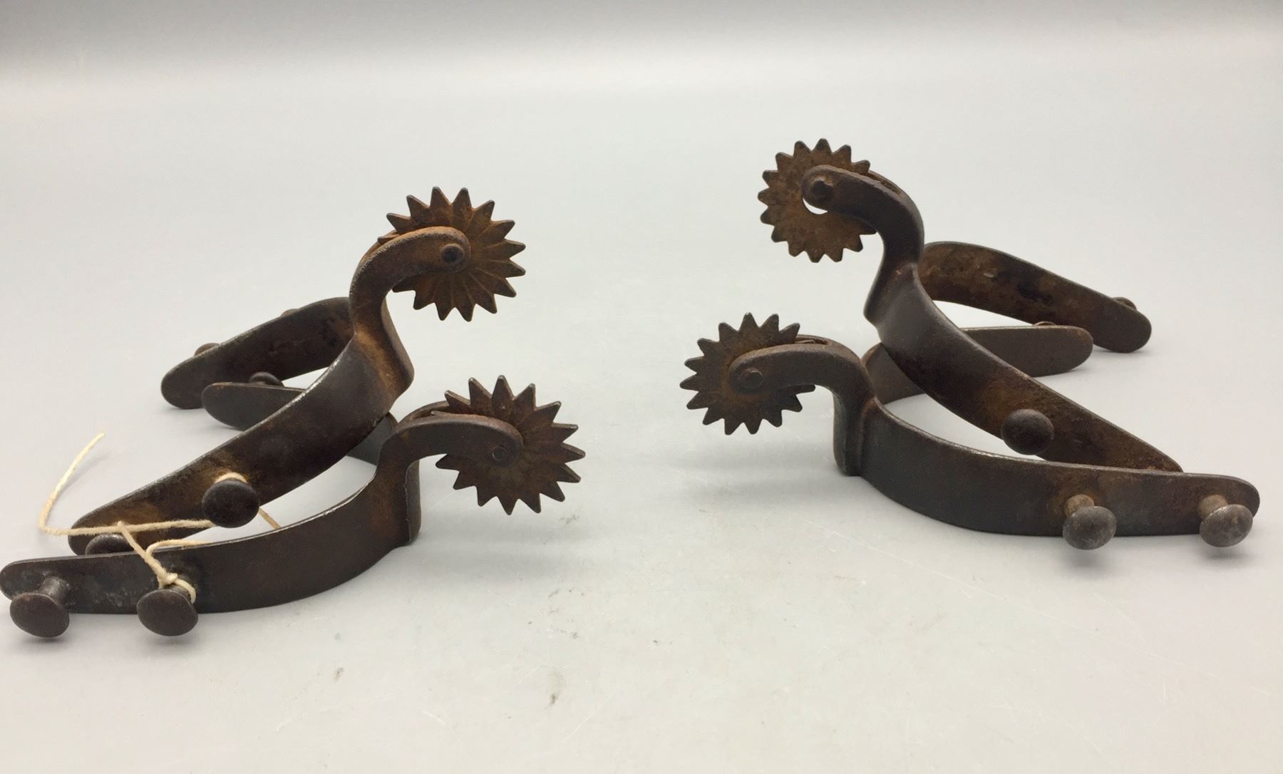 Description: Included for sale in this lot are two pair of “OK” spurs by Buermann. These were working cowboy grade spurs in the late 1800s and early 1900s. Maker: OK, August Buermann. Approx. Age: Circa 1900. Size: Heel measures 3-1/8 inches, shank is 2 inches, band 1 inch. Heel measures 3 inches, shank 2 inches, band 7/8 inches. Condition: Pretty good for their ages, wear and aging expected. Please look closely at the pictures - they are an important part of our description. Shipping: There will be a $8 handling, packaging fee for shipping this lot. The actual cost of postage will be added on top of that.