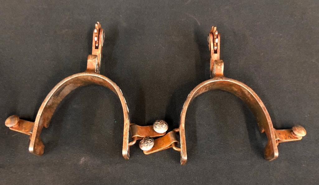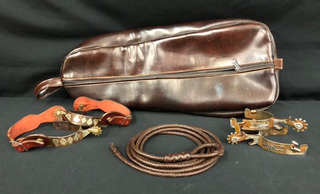 Presented for sale in this lot is a bargain batch of items which include two pairs of spurs, a Kangaroo leather '"Git Down" and a bridle traveling/storage bag. Spurs are of the "feed store" variety. One pair is marked BB (Bob Blackwood) and the other one is not marked. The "Git Down" and bridle bag are pretty nice. MAKER: Various. APPROX AGE: Fairly modern on all. SIZE: Various. CONDITION: Good for their age, normal wear expected. Please look closely at the pictures as they are an important part of our description and are hereby incorporated into the description, specifically with regards to condition. SHIPPING: There will be a $10 handling / packaging fee for shipping this lot. The actual cost of postage will be added on top of that. BUY IT NOW: If you would like to buy this item now, without waiting for the auction day to bid on it, we do offer this option (which is available up to 48 hours before the actual auction starts). The “Buy it Now” price is the high estimate of this lot (plus applicable fees and the Buyer's premium is discounted to 10% when using the Buy it Now option). If you would like to exercise this option, you must contact us by email (or phone as long as you talk to someone live). Reference this lot number and your intention to "Buy it Now."