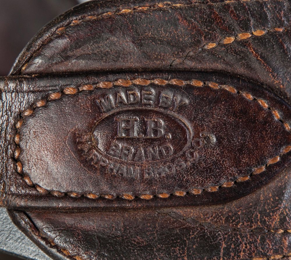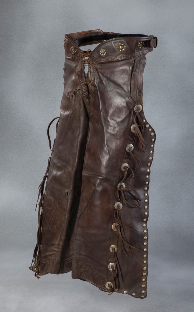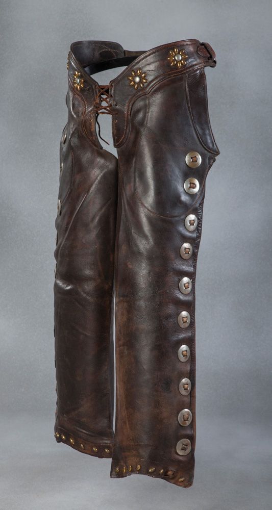 Two Pair of Studded Batwing Chaps. a) Unmarked, well worn, batwing chaps with some repairs. 10 nickeled slotted conchos down each leg. Circa 1900. b) E. B. Brand marked chaps with 10 nickeled slotted conchos down each leg, well worn also but no tears. In the shotgun step in style style, circa 1890. PROVENANCE: Forth Worth Museum of Science and History. Sale to benefit the collections of the Fort Worth Museum of Science and History.