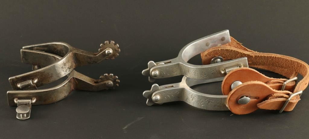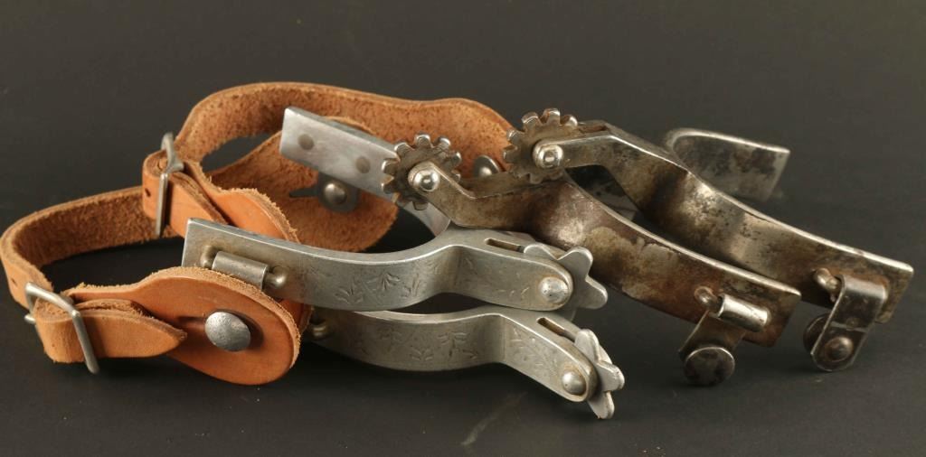 (1) Aluminum with etched leaf motif and small star rowels with brown leather straps. (1) Pair smooth nickel with small rowels, shows rust.
