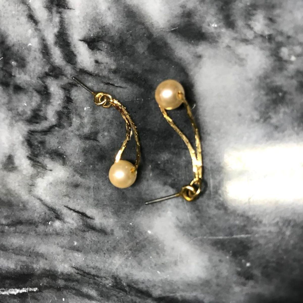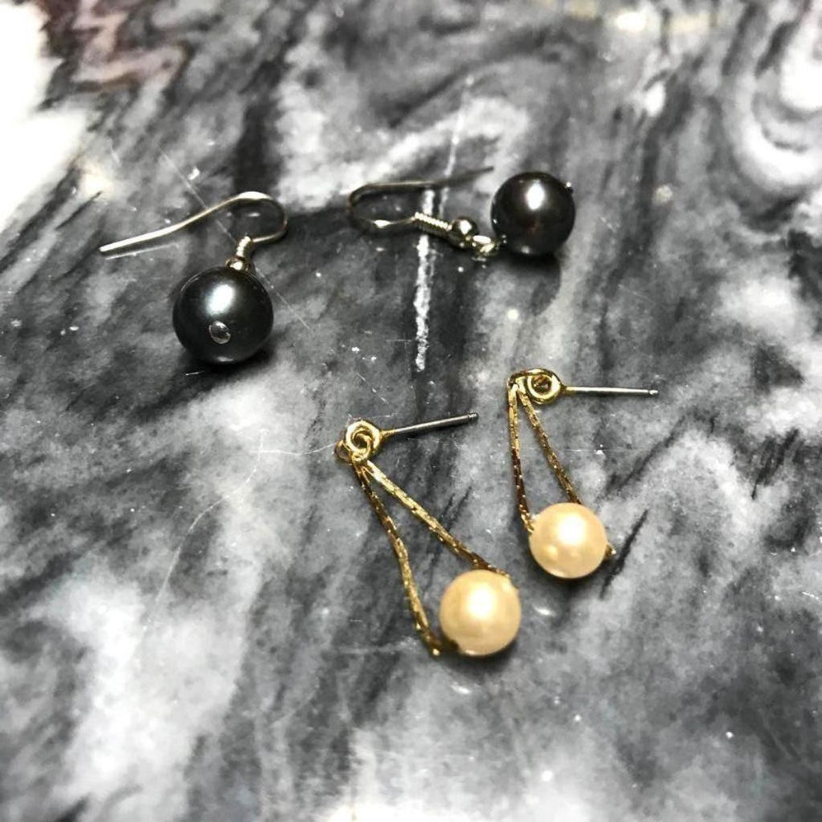 Two pairs of vintage pearl earrings -  a pair of 14kt gold wire drop-style post earrings with 5mm threaded white pearls & a pair of sterling silver hook style earrings with 8mm black pearls.Â