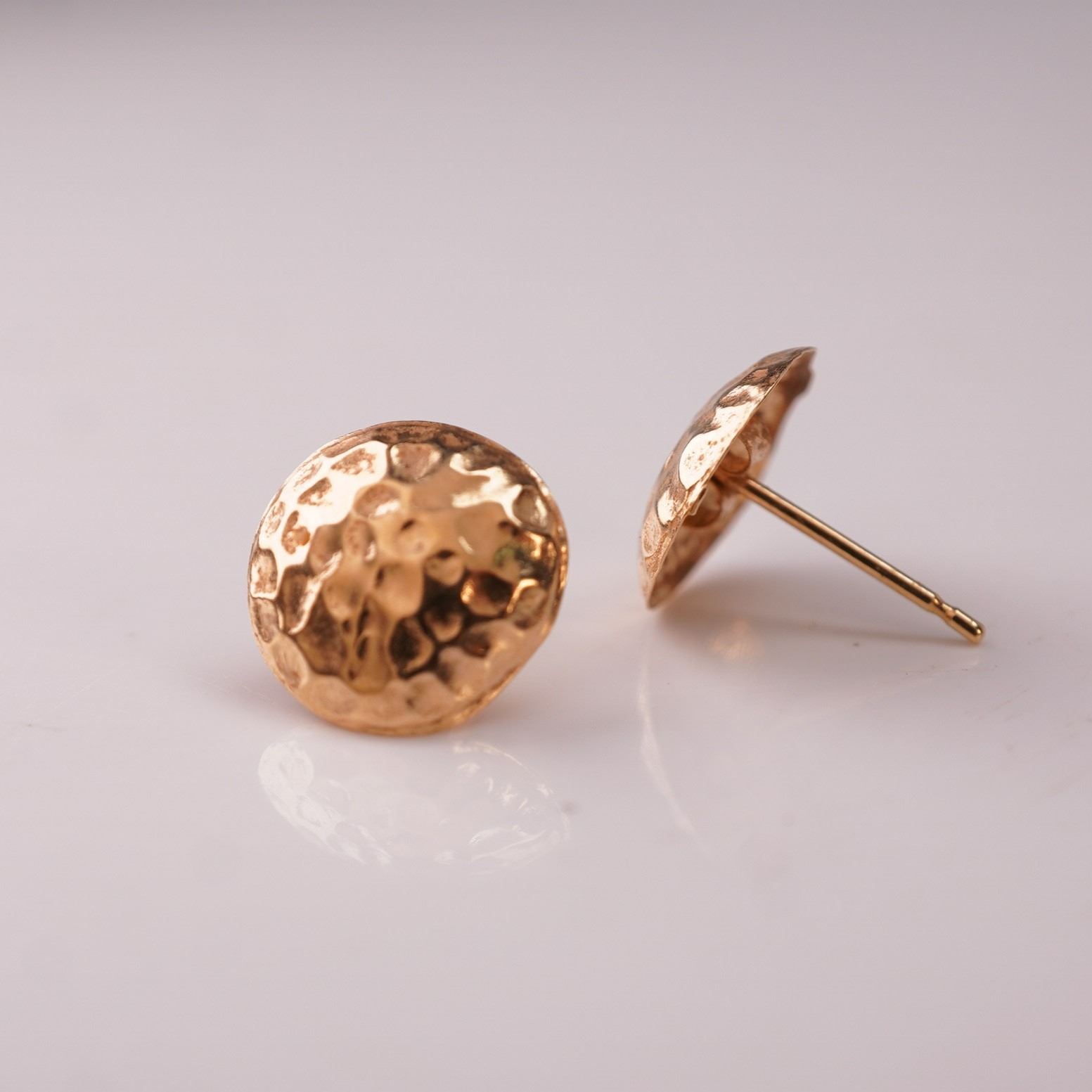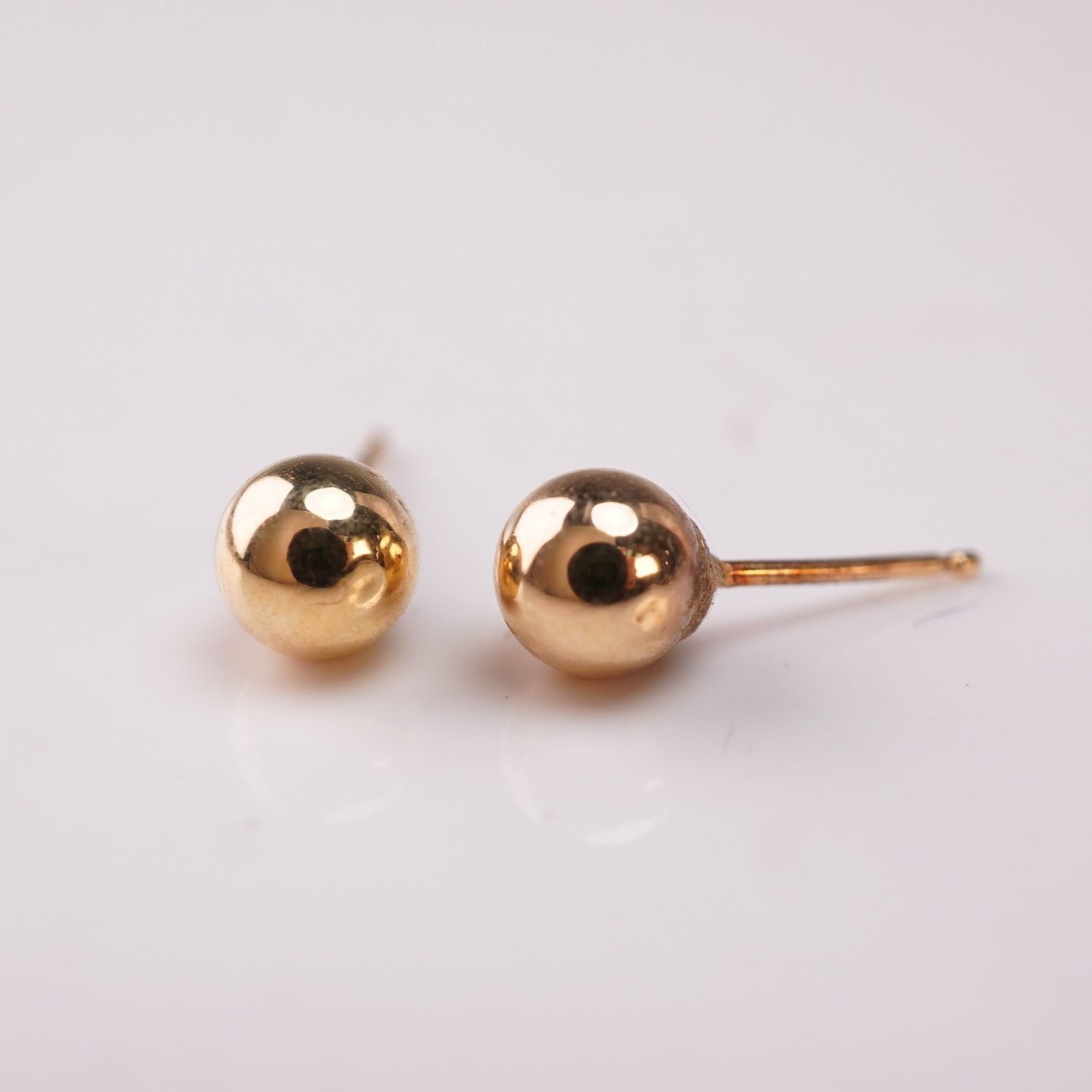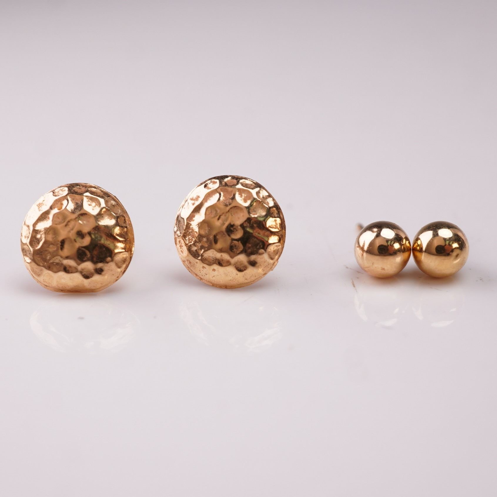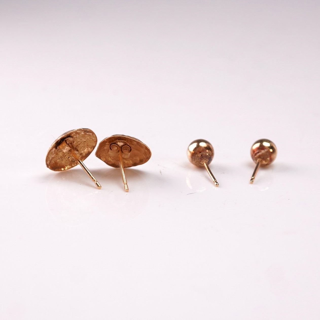 This lot features two charming pairs of 14k gold stud earrings, offering both texture and shine for versatile wear. The first pair showcases a classic polished 0.25"dia. sphere design, with smooth, reflective surfaces that capture the light beautifully. The second pair presents a domed, hammered finish measuring 0.4"dia., adding artisanal character and a subtle play of texture. Both pairs are crafted in warm-toned 14k gold and fitted with secure post backs. Together, they have a combined weight of approximately 0.2 grams, making them delicate yet elegant additions to any jewelry collection. Perfect for mixing and matching, wearing alone, or layering with other favorites.