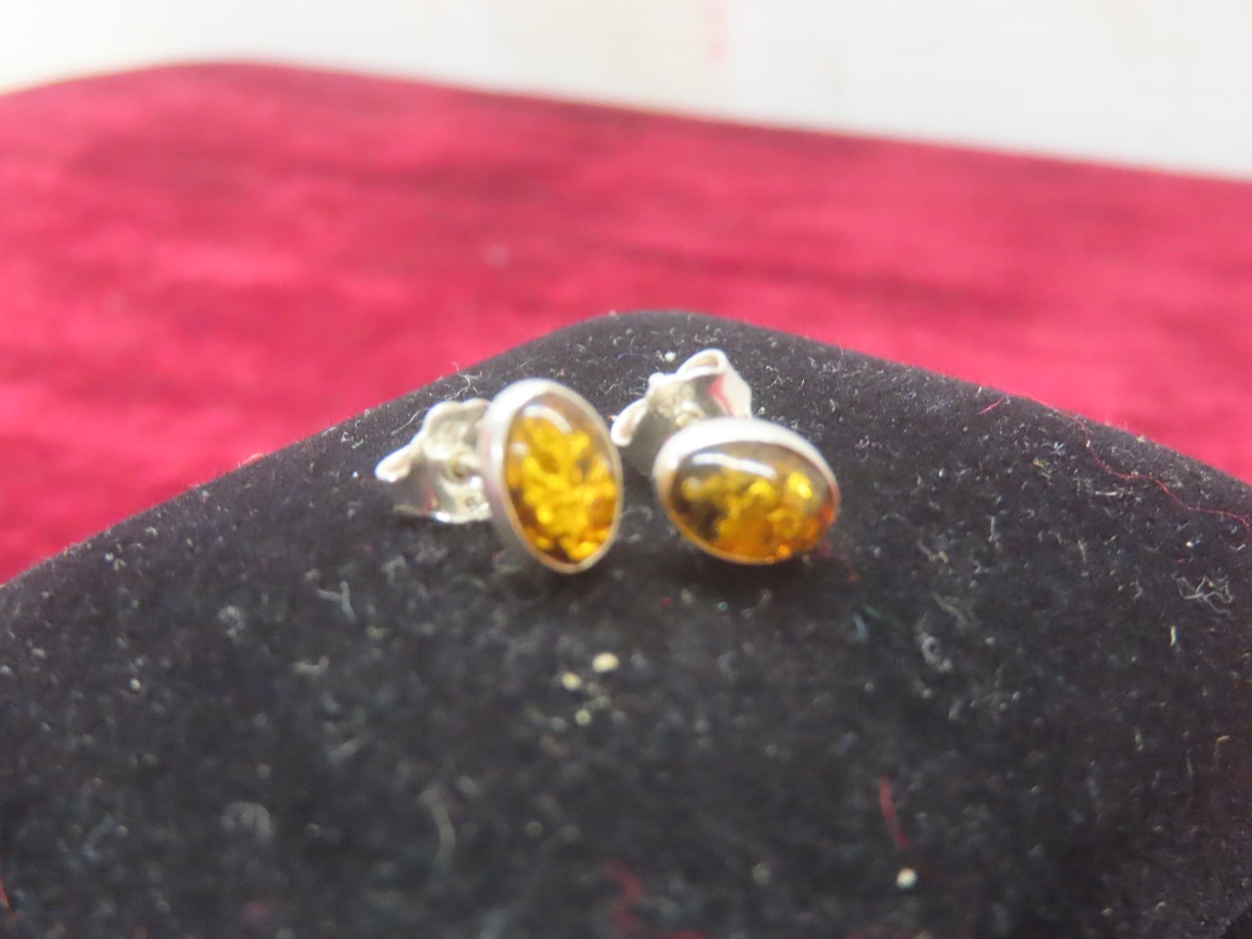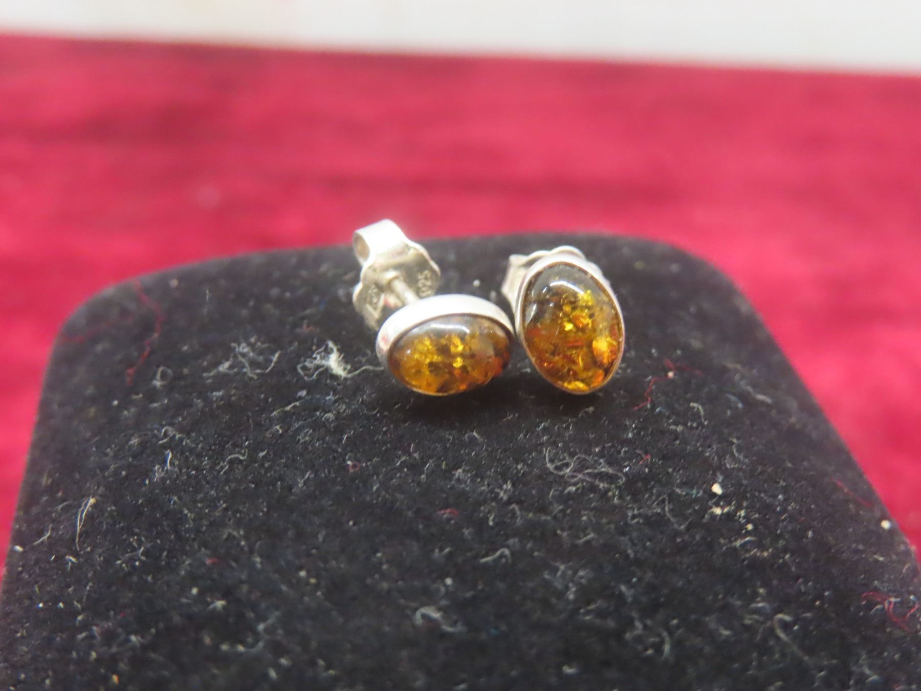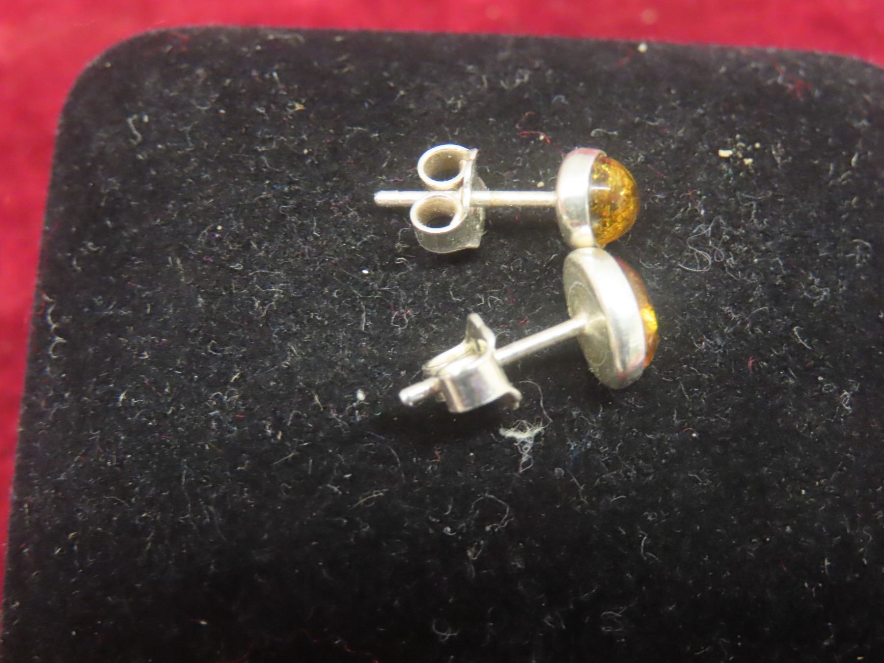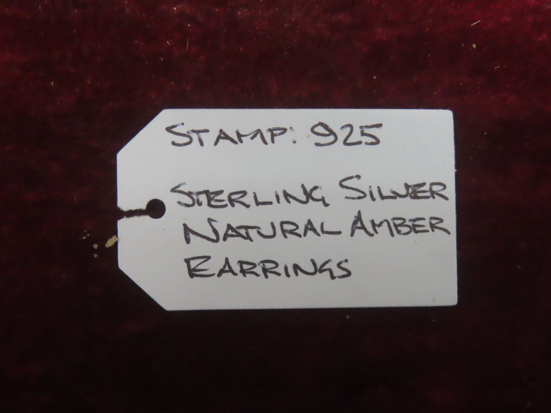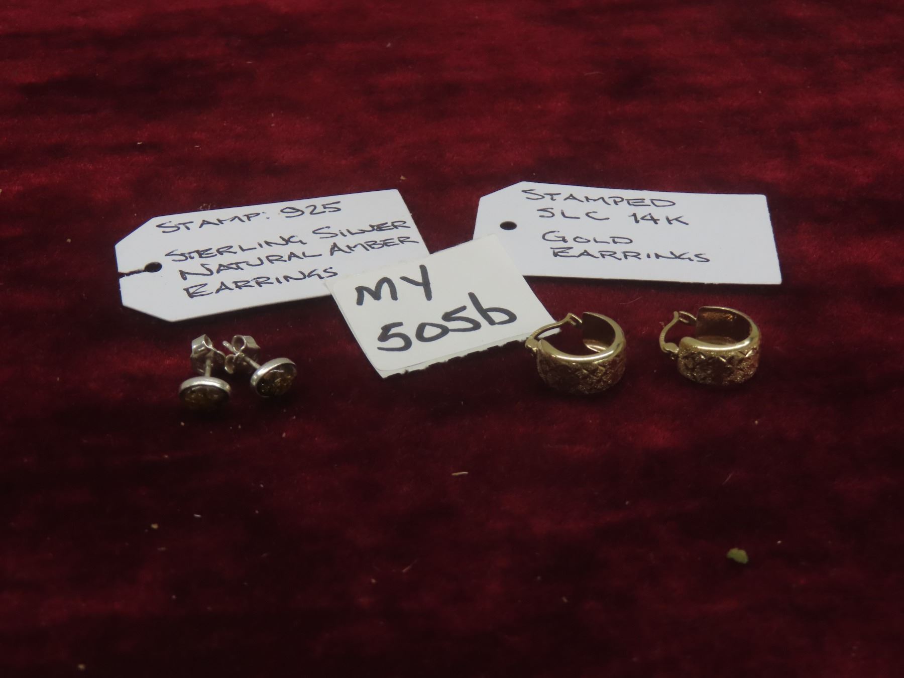 Two Pairs of Earrings: 14K SLC (Stamped) Gold Hoops and Stamped 925 Sterling Silver and Amber Studs