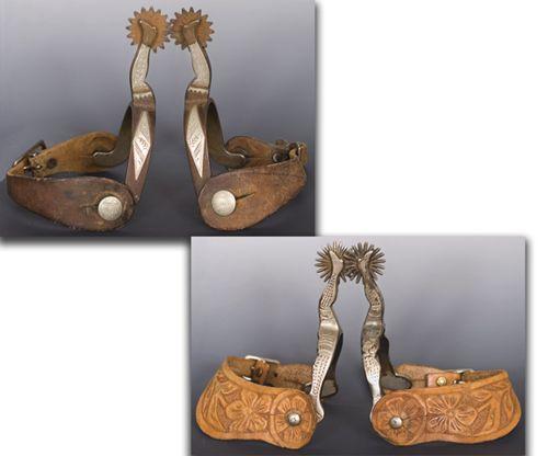 Two Pairs of Gal-Leg Spurs. Pair one is unmarked single mounted iron spurs decorated with silver and copper single mounted. Fine condition. Pair two is Buermann engraved Gal-Legs with original nickel finish. Tooled straps. Scarce. Some nickel loss. (est $