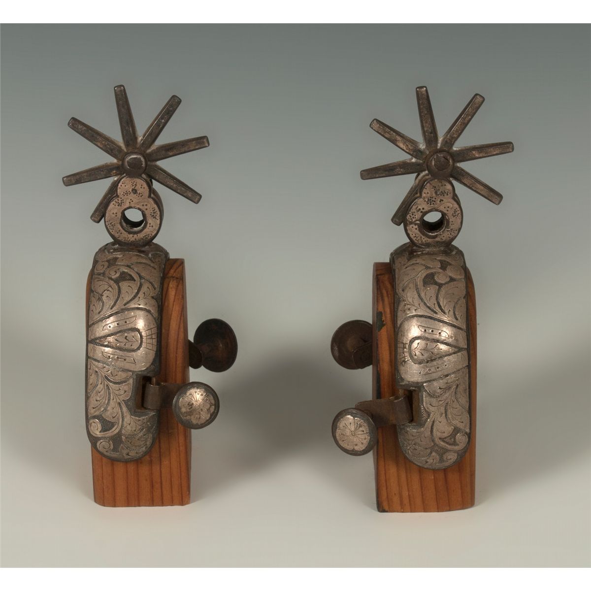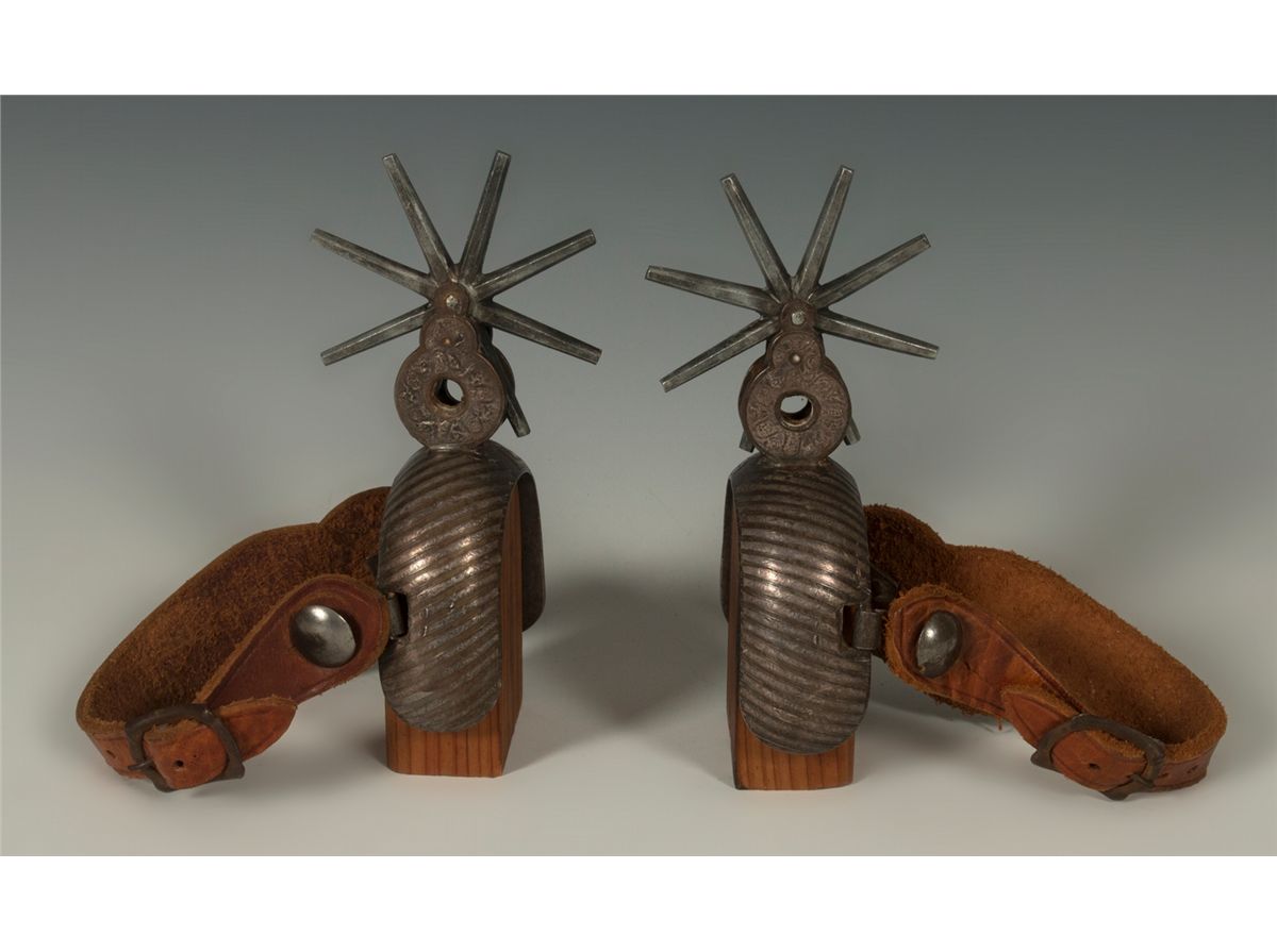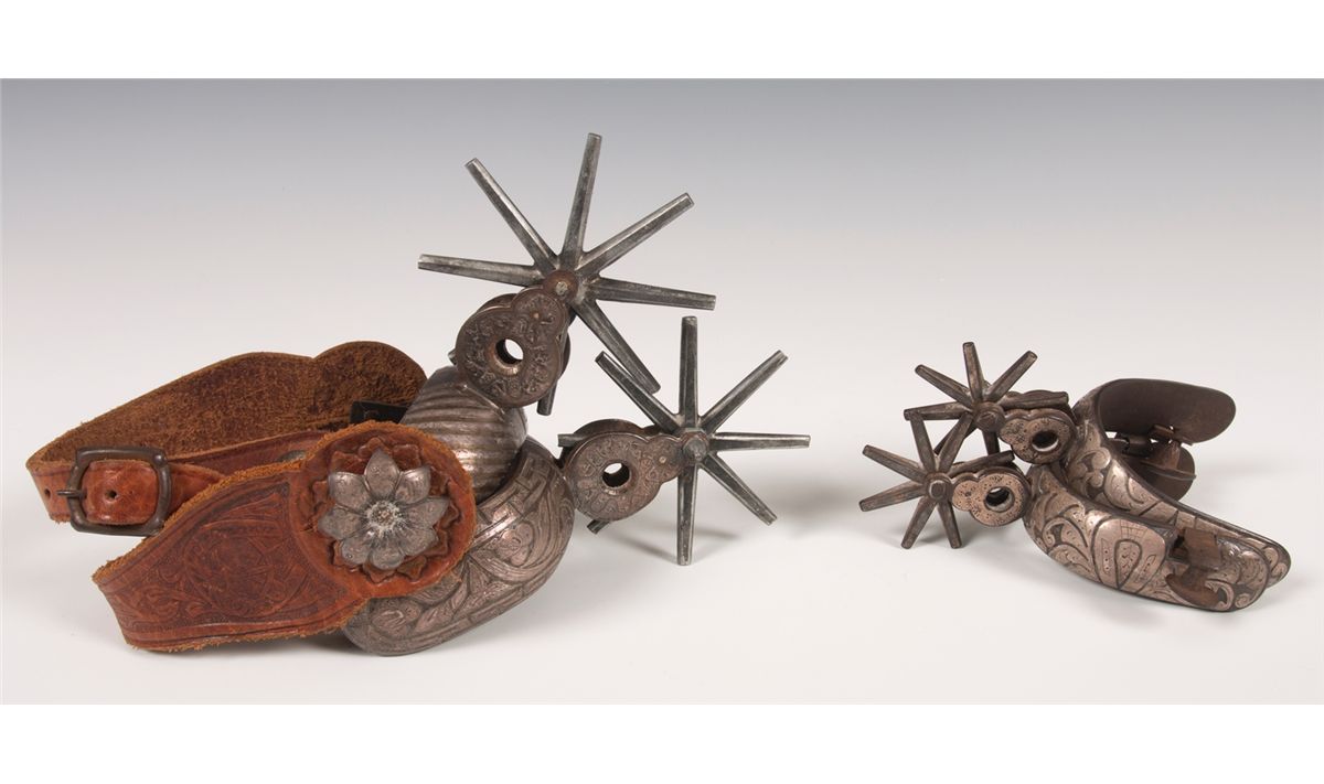 Two Pairs of Mexican Spurs. 1. 5.75" long with eight-point 3.75" rowels. Amozoc spurs with silver inlay on the bands as well as the figure eight shanks. Swinging flower buttons with old straps. Circa 1910-1920 (newer straps). 2. 5.75" long with eight-point 2.25" rowels. Double mounted with floral designs and a figure eight shank. Swinging buttons. Circa 1930s. Provenance: Golden Eagle Trading Co.