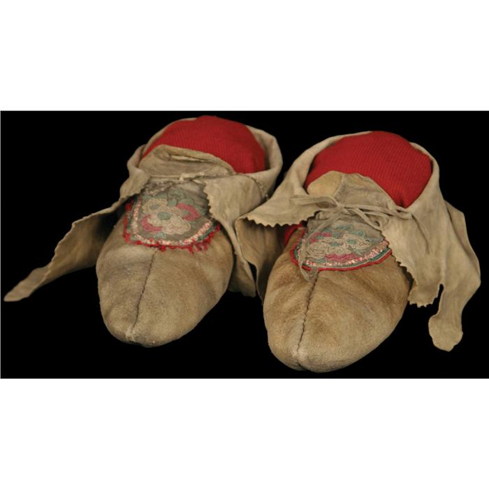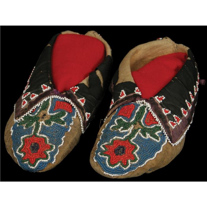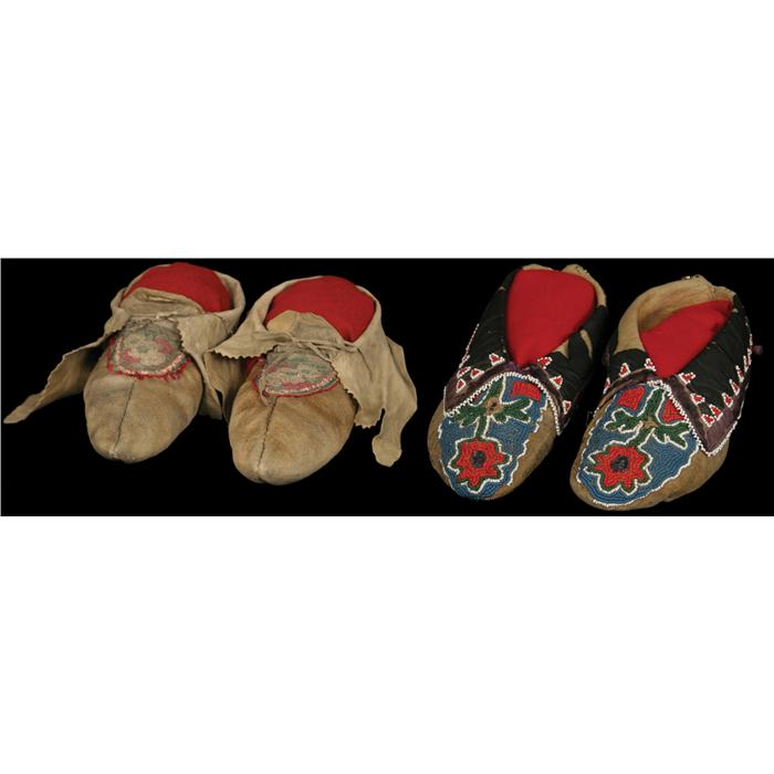 Two Pairs of Moccasins. (1) Embroidered and Quilled Moccasins. 10 1/2". Floral Designs. Some quillwork missing and areas of embroidery show moth loss. 19th century. (2) Oto Beaded Moccasins. 10". Flower design. Some beadwork missing. 19th century. (est $1,500-2,000)