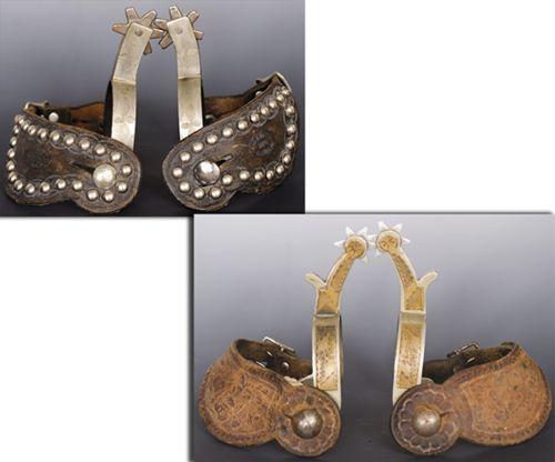 Two Pairs of Prison Made Spurs. Pair one made in Walla Walla prison. Engraved, double mounted. Studded straps. 1930s. Fine condition. Pair two is Canon City style iron spurs. Engraved copper overlaid on one side. Very pretty spurs. Old cowboy straps. (est