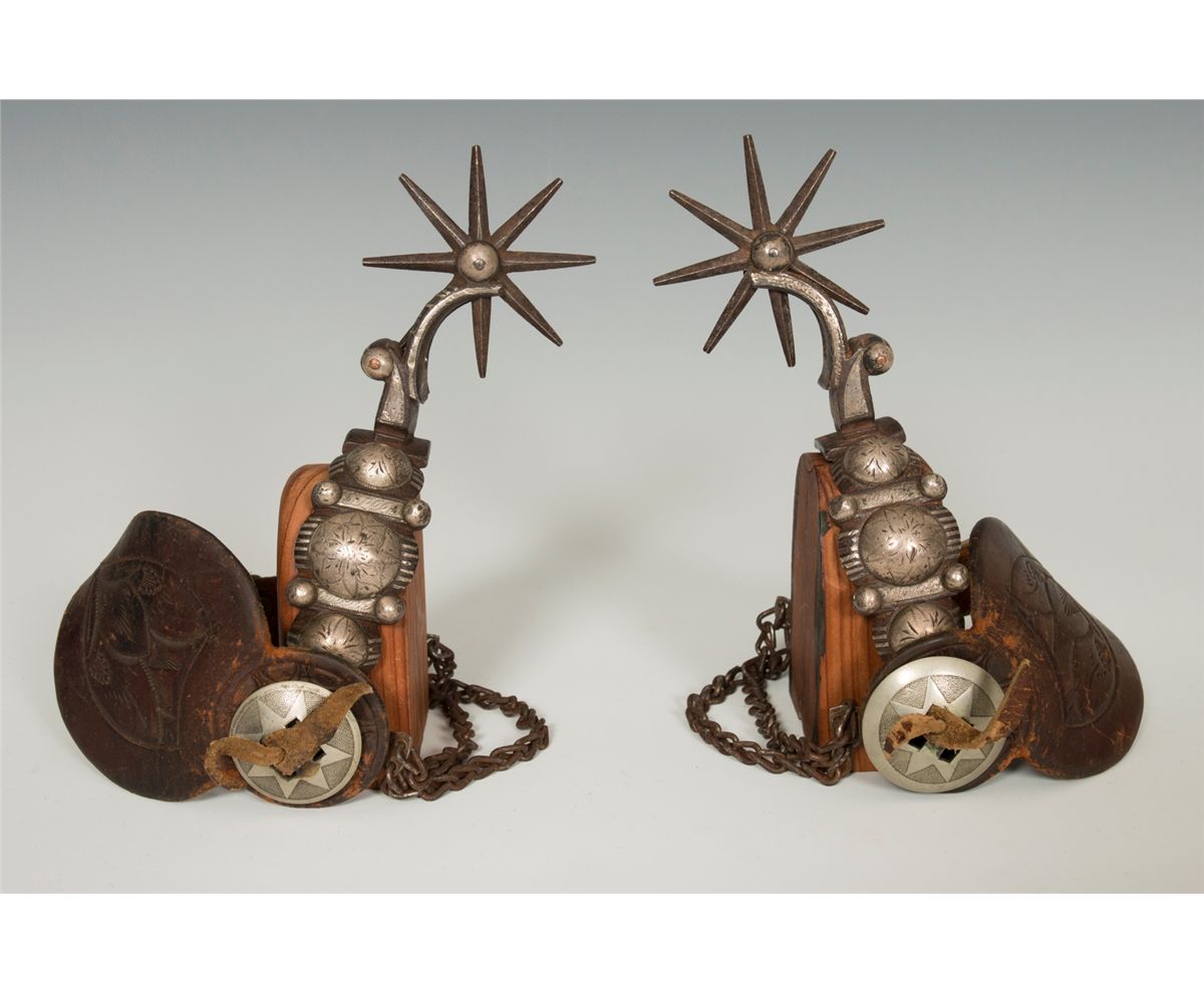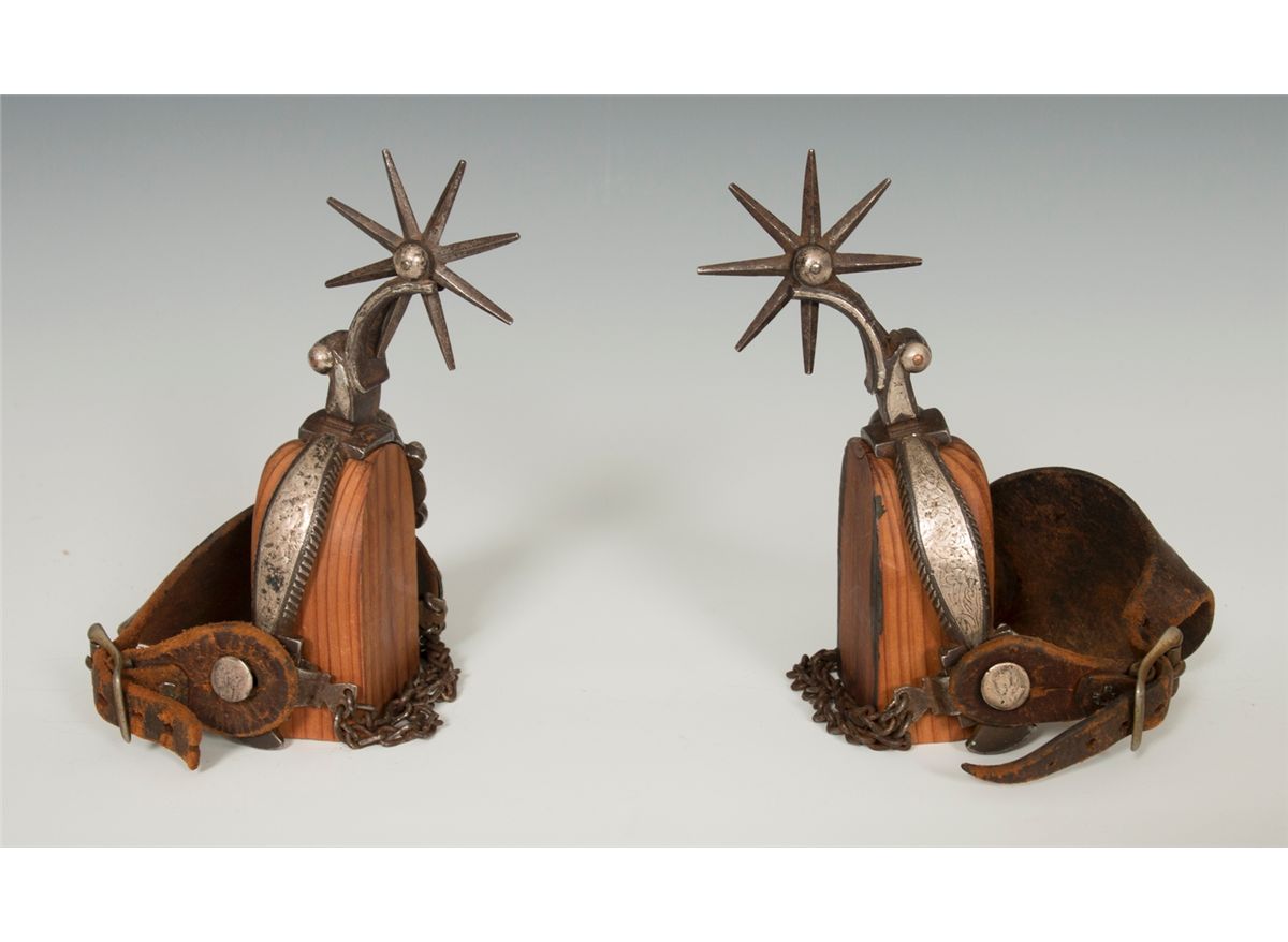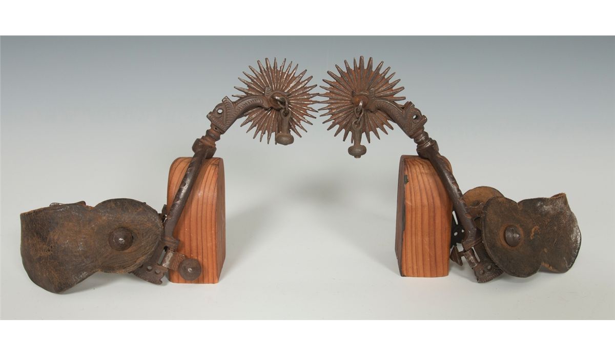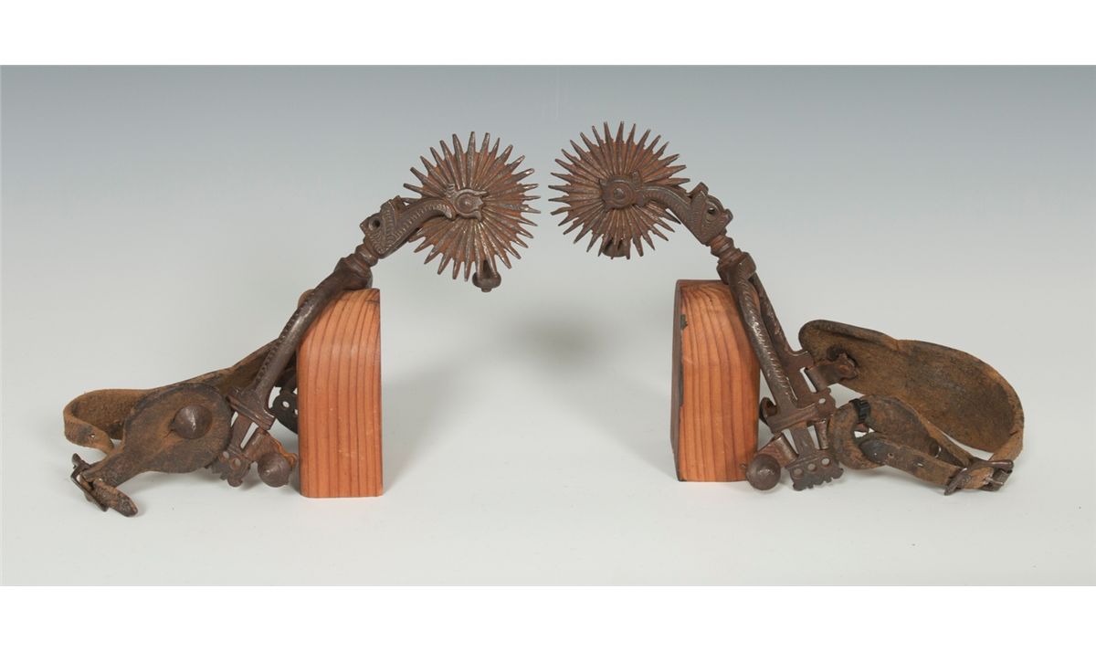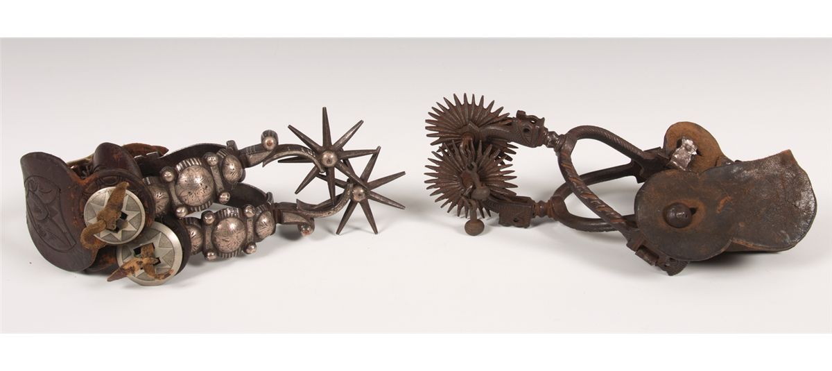 Two Pairs of Spurs. 1. 8" long with thirty-two-point 2.75" rowels. Nice early iron spurs with old straps. 19th century. 2. 8.25" long with eight-point 2.75" rowels. California style. Double mounted with three domes on the front and inset diamonds on the off side. Also silver inlaid. With old floral carved straps. Circa 1920s. Provenance: Golden Eagle Trading Co.