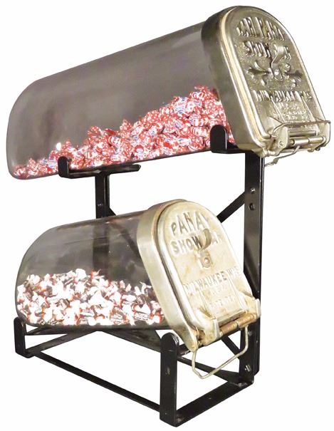 Two Panay Jars with Store Display Rack. One jar says "Karl" Panay. Very Good Condition. 22 1/2 and 15 inches.