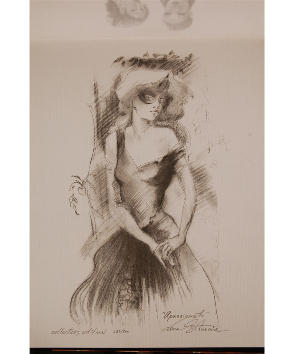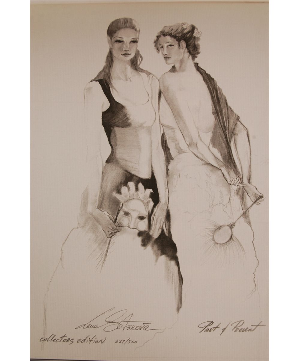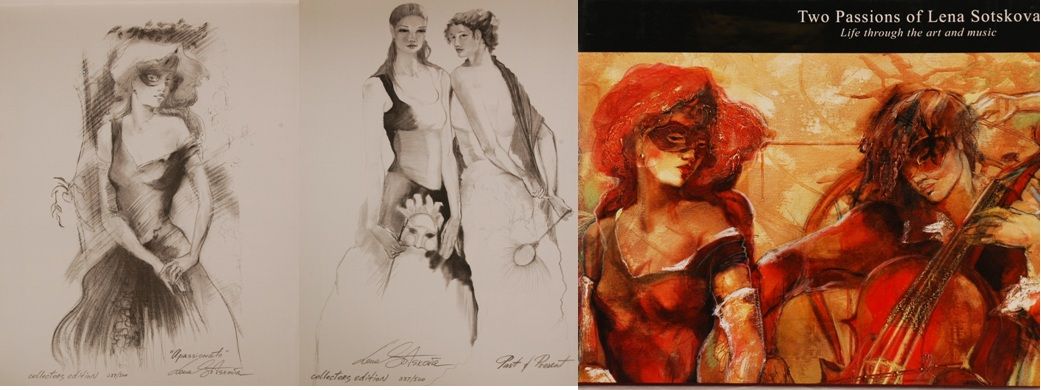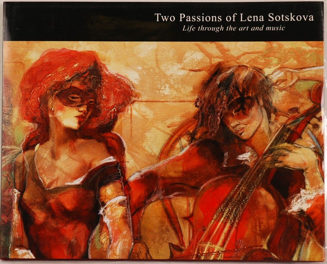 "Two Passions of Lena Sotskova - Life Through the Art and Music" Hardcover book signed on the title page by the artist and numbered 337/500. This book contains two original lithographs on art paper that are hand signed by Lena Sotskova. Lithograph titles: "Apassionato" (Study on paper); size: 14" x 11". "Past & Present" (Study on paper); size: 14" x 11". Lithographs can be separated from the book and framed. Original dust jacket intact. Pages like new. 14" x 11".