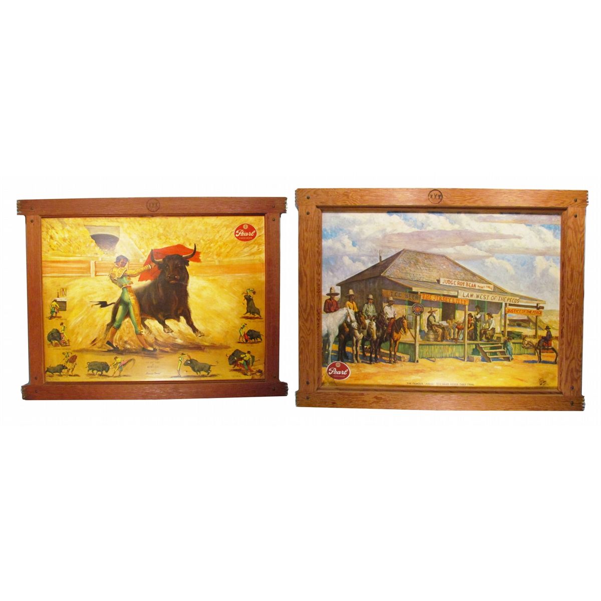 Two Pearl XXX Lager Beer Cardboard Posters. One Entitled, "The Fanous Judge Roy Bean Horse Thief Trial". The other Entitled, "The Last Fight of Manolete" by Barnaby Conrad. Both Come in the original frame. Both 43 X 32 1/2 inches.