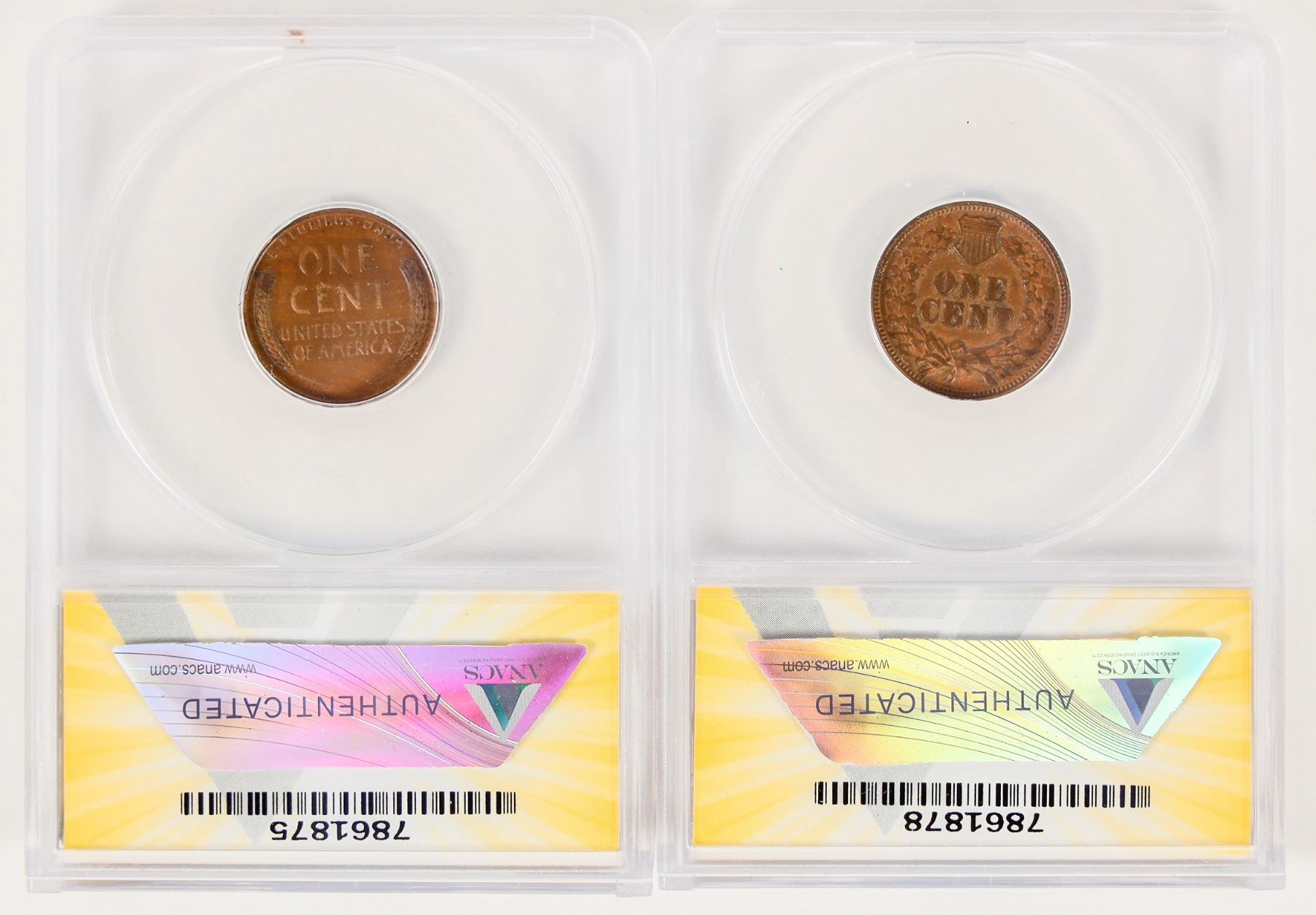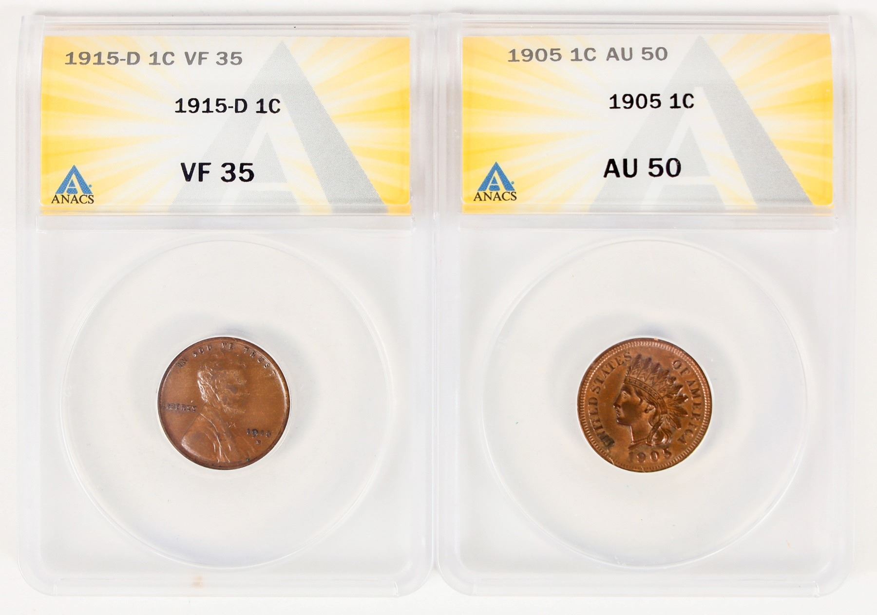 Two cents graded by ANACS: 1) 1905 Indian Head, AU 50. 2) 1915-D Lincoln VF 35.