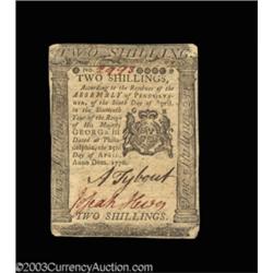 <TABLE cellSpacing=0 cellPadding=0 width="100%" bgColor=#000000 border=0><TBODY> <TR><TD width="100%"><TABLE cellSpacing=1 cellPadding=3 width="100%" border=0><TBODY><TR><TD width="100%" bgColor=#79735c><FONT face=arial color=#ffffff size=3><B>Description</B> </FONT></TD></TR><TR><TD width="100%" bgColor=#ffffff><FONT face=arial size=2><B>Two Pennsylvania April 25, 1776 notes.</B></I> 1s and 2s, both beautifully signed and extremely well printed. Both grade <B>About New.</B></I> The 1s is Choice; the 2s has minor paper peels at the corners. (225-up ) (2 notes) </FONT></TD></TR></TBODY></TABLE></TD></TR></TBODY></TABLE><BR><TABLE cellSpacing=0 cellPadding=0 width="100%" bgColor=#000000 border=0><TBODY><TR> 2 notes Important notice: Heritage usually auctions material at the rate of 200-250 lots per hour. On some occasions eBay Live bid software or the Internet may not be able to keep up with the pace of the auction. We recommend placing a realistic absentee bid now as insurance to avoid disappointment. Occasionally the auctioneer may eliminate or reject an eBay Live bid, and the auctioneer may also reopen a lot after the close of the eBay live bidding (usually because we missed an audience bid), and may reject your bid even if it shows you as the winning bidder. By bidding via eBay Live, you agree that Heritage may award the lot to another bidder at its sole discretion under the circumstances described above or any other reasonable circumstances. Also please note that all Heritage lots purchased through eBay Live carry a 20% Buyer's Premium. Please make sure you read the Terms and Conditions before you bid.</TR></TBODY></TABLE>