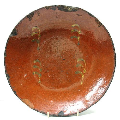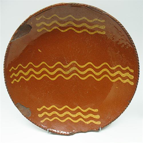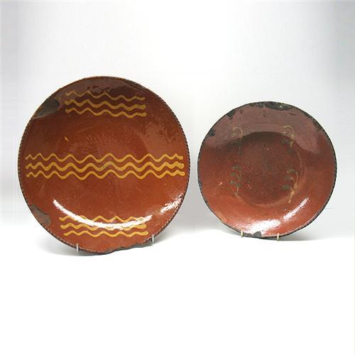 Two Pennsylvania glazed redware plates; both with cream slip wavy lines and coggle rims; 10 1/2" diameter and 8 1/2" diameter; both with rim chips and crazing