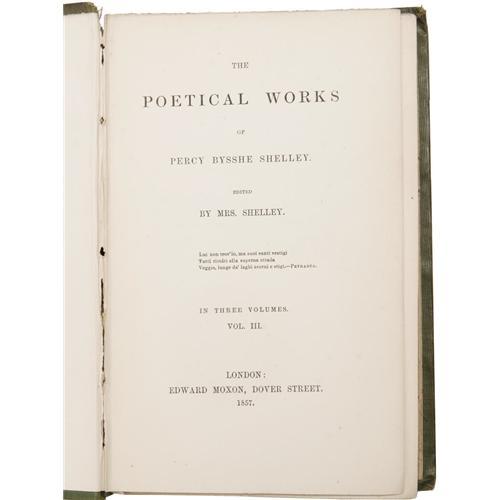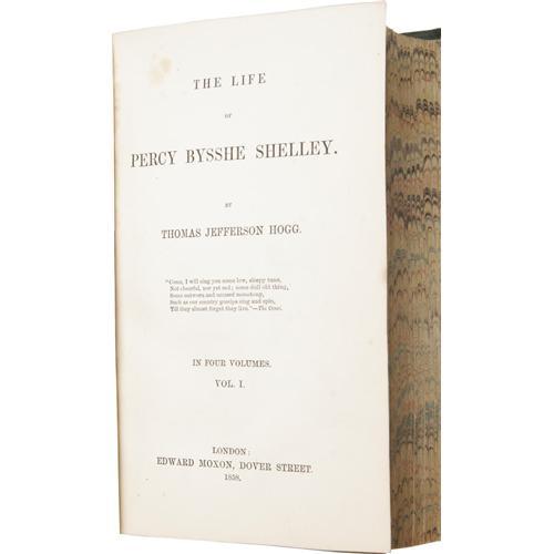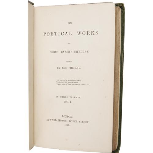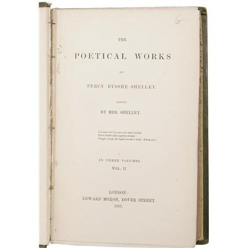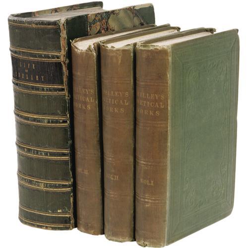 <B>Two Percy Bysshe Shelley Collections.</B></I> Mary Shelley, editor: <I>The Poetical Works of Percy Bysshe Shelley</B></I> (London: Edward Moxon, 1857), three volumes, Volume I: 376 pages with 8 pages of advertising in the front, Volume II: 432 pages, Volume III: 386 pages, green cloth with gilt lettering on spine and blind decorative stamping on boards, 12mo (4.5" x 7"). All volumes have sunned spines, edge and spine wear, and bumped corners. Hinge starting on Volumes 1 & III.<BR><BR>Thomas Jefferson Hogg <I>The Life of Percy Bysshe Shelley</B></I> (London: Edward Moxon, 1858), four volumes in one, 557 pages, half-leather with marbled boards and textblock edges, pencil annotations on back free endpaper. This copy is generally good, with a 2.75" portion of the leather at the head of the spine pulled away and 1" at the tail. The spine is lightly sunned, edges and corners rubbed, boards lightly rubbed and scratched. A lovely set of books for the Shelley collector. <I>From the Betty Bennett Collection.</B></I><BR><BR><b>Shipping:</b> Books & Catalogs (<a target="_blank" href="http://www.heritageauctions.com/common/shipping.php">view shipping information</a>)