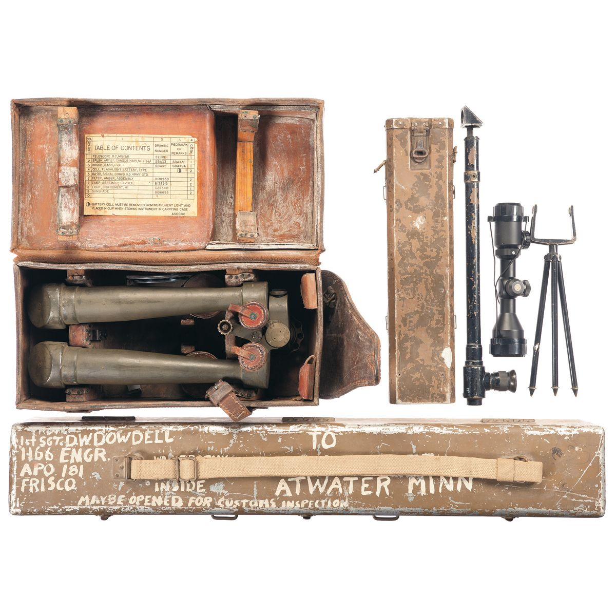 BEC Gold label 3-9x42 BDC scope (clear optics, broken lens cover), metal military style container (likely German) with shipping information painted on top of the lid, 5x10 trench type periscope (hazy optics, broken leather strap) with metal container (missing lid), cased M1915 periscope (hazy optics), spotting scope tripod.