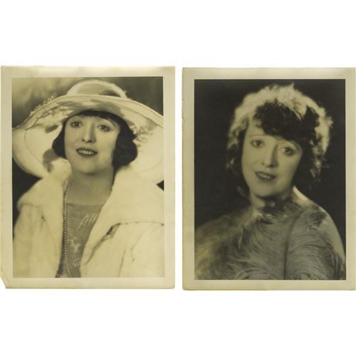 <B>Two Photos of Mabel Normand.</B></I> Here's Mabel Normand as she surely would have wanted her fans to remember her: pretty, wistful, and happily assured (or so it seems) in her star power. Picture one shows Mabel adorned in feathers; picture two presents her in bonnet, pearls, and a white mink coat. Both have the stamp of photographer Edwin Bower Hesser en verso. Both are in Excellent condition with a one-inch scratch near Mabel's left eye, visible only if held in a certain light, on the second photo.<BR><BR><b>Shipping:</b> Other (oversized items, group lo (<a target="_blank" href="http://www.heritageauctions.com/common/shipping.php">view shipping information</a>) <BR><BR><B>Important notice: