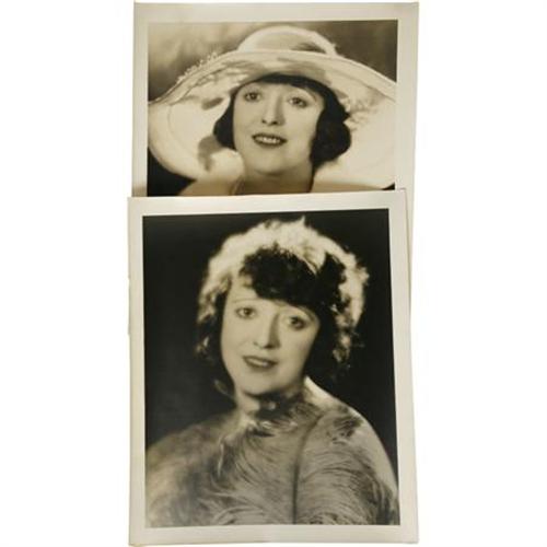 <B>Two Photos of Mabel Normand.</B></I> Here's Mabel Normand as she surely would have wanted her fans to remember her: pretty, wistful, and happily assured (or so it seems) in her star power. Picture one shows Mabel adorned in feathers; picture two presents her in bonnet, pearls, and a white mink coat. Both have the stamp of photographer Edwin Bower Hesser en verso. Both are in Excellent condition with a one-inch scratch near Mabel's left eye, visible only if held in a certain light, on the second photo.<BR><BR><b>Shipping:</b> Flat Material, Small (<a target="_blank" href="http://www.heritageauctions.com/common/shipping.php">view shipping information</a>)