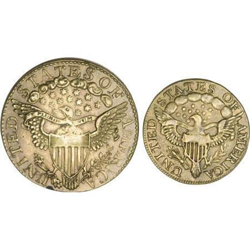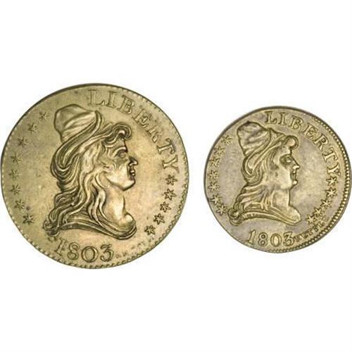 <B>Two-Piece Set of 1803-Dated Kettle Tokens.</B></I> Includes: <B>1803 quarter eagle Kettle token</B></I>, Pollock-8001, brass, plain edge, golden-brown overall with soft definition; and an <B>1803 half eagle Kettle token</B></I>, Pollock-8020, brass, plain edge, similar patina with mild rub. These British-origin tokens were meant to serve as gaming counters, according to Pollock.<BR><BR><b>Shipping:</b> Coins & Currency (<a target="_blank" href="http://www.heritageauctions.com/common/shipping.php">view shipping information</a>)