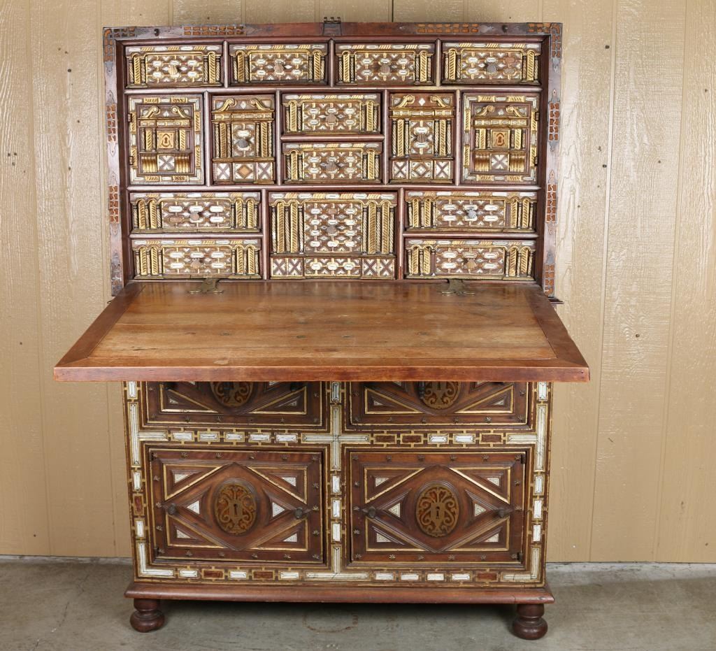 or writing desk with base from Spanish Colonial Era. Approx 1600-1800. Finely inlaid with rich gold leaf and many compartments for papers and orders. The Estate of Eric Value. Obtained from Mojico Gallo, owner of the Peruvian Gold Museum. Good condition for its age small repairs etc. Measures62X44X18
