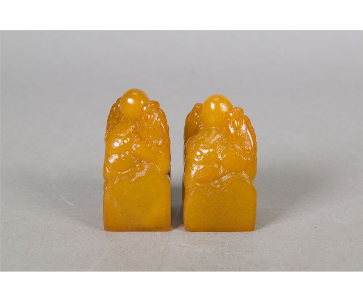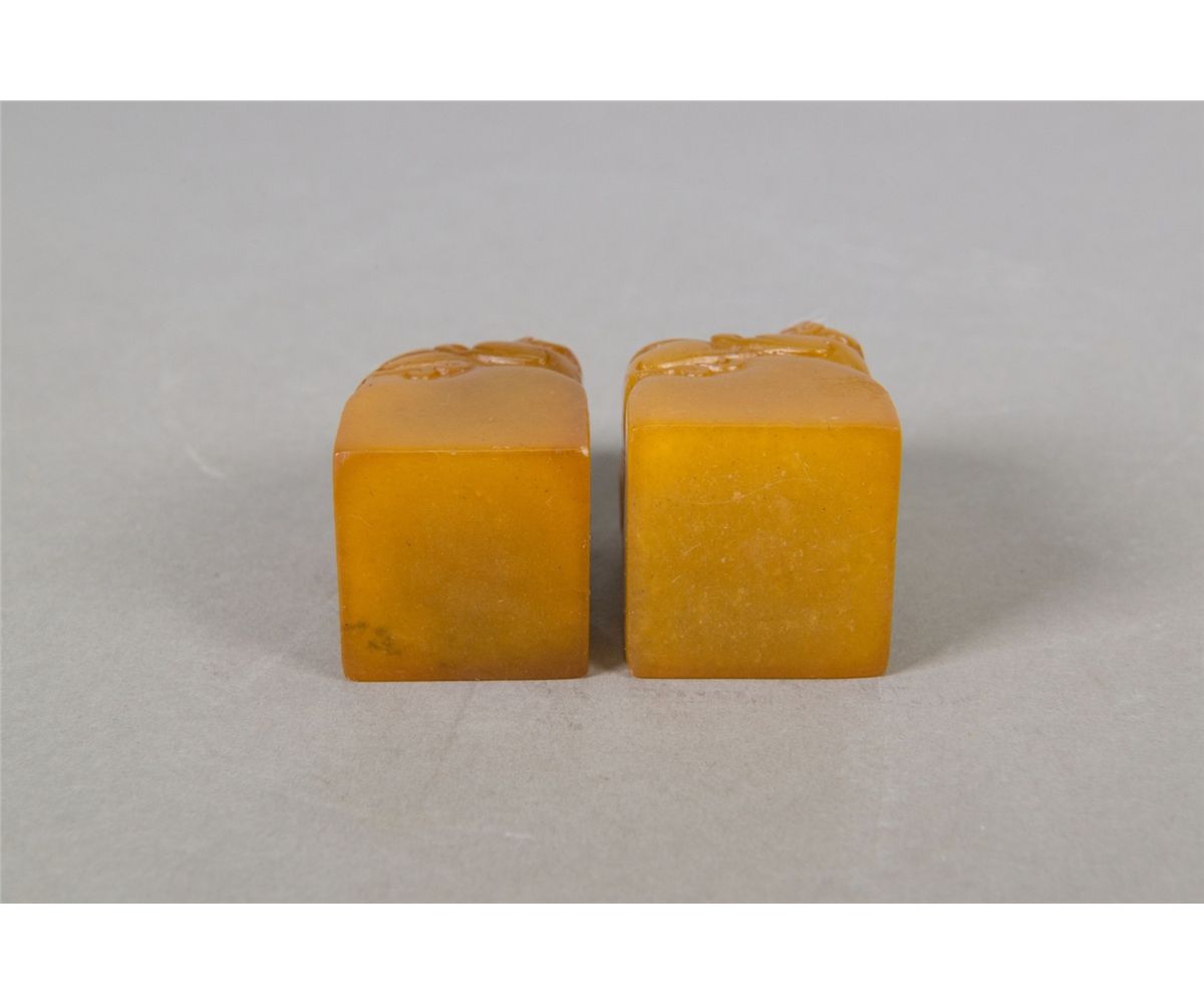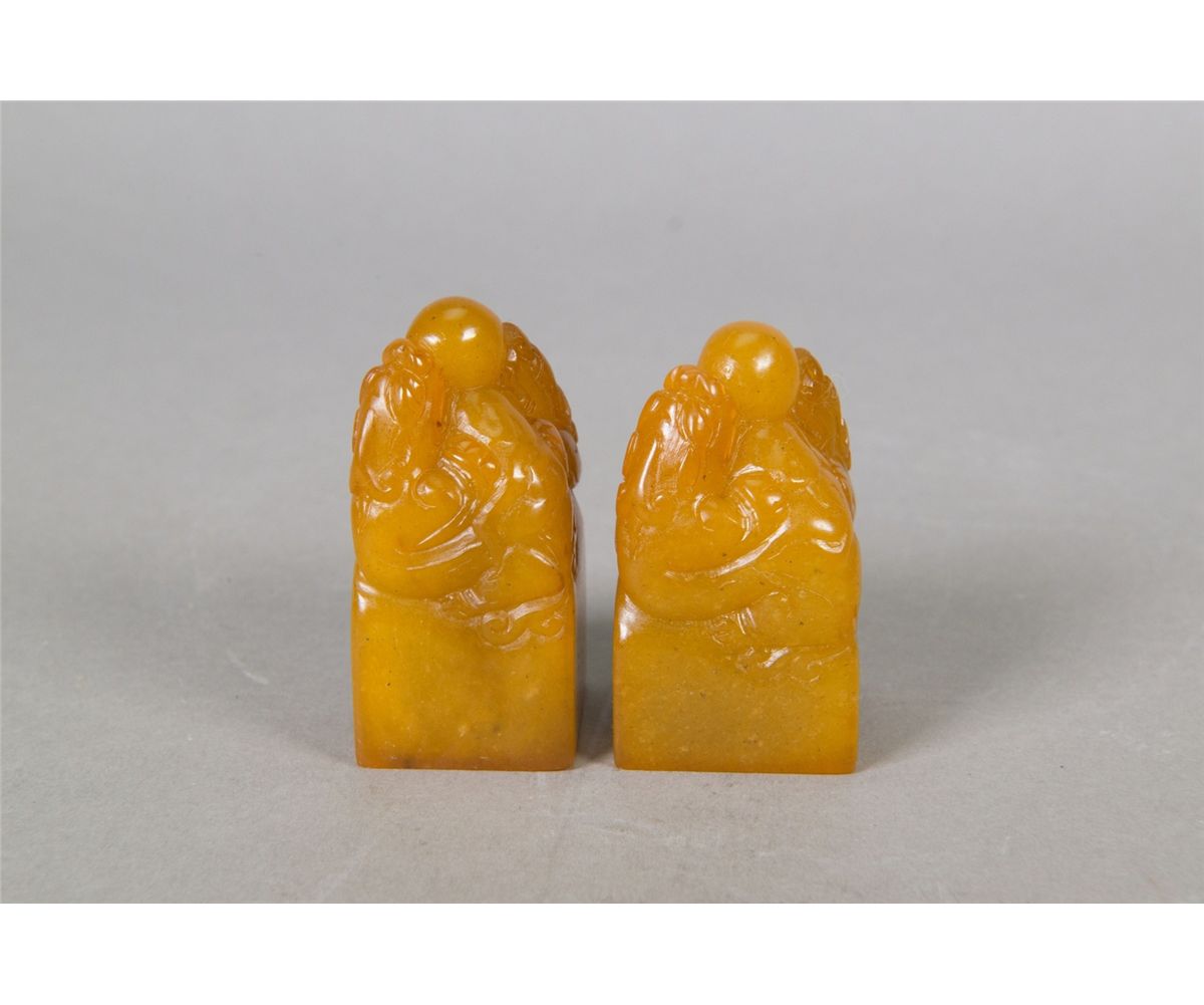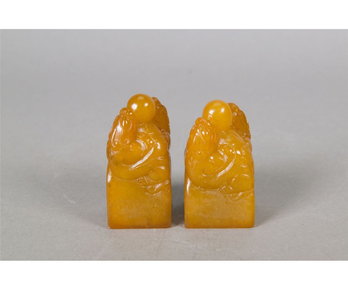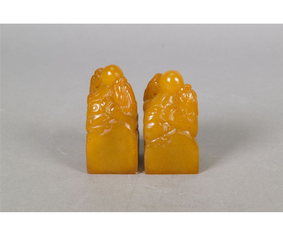 Two pieces of Chinese Shoushan stone dragon seal; of square shape; featuring carved dragons on top; of deep honey tone; H: 6.5 cm, W: 3 cm, 248 grams