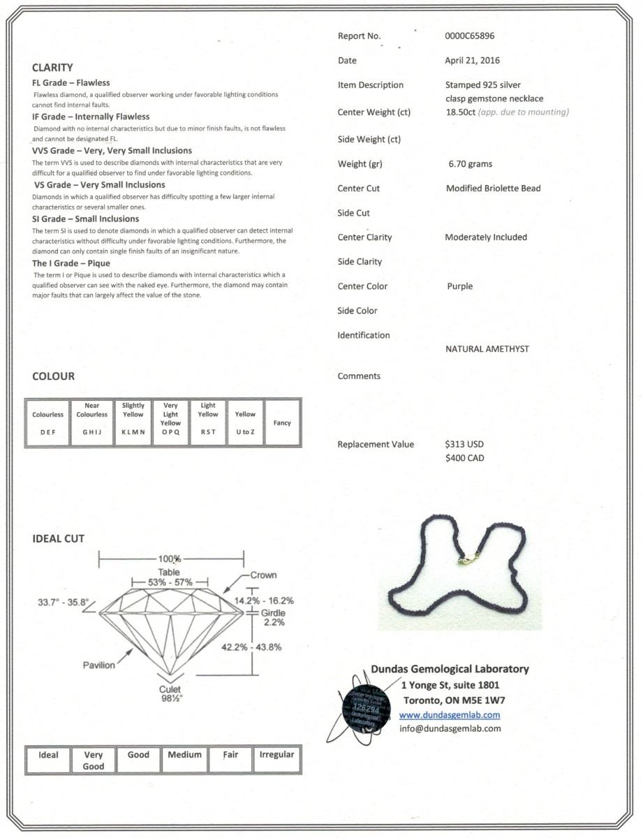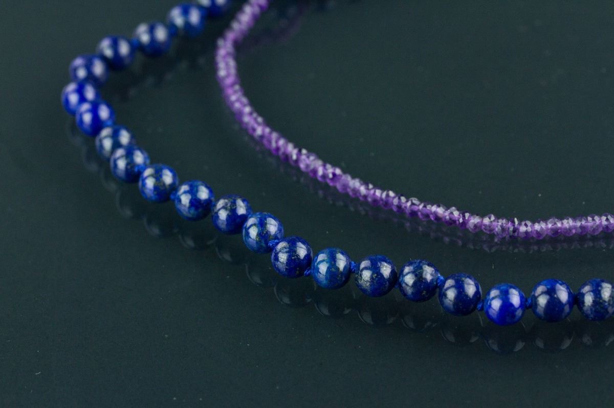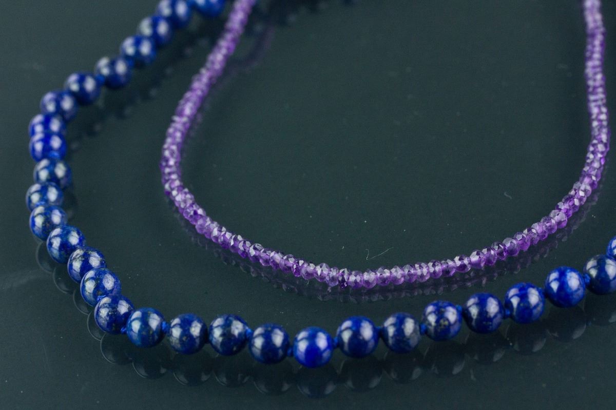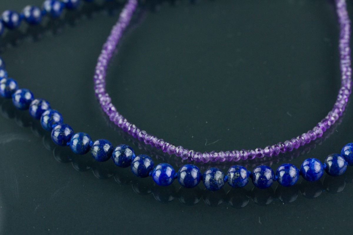 Two pieces of necklaces; one comprised of 18.50 ct purple amethyst briolette beads and stamped 925 clasp; the other one with rounded lapis lazil beads with magnetic clasp; the amethyst necklace certified replacement value $313; 1/2-D:14 cm, 9 grams