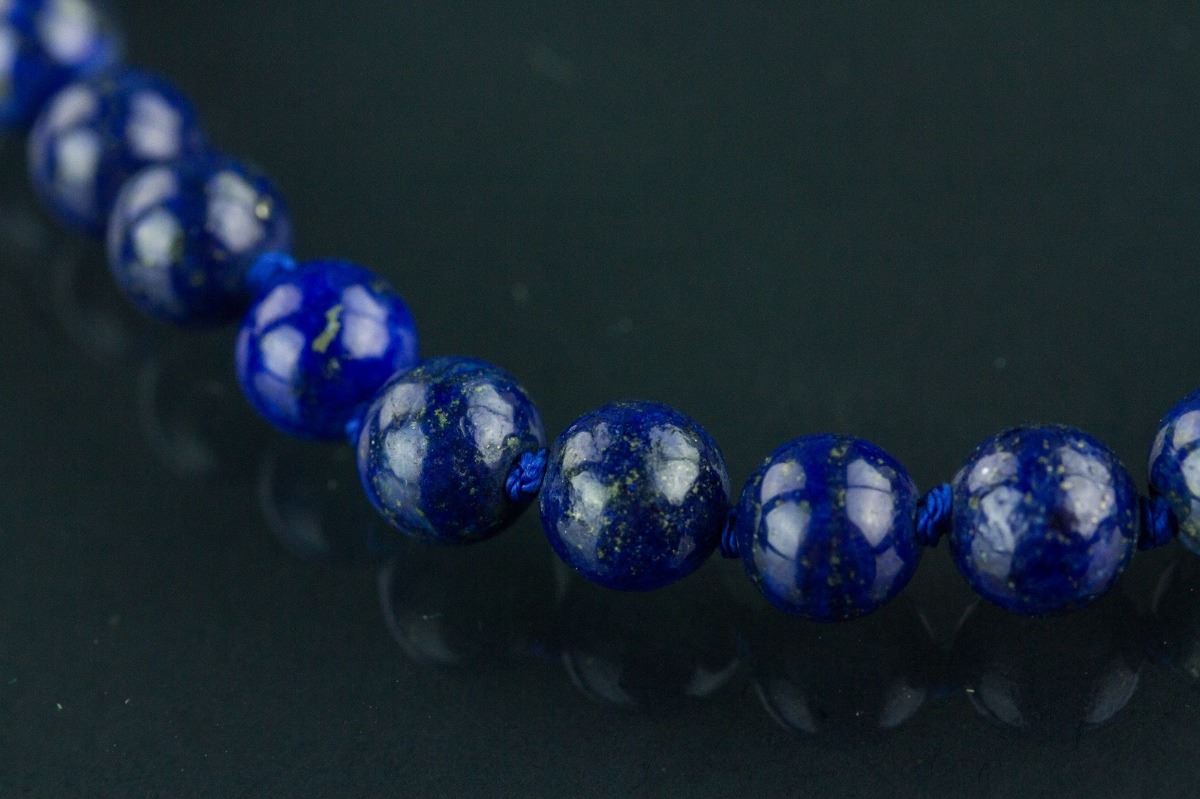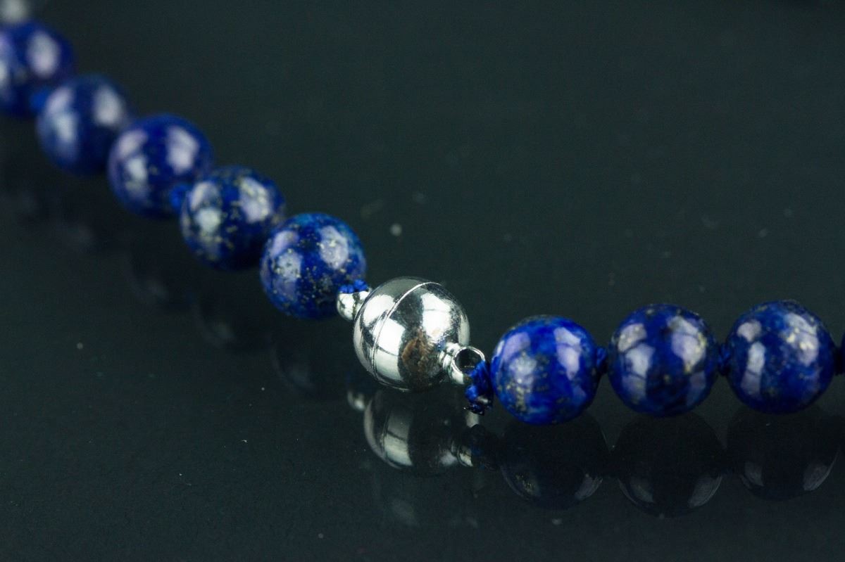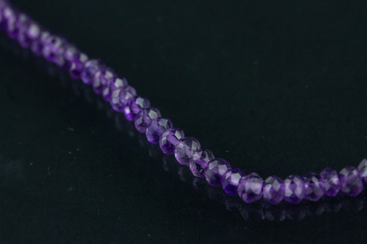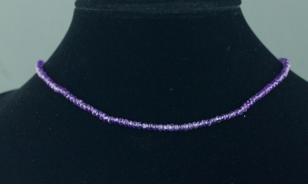 Two pieces of necklaces; one comprised of 18.50 ct purple amethyst briolette beads and stamped 925 clasp; the other one with rounded lapis lazil beads with magnetic clasp; the amethyst necklace certified replacement value $313; 1/2-D:14 cm, 9 grams