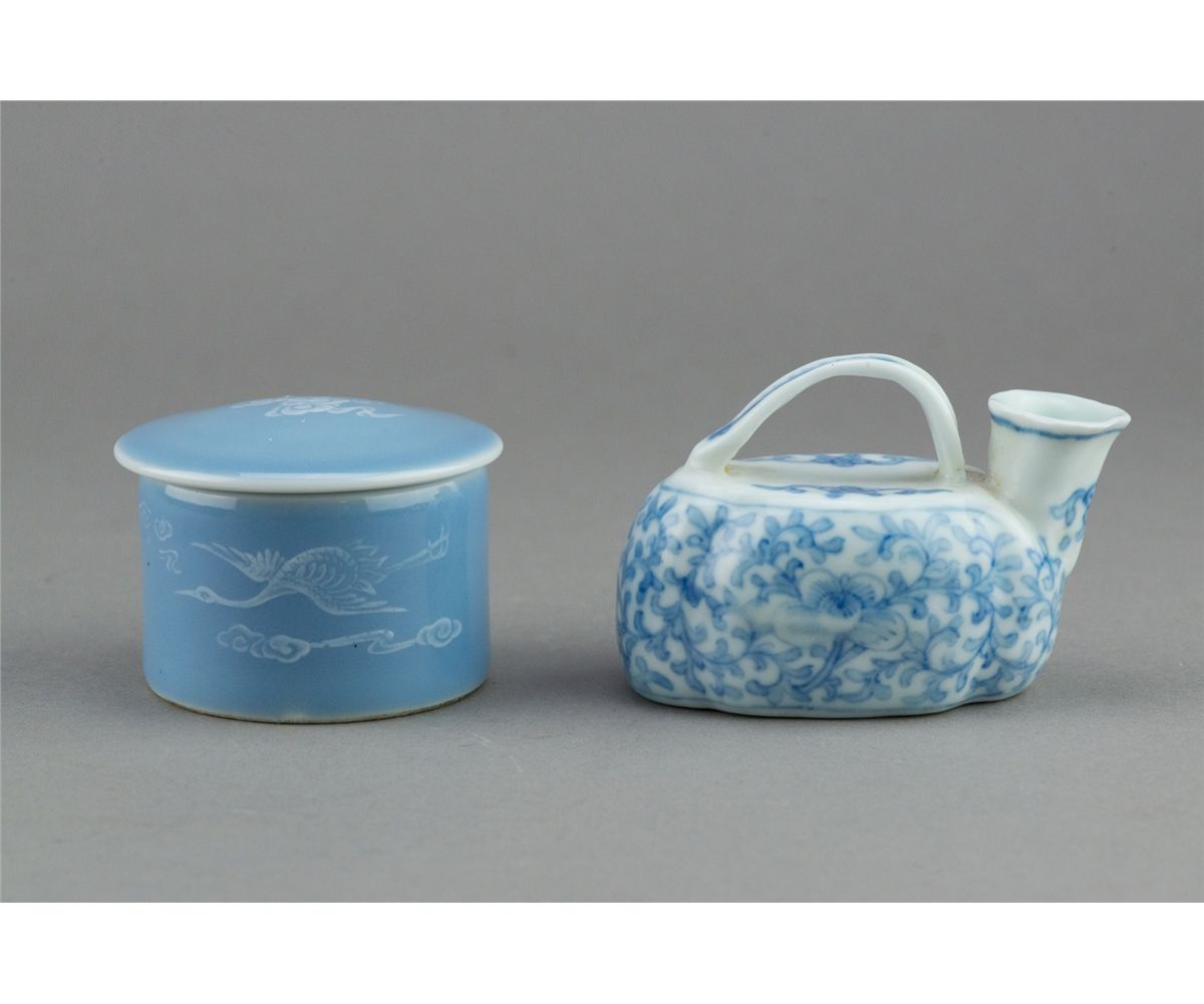Two pieces of Chinese porcelain water pots. Unknown mark on base; H: 5 cm, W: 7 cm, 85 grams; Provenance: Ma Collection Toronto
