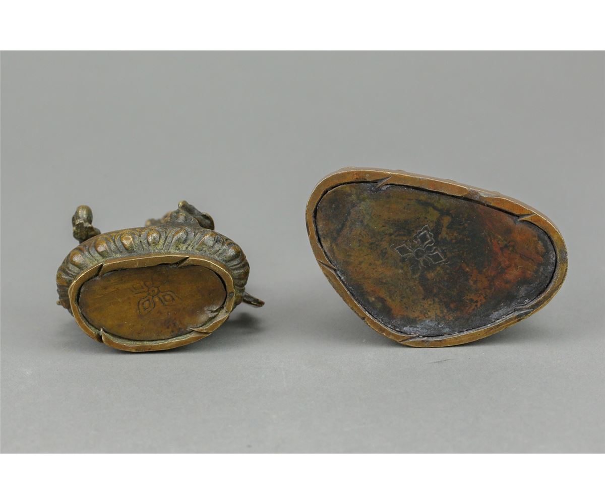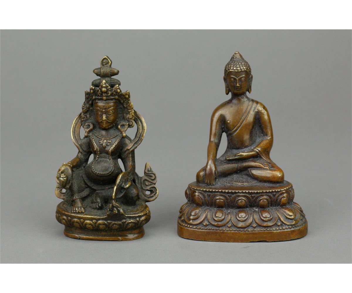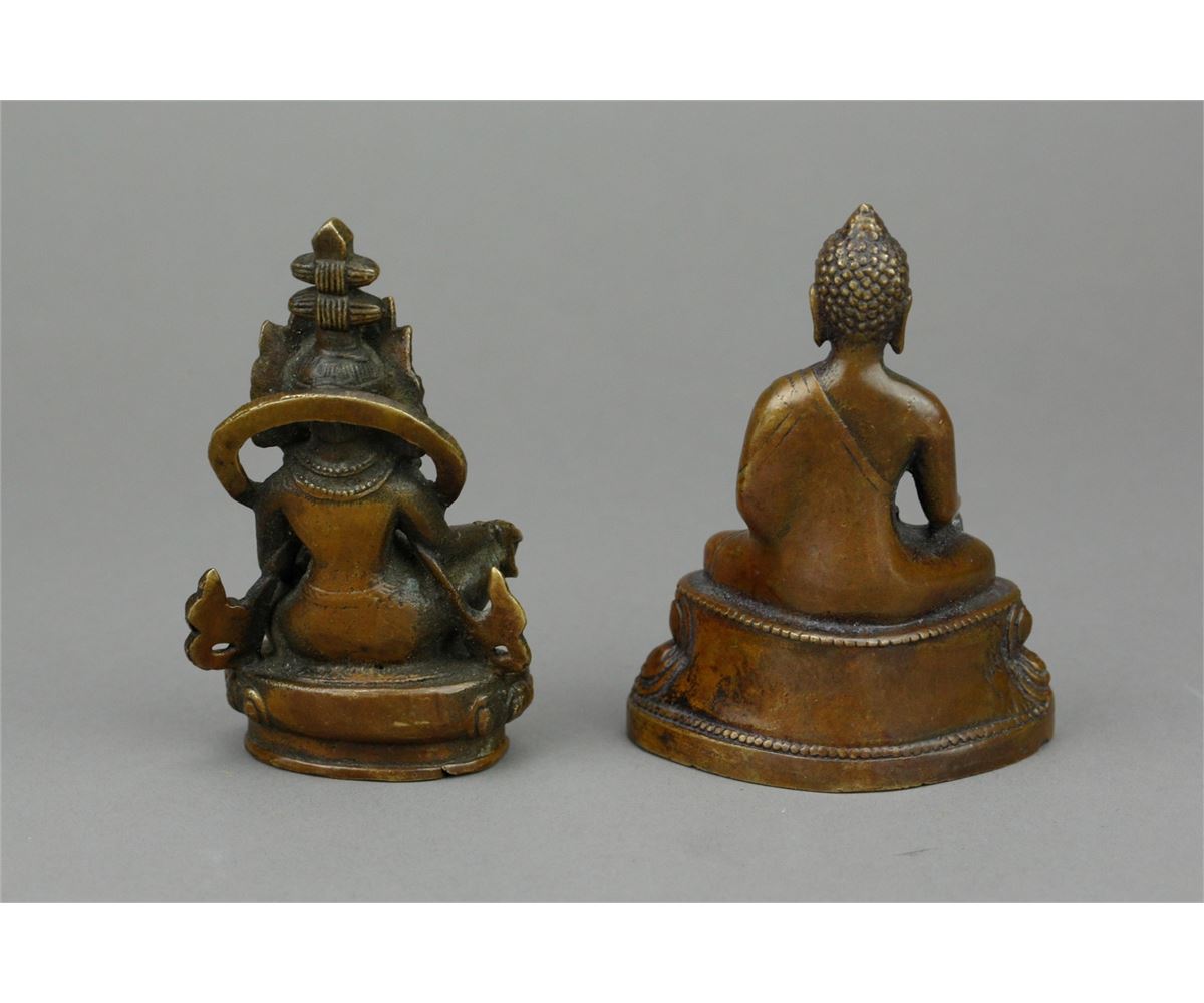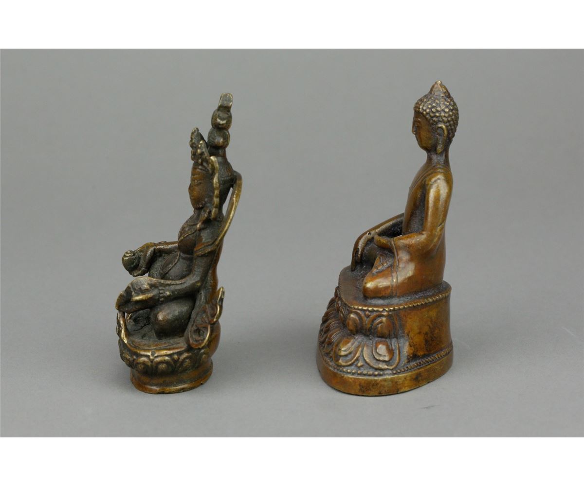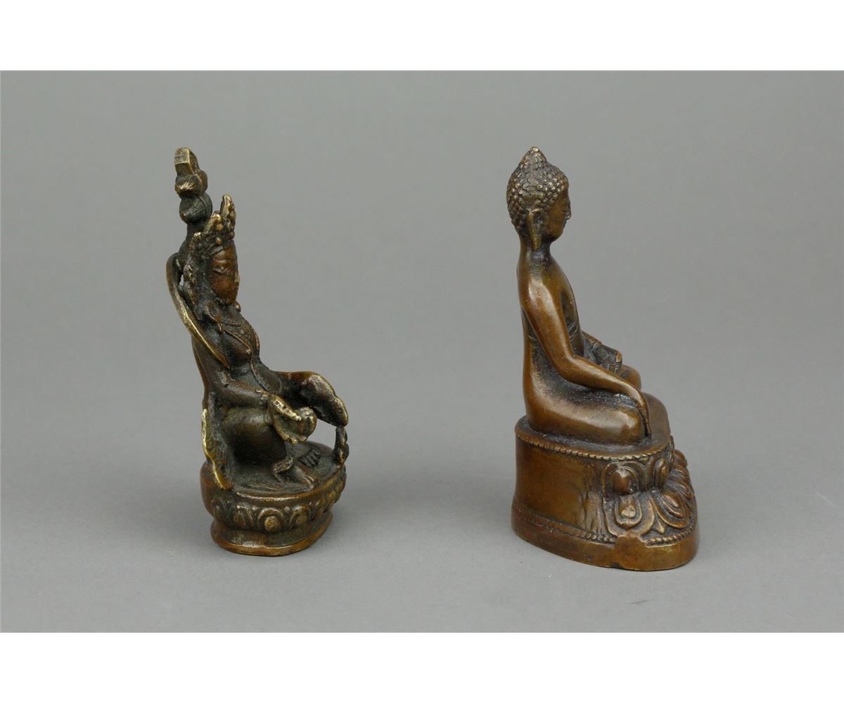 Two pieces of Chinese bronze small Buddha figures; featuring one Buddha wearing a crown and a cape; the other Buddha figure in Bhumisparsa Mudra on lotus plinth; vajra mark on base; H: 9 cm, W: 6.5 cm, 313 grams
