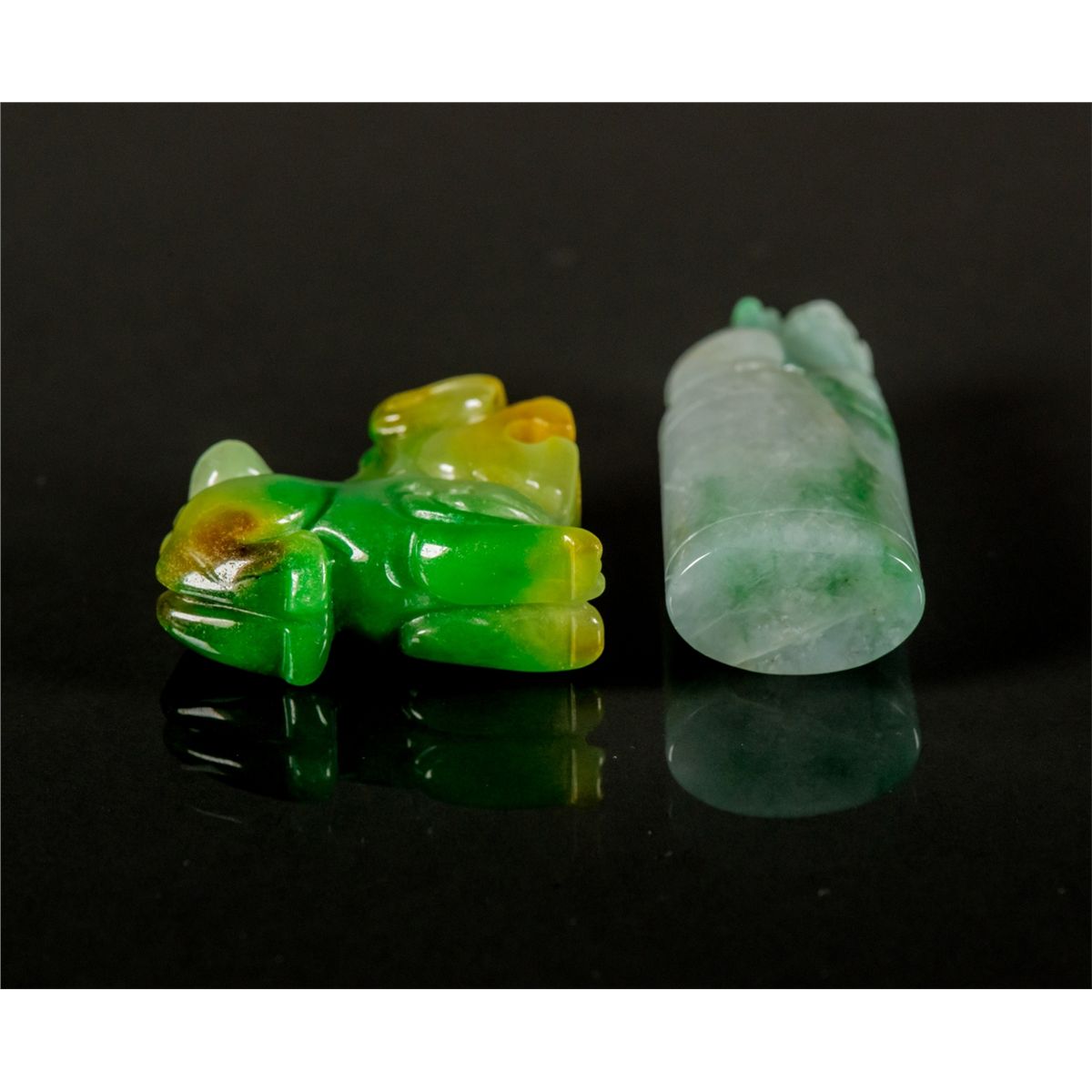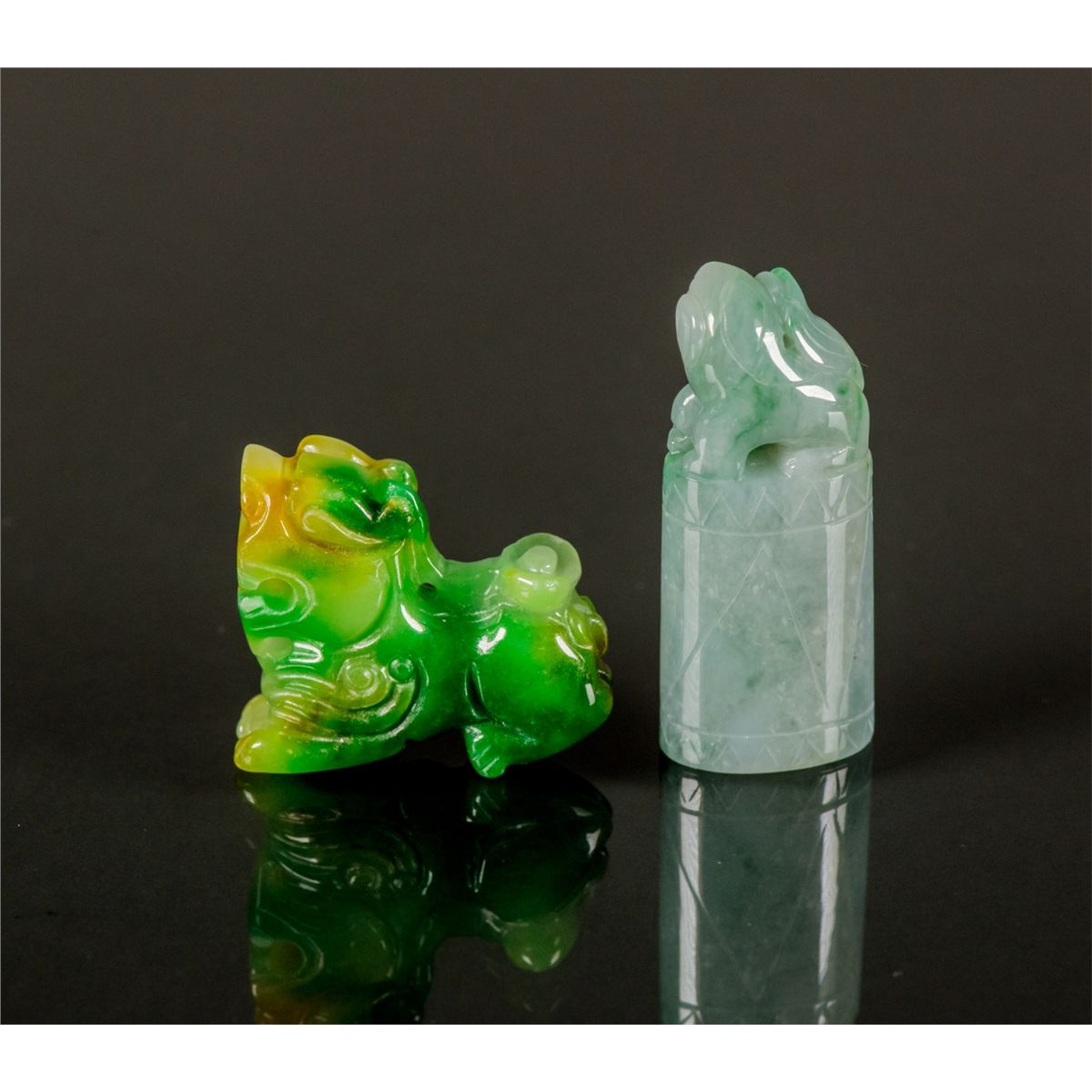 Two pieces of Chinese green jadeite items; featuring a carved Pixiu toggle and a Fu dog oval seal; of emerald green and apple green tone; H: 4.5 cm, W: 1.5 cm, 40 grams total; Density: 3.31