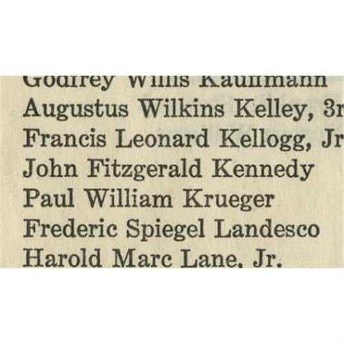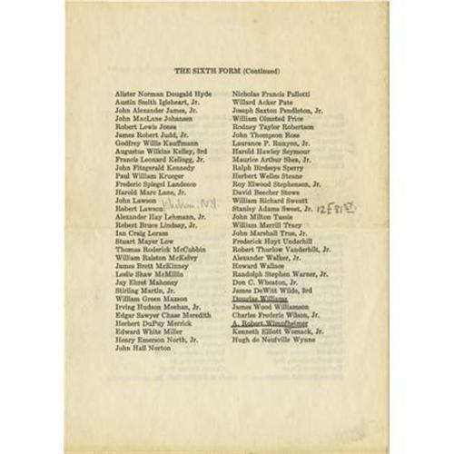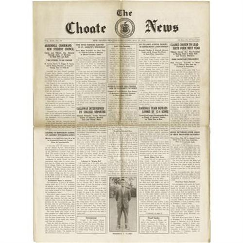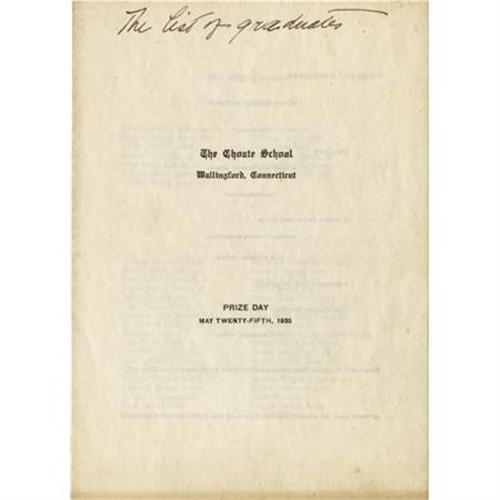 <B>Two Pieces of Ephemera From JFK's High School,</B></I> the first being a graduation program for the Choate School Class of 1935, four pages, Wallingford, Connecticut, May 25, 1935. The young John Fitzgerald Kennedy is listed inconspicuously among the graduates on the last page of this booklet. Light aging, very fine condition. The second item is an edition of <I>The Choate News,</B></I> six pages, folio, Wallingford, Connecticut, May 30, 1936. The paper, although issued after Kennedy left the school, still gives a good idea as to what the future president's high school environment must have been like. Folds, light aging and a few insignificant splits. Very good condition. Scarce memorabilia from Kennedy's early days before he received national attention for wartime heroics or political prominence. <BR><BR><b>Shipping:</b> Flat Material, Small (<a target="_blank" href="http://www.heritageauctions.com/common/shipping.php">view shipping information</a>)